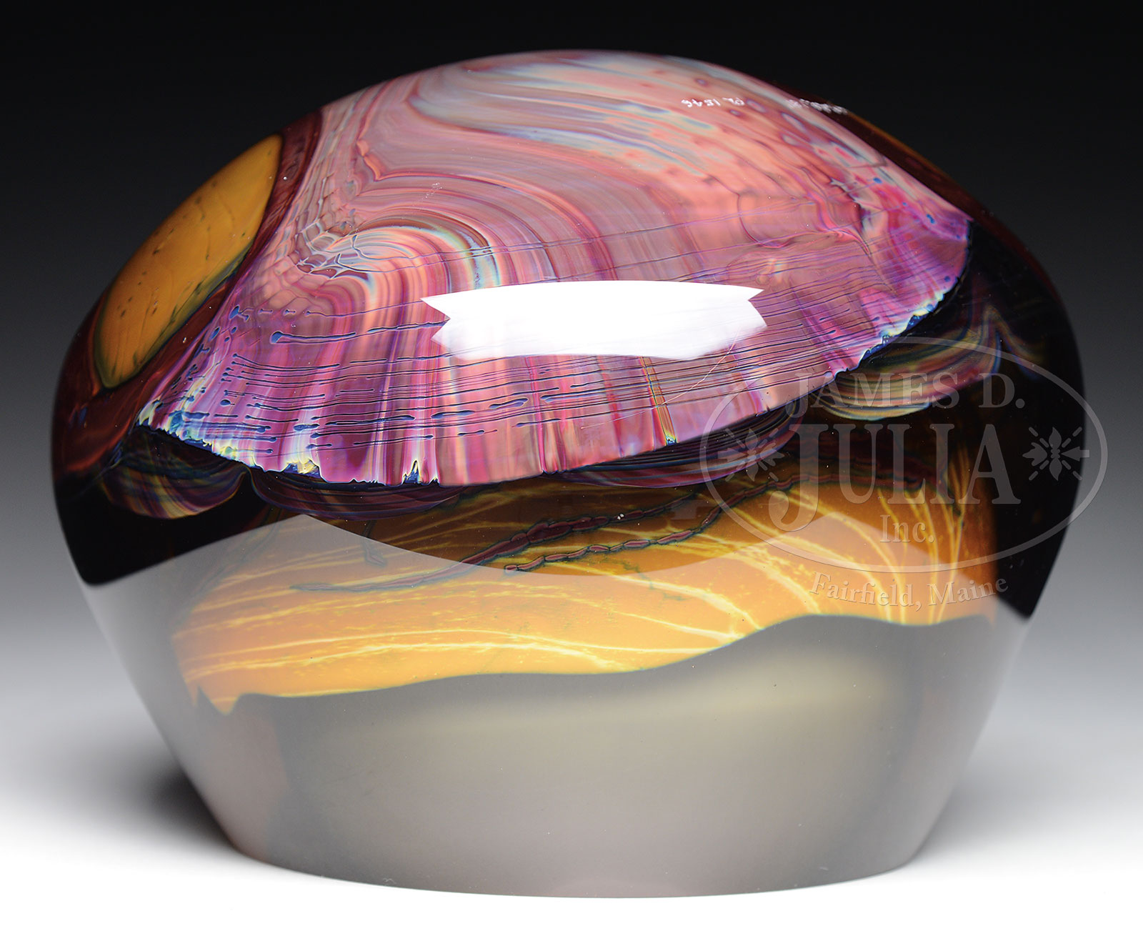 MICHAEL PAVLIK ART GLASS VASE.Art glass vase by glass artist Michael Pavlik has internal layers of swirled and striated colored glass in shades of red, blue, green, white and amber. All encased in a heavy layer of smokey gray glass. Signed on the rounded bottom of the vase “Michael Pavlik ’81 PL1546”. SIZE: 6-1/2″ t x 7″ dia. CONDITION: Some very minor scratches to the surface, otherwise very good to excellent. 51962-21 (2,000-3,000) – Lot 1736
