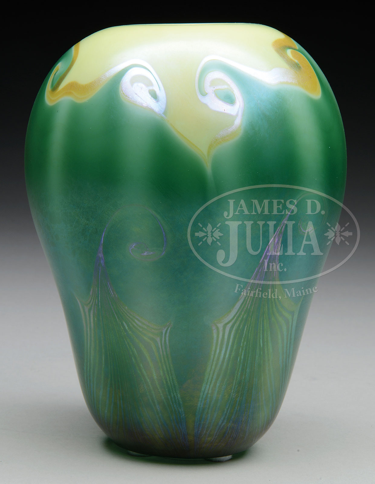 QUEZAL DECORATED VASE.Quezal vase has green hooked feather decoration rising from the foot with a bright gold iridescent border at the top. The vase is further decorated with a platinum iridescent hooked feather design on top of the solid green body. All set against a creamy yellow background. Signed in the polished button pontil “Quezal N.Y.”. SIZE: 7-1/2″ t. CONDITION: Very good to excellent. 52067-2 (2,500-4,500) – Lot 1754