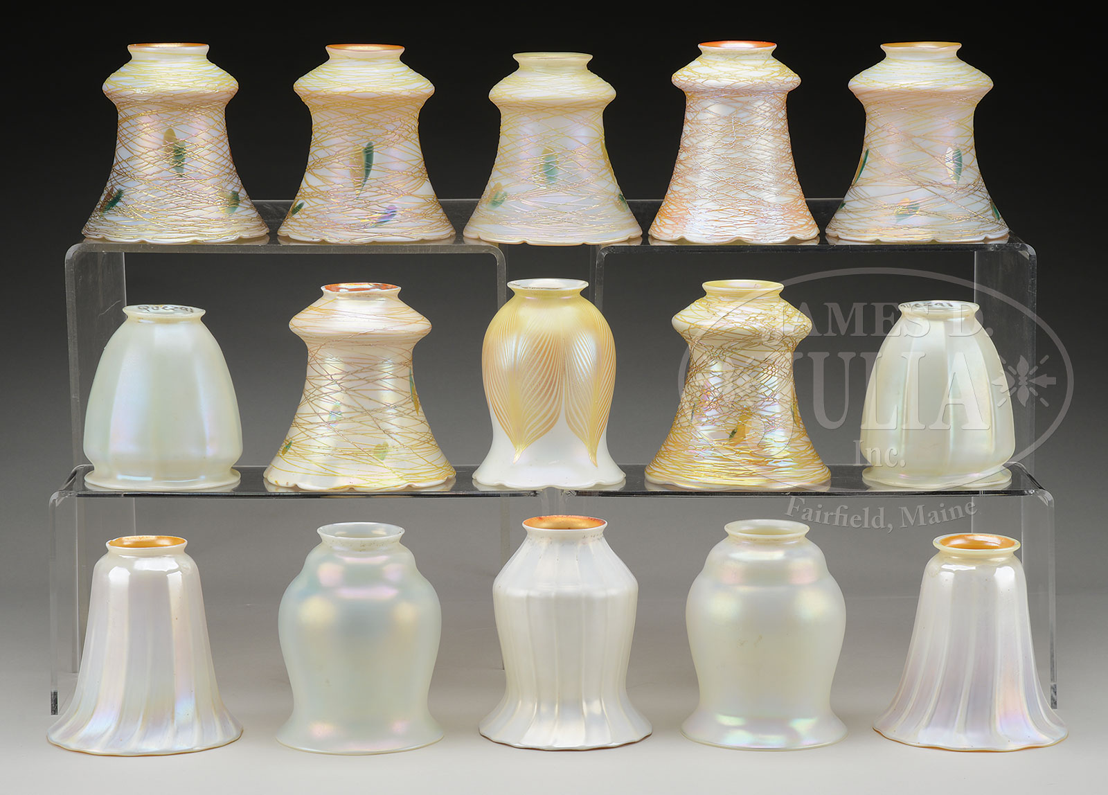 LOT OF FIFTEEN ART GLASS SHADES.Fifteen art glass shades including three pairs of Quezal shades with cream colored glassa pair of Quezal shades with vertically ribbed cream colored bodies which show nice opalescence when lit, signed in the fitter “Quezal. A pair of art glass shades with bulbous body in creamy opalescent glass, one shade signed in the fitter “Quezal”. A pair of art glass shades with creamy white, vertically ribbed bodies, the ribs swirl slightly at the lip, each have bright gold iridescent interiors, unsigned. A vertically ribbed art glass shade has white, lightly iridescent body with gold iridescent interior, signed in the fitter “Quezal”. Quezal shade has bright gold iridescent pulled feather design descending from the fitter against a creamy white, lightly iridescent body and signed in the fitter “Quezal”. As well as Lot includes six shades with green and gold heart design against a lightly iridescent background with gold iridescent applied random threading. Each shade has a gold iridescent interior. One shade is signed “Quezal” while the others are unsigned. While the six shades have the same leaf pattern they are not an identical match but could be used together. The lot also includes a single cream colored shade with applied gold iridescent random threading finished on the interior with bright gold iridescence. Unsigned. SIZE: Shades range from 5-1/4″ to 5-1/2″ t. CONDITION: Signed Quezal shade has some flakes to the top of the fitter, all others are very good to excellent. SIZE: Shades range from 4-1/2″ to 5-1/2″ t. CONDITION: One of the pair of ribbed shades with swirled bottom has chips to the fitter which would be concealed when shade is in place, all others are very good to excellent. 51901-1, 51901-2, (800-1,200) – Lot 1763