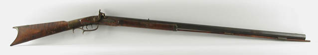 HALF-STOCK CONVERSION KENTUCKY RIFLE BY UNKNOWN MAKER. CAL. 40. Medium weight Kentucky with 36″ oct. bbl marked on the top flat “N.G.M.”. Half-stock, broken and repaired through the wrist and beside the triggers. Brass furniture, without patch box. The left side of the buttstock is crudely carved upside down “GM MARCH 16/177-“, lock plate is unmarked. CONDITION: Poor to fair. The bbl retains an even dark patina. Wood, some applied striping remains. Triggers and lock are functional. 4-45720 (400-600)