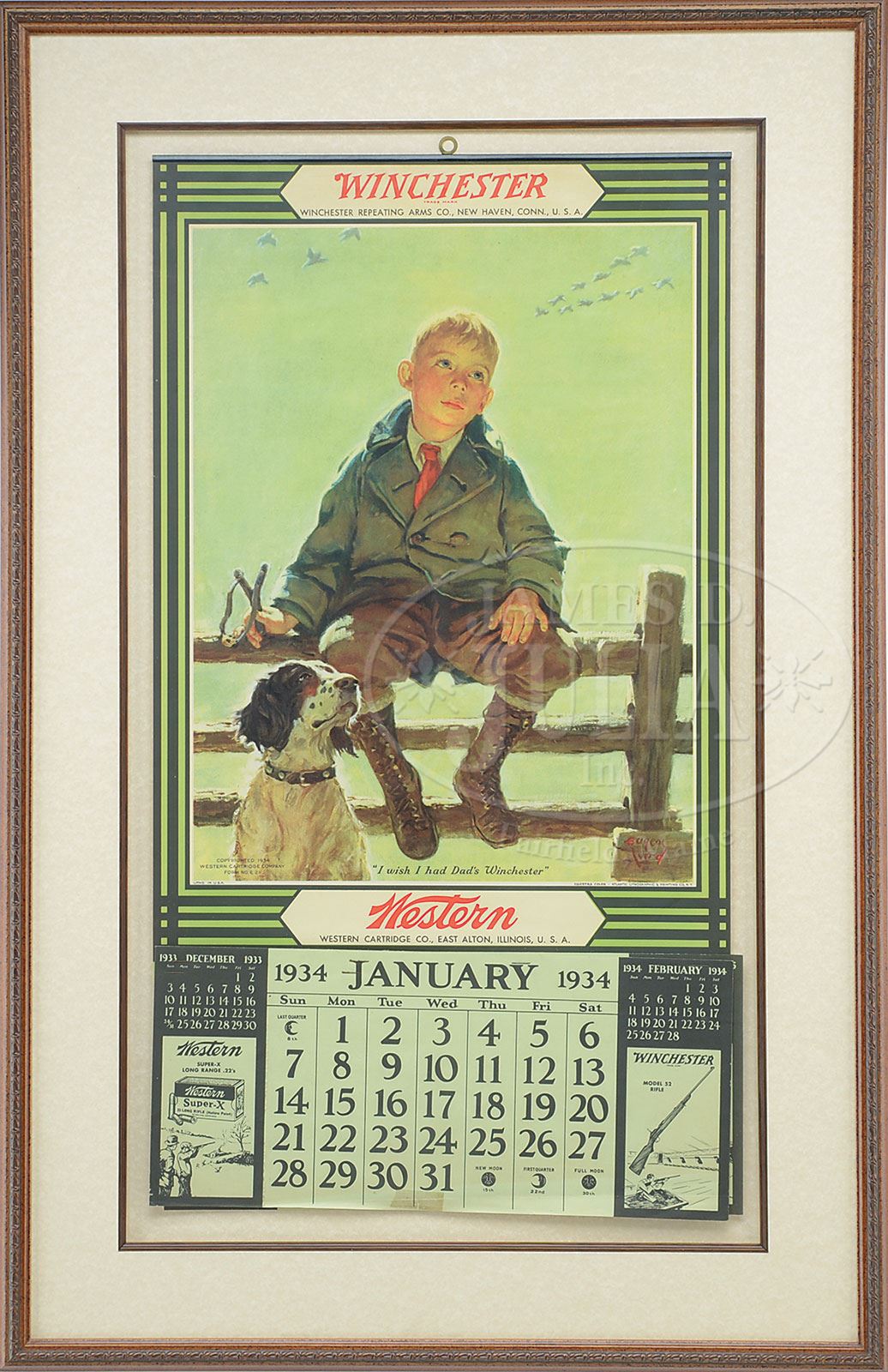 1934 WINCHESTER CALENDAR.Illustration by American artist Eugene Iverd of young lad and his bird dog, sitting atop a split rail fence holding a slingshot and watching flocks of geese fly south. Illustration captioned “I Wish I Had Dad’s Winchester”. Lithographed by Atlantic Lithographic & Printing Co., N.Y. for The Western Cartridge Co., East Alton, Illinois. Includes original top metal hanger and what appears to be complete date pad for 1934. SIZE: 15″ w x 27-3/4″ h. CONDITION: Near excellent. 1-14390 (2,000-3,000) – Lot 1783 Auction: Advertising, Toy & Doll Auction - Fall 2014 Please Note: All prices include the hammer price plus the buyer’s premium, which is paid by the buyer as part of the purchase price. The prices noted here after the auction are considered unofficial and do not become official until after the 46th day. |