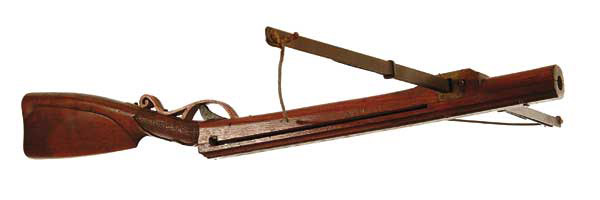 LATE EUROPEAN STONE BOW. 40″ overall with 40″ 4-leaf iron bow. Stock is decorated with crude carvings at the wrist, and inlaid pearl leaves on top. Bore is about 7/8″, indicating that 3/4″ stones would have been used. String is broken. CONDITION: Top part of the stock is separating at the front end and has been reinforced with brass screws, otherwise good. 4-47415 FS315 (500-1000)