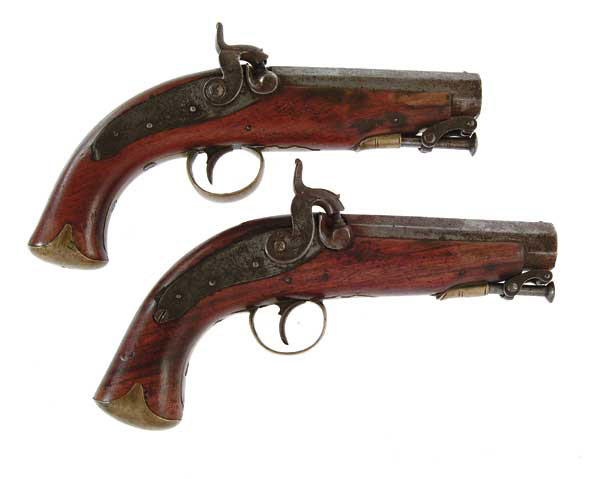 PAIR OF IRISH JAIL PISTOLS. NSN. Cal. 64., 4-3/4″ oct. bbls, marked “LEECH” on the lockplates with Birmingham proof marks on the bbls. Captive ramrods marked “SLIGO. GAOL.No1” on one and “SLIGO. GAOL . No3” on the other. Both pistols have the dbl broad arrow disposal marks. CONDITION: Gray patina with light to moderate pitting. Mellow patina to the brass. The head of one screw is broken on “No3” and it also has chips missing around the butt cap and vise marks on the stock. They have slightly different hammers. 4-47063 X6 (1,500-2,500)