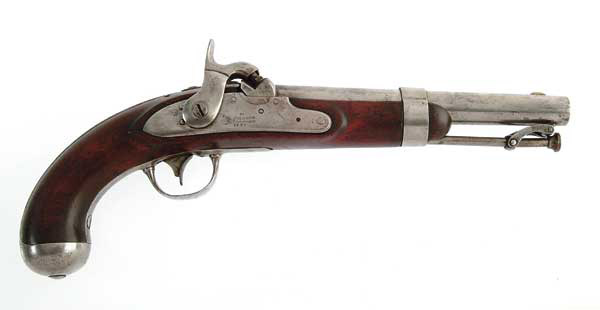 CONVERTED JOHNSON M1836 MARTIAL PISTOL. NSN. Cal. .54, 8-1/2″ bbl. Dated “1836” on the lock. CONDITION: All surfaces have been cleaned and polished with some light pitting remaining on the metal. Hammer screw has been replaced. Outlines of the inspector marks remain on the stock. Action is good. FS772 4-47597 (500-1,000)