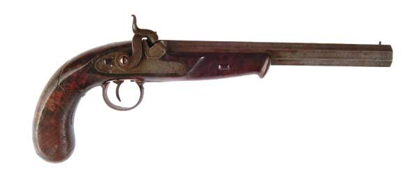 LARGE SOUTHERN TARGET PISTOL. NSN. Cal. .40. 9-7/8″ oct. bbl. Marked “J M Happoldt/Charleston” on the lockplate. CONDITION: Bbl has been cleaned but light to moderate pitting remains. Stock has a light crack at the front of the lockplate. Set trigger works. Hammer spring is soft. 4-47286 FS641 (1,000-1,500)