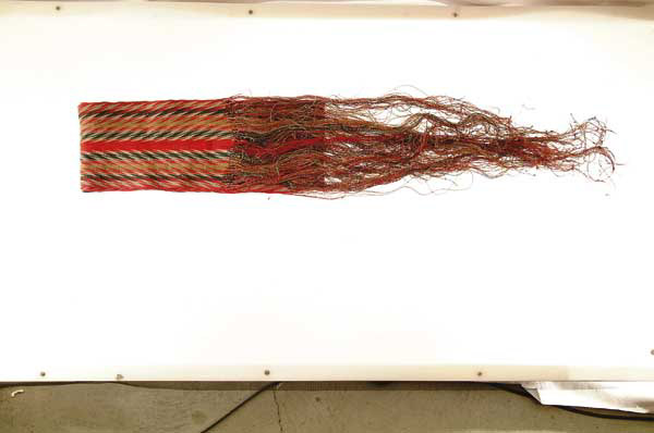 ASSOMPTION WOVEN SASH. Fine sash 6′ l x about 7-1/2″ w with about 30″ fringe on each end. Is made in two strips joined together, of red, blue, green, yellow, light blue and white lightning bolt colors. CONDITION: Some minor mothing, but the colors remain vivid and bright. A scarce early sash. 4-47043 JR529 (800-1,200)