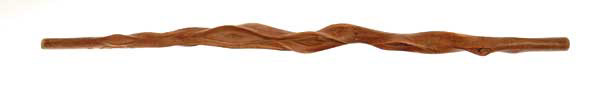 UNUSUAL CARVED WILLOW CANE. 45-1/4″ l with strange growth openings down the full length and is also carved down its length with a variety of animals including camel, elk, pig, chicken, bear, cow, horse, goat, Texas longhorn with other features such as hearts, a rifle, a revolver and several stars. About the center, in raised carving are the words “ARM GARD”. Toward the handle end in raised carving are the words “FERGUS CO. MONTANA” with backwards N’s. Also on the handle end are the words “HILL RANCH” and further around the cane is carved “JANUARY 1 1900”. Further down the cane is carved “HART’S”. A wonderful and unusual Western cane. 4-47051 JR524 (750-1,000)