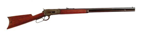WINCHESTER SPECIAL ORDER MODEL 1886 LEVER ACTION RIFLE. Cal. 40-82. Standard grade rifle with 28″ oct. bbl, full magazine, uncheckered wood, straight stock and crescent steel buttplate. Accompanied by a Cody Firearms Museum yellow sheet identifying this rifle with the 28″ bbl and indicating it was shipped with a Rocky Mountain front sight, which is now missing, on 4/6/1889. SN 27997. CONDITION: Very good, plus. Bbl retains about 90% dull original blue. Magazine tube is a plum-brown patina. Receiver retains 75-80% strong case colors, brighter on the left side. Lever and hammer 25-30% dark case colors. Stock is missing a chip at the receiver, otherwise the wood is sound and retains 75-80% dull finish. Top tang screws are battered. Bright shiny bore. 4-46520 JR15 (5,000-7,000)