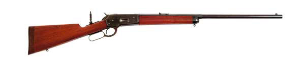 *WINCHESTER MODEL 1886 SPECIAL ORDER LEVER ACTION RIFLE. Cal. 50 Express. Scarce rifle in a scarce caliber with 26″ oct. to round bbl, button magazine, uncheckered wood with straight stock that has been extended. The foreend cap and buttstock are mounted with sling eyes. Bbl is mounted with a scarce three-position front sight and a 3-leaf platinum line express sight and the top tang has a Lyman peep sight. Accompanied by a Cody Firearms Museum yellow sheet identifying this rifle as described above and having been shipped with a shotgun butt on 6/18/1902. SN 125574. CONDITION: As noted, very good, plus. The bbl retains 95-96% strong original blue, foreend cap 97-98% original blue and the receiver about 85% original blue, thinner on the left side. Wood is sound and retains 95% plus, original varnish except on the 3/4″ butt extension, which is a different color. Lever and hammer retain about 90% case colors turned silver on the edge of the lever. Brilliant shiny bore. 4-46604 JR17 (8,000-12,000)