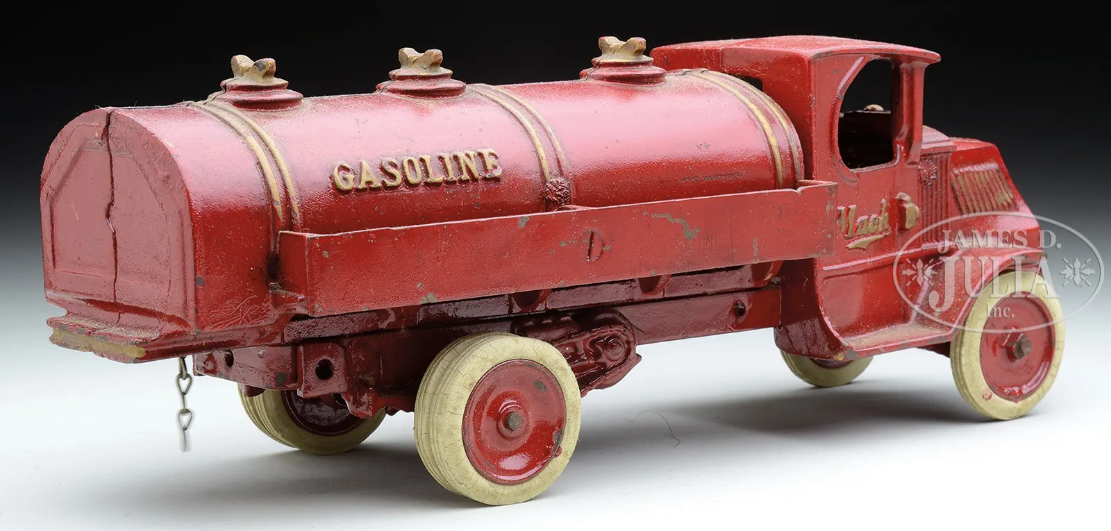 13″ ARCADE MACK GAS TRUCK.An exceptional all original example in very fine plus condition. Rubber tires are intact over the cast hubs along with an arcade decal and the original “spark” chain hanging on the underside of rear carriage. Enameled in a dark red with gilt highlighting and a nickel plated driver. Paint, with slight alligatoring, shows typical minimal wear to edges, top of roof and tank. Overall a great example with years of shelf dust and a light cleaning would bring back the shine and luster to the painted finish. SIZE: 13″ l. PROVENANCE: From the Laurence Hapgood Estate. CONDITION: As stated above, no damage, repairs, cracks to iron castings. 49003-6 (800-1,200) – Lot 2000 Auction: Advertising, Toy & Doll - Spring 2015 Please Note: All prices include the hammer price plus the buyer’s premium, which is paid by the buyer as part of the purchase price. The prices noted here after the auction are considered unofficial and do not become official until after the 46th day. |