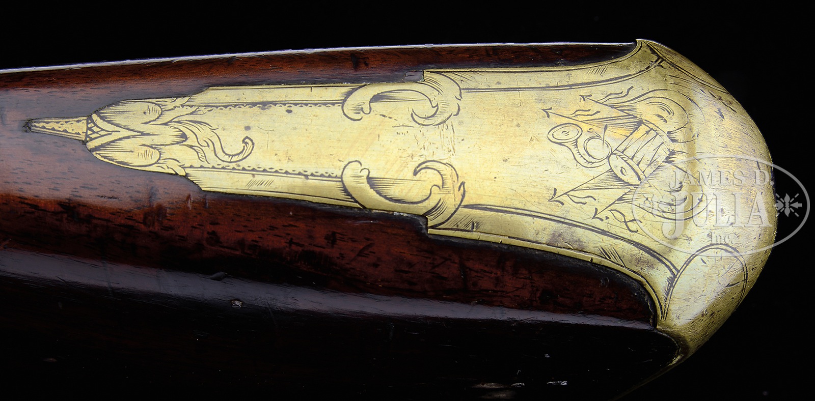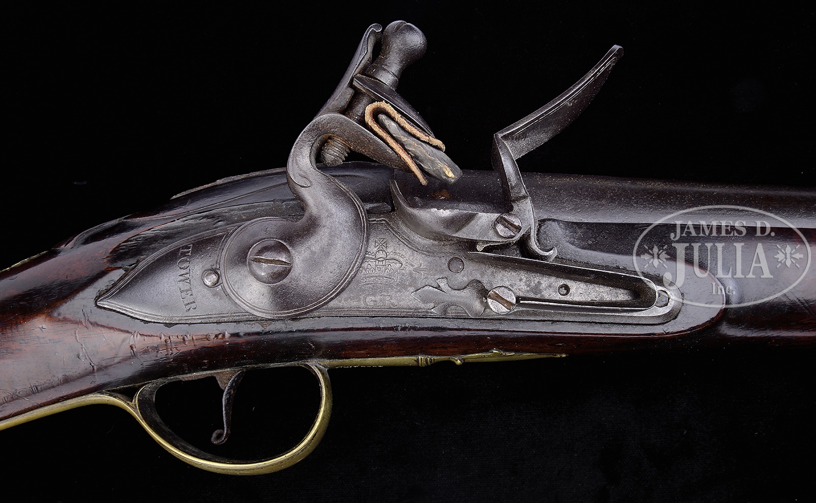 FINE REVOLUTIONARY WAR ERA OFFICERS FOWLER.This is a nice example of a 7′ long commercial officers fusil or fowler, circa 1780. The first model style Brown Bess lock exhibits good markings. Brass trigger guard, buttplate, thumbplate and lock escutcheon are engraved. Stock exhibits raised carving rear of barrel tang in shape of beavertail terminating into stylized clam shell. PROVENANCE: Estate of Siro R. Toffolon, of Old Lyme, CT. CONDITION: Gun appears original and complete, though front ramrod pipe is replaced and stock is broken and repaired forward of rear ramrod thimble. Grain appears to match, though barrel was not removed to be sure. There is inset 1″ wood repair on right side, about 8″ forward of lock and large chip of wood missing above lockplate. First model Brown Bess-style lock exhibits broad arrow proof, forward of crown and GR cypher. Brass mounts are well fit with discernible engraving, including small panoply of arms on top of buttplate. Commercial proofs are found on breech of 66″ 75 caliber barrel. Brass tipped iron ramrod is later replacement. Lock functions. 49597-11 (4,000-6,000) – Lot 2000