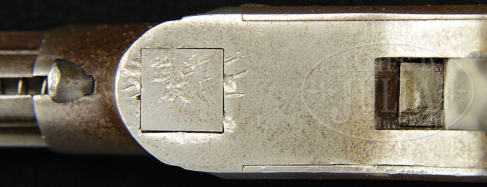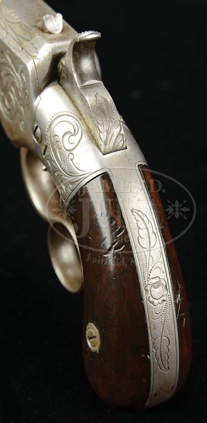 RARE ENGRAVED SMITH & WESSON NO 1 SMALL FRAME LEVER ACTION PISTOL.SN 349. Cal. 31. This gun exhibits a 4-3/16″ bbl, which is properly marked “CAST-STEEL”, “SMITH & WESSON, NORWICH, CT” and “PATENT/FEB. 14, 1854” over the top, left and right flats of bbl lug. SN 349 is found on several parts including lever, trigger, frame and both stocks internally. Gun appears all orig and no further disassembly was effected to check for additional matching numbers. Frame and backstrap are florally engraved typical of other guns in this series. Gun retains none of its orig finish though metal exhibits a smooth gray surface overall. These scarce guns based, on Smith & Wesson’s patents, were made in 1854 & 1855 in both large and small frame varieties of which about 1,200 guns were produced total. Norm Flayderman states, in his iconic “Guide To American Arms”, “An important pioneer arm to both Smith & Wesson and Winchester collectors, the quite limited production total makes these pistols highly prized and difficult to obtain”. PROVENANCE: Bobby Smith. Collection of John Montague. CONDITION: This gun overall is in good to very good condition being overall gray with scattered areas of staining and pitting. Spring loaded guide functions well as does rest of gun mechanically. Stocks are fine and solid retaining about 70-80% of their varnish finish with several scattered small dings and dents and wear at high areas. There are numerous small dings and dents on bottom of frame at moving breech as can be seen in photos. Good discernible rifling in bore with pitting. Accompanying casing is for display purposes only but fits gun quite nicely as can be seen in photos. Case has a functional key. 4-54367 JS207 (8,000-12,000) – Lot 2000a