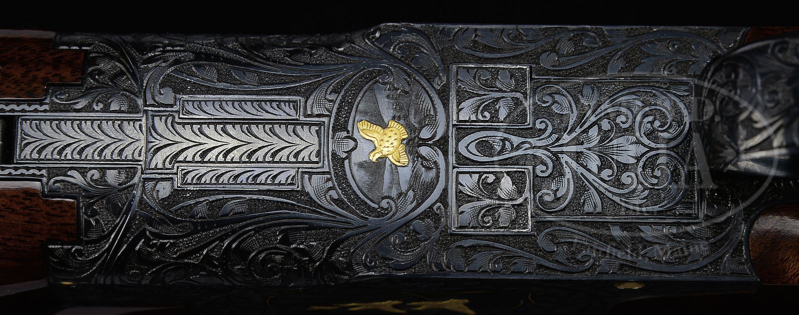 *20 GAUGE BROWNING MIDAS GRADE ENGRAVED BY LAMBERT AND SCHURGER WITH CASE.SN 5911V74. Cal. 20 GA 3” Chambers. 26-3/8” Bbls are marked for IC and Mod. Bbls have narrow, raised, matted, ventilated rib with red Bradley bead and are marked with Browning Morgan Utah and Montreal addresses, and “MADE IN BELGIUM” on left, “BROWNING SUPERPOSED”, steel, chamber and “BROWNING PATENTS” on right. There are 2” triangles of well-cut relief open shaded scroll at breech ends. Blued standard Browning OU action with gold-plated sgl selective trigger, is engraved in typical Midas style, as designed by Louis Vrancken, consisting of near full coverage of large open shaded scroll with acanthus highlights surrounding game scenes with semi-relief gold inlaid subjects. These scenes are within gold inlaid ovoid borders with flourishes at bottom. Three pheasant fly into open meadow on left side of action, and a trio of ducks take wing from marsh on right. A quail flies across bottom of action. Trigger guard, with matching scroll, has vacant shield on bow. Engravers signatures, L Lambert is on bottom left, and J Schurger on bottom right. Nicely figured and streaked claro walnut long tang flat knob buttstock measures 14-3/8” over Browning composition buttplate. Modified point pattern checkering extends over grip and has flourishes into butt. Matching forend is of 1-pc field type. Bore diameter: top -.618, bottom -.620. Bore restrictions: top -.012 (lt mod), bottom -.006 (IC). Drop at heel: 2-1/8″, drop at comb: 1-5/16″. Weight: 5 lbs 13 oz. LOP: 14-3/8″. Tan vinyl Browning case is lined in off white faux fur and contains two keys. PROVENANCE: Rod Fuller Estate Collection. CONDITION: Excellent, near new, with a hint of sharp edge wear, with only the slightest of handling marks on wood and metal. Gold is excellent. Mechanically crisp. Case is excellent, interior slightly soiled. A fine lightweight Browning. 49114-44 MGM228 (8,500-12,500) – Lot 2001