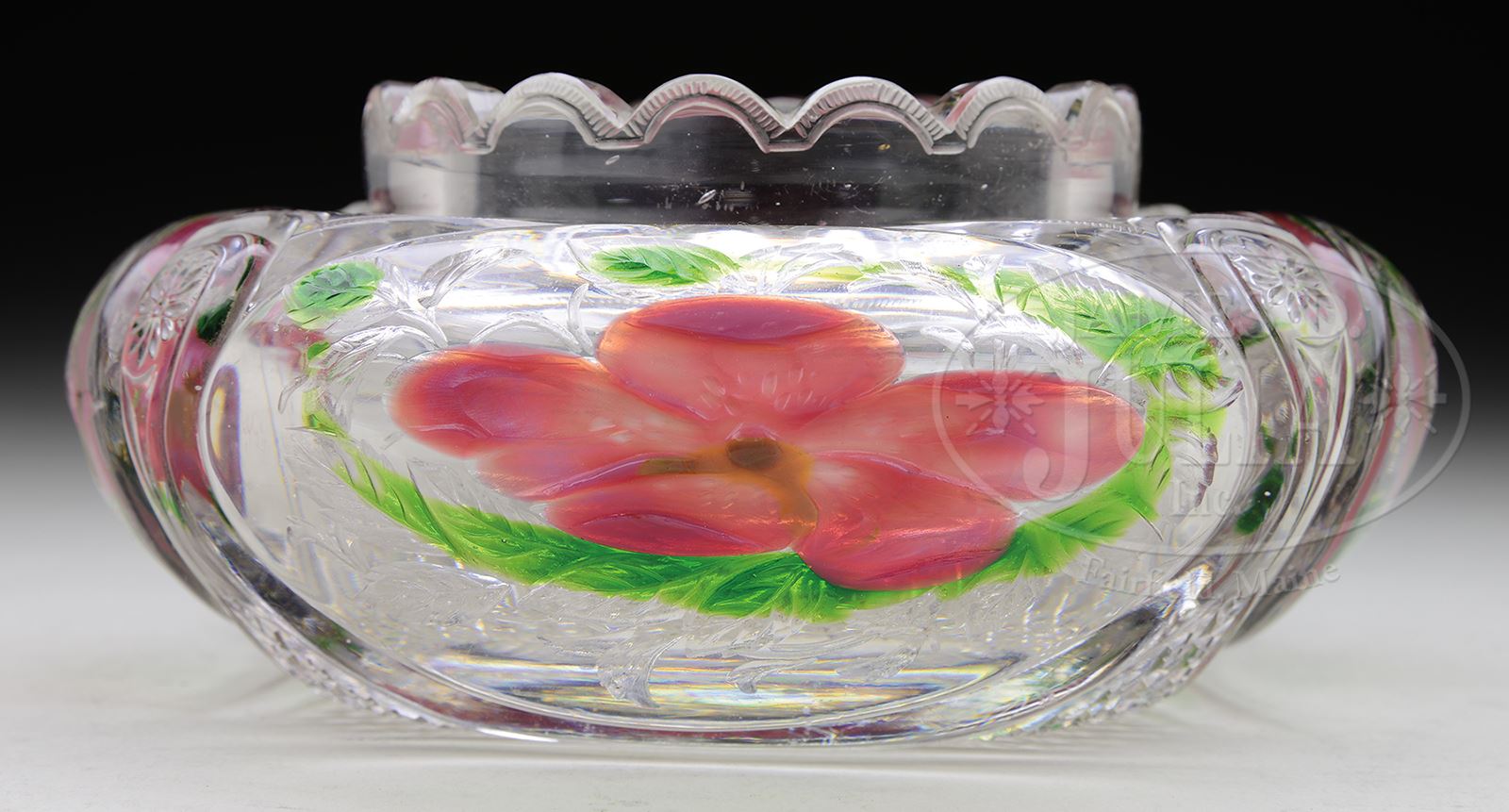 TIFFANY CUT & WHEEL CARVED PAPERWEIGHT VASE.Clear crystal vase has padded pink flowers within four oval panels cut into the vase. Each flower is beautifully wheel carved and surrounded by intaglio carved leaves. Each oval panel is separated by cut pattern of flowers and cross-hatched cutting. Signed on underside “L.C.T. o3446”. SIZE: 6″ dia. CONDITION: Very good to excellent. 50429-67 (10,000-15,000) – Lot 2001