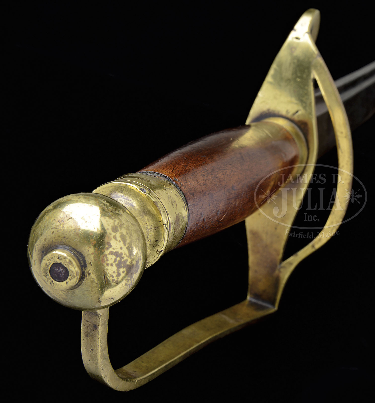 FINE CHERRY GRIPPED AMERICAN REVOLUTIONARY WAR OFFICER’S SWORD.This classic single fullered American hanger has 27″ blade with single slotted brass guard and well patinaed round cherry grip. This is a fine example of an American made 18th century sword that survived in relatively fine, aesthetically pleasing condition. SIZE: 33″ overall. CONDITION: Very good to fine overall. Blade is grey overall with scattered areas of staining, pitting and old sharpening. Brass has been cleaned and varnished with a slight bend to pommel. Cherry grip is sound and solid with hand worn patina and normal cosmetic blemishes from 200 years. 51778-1 (2,000-3,000) – Lot 2001