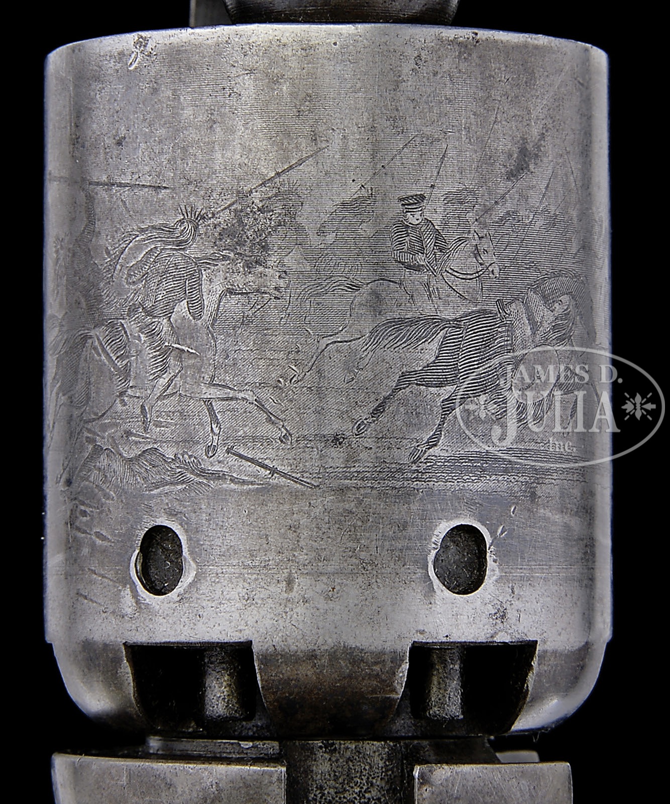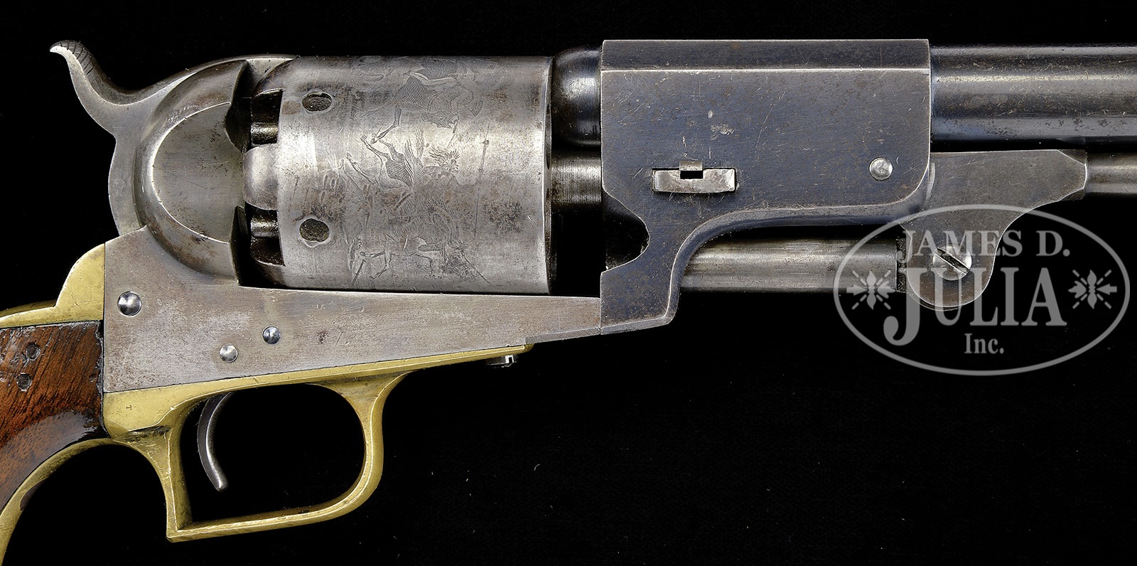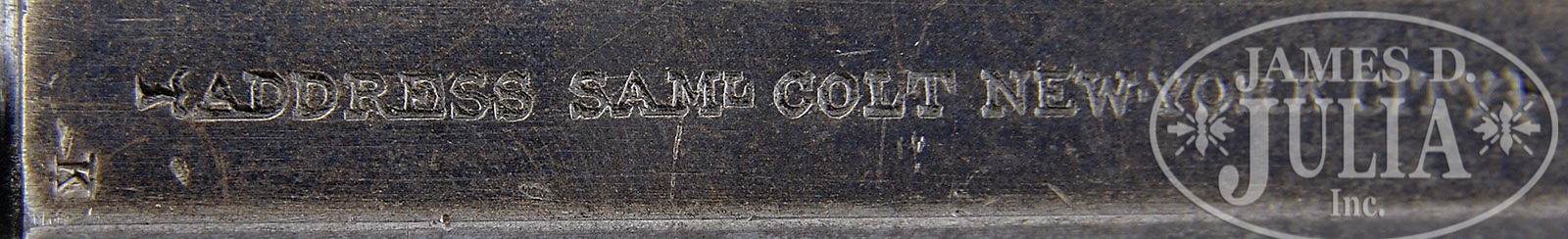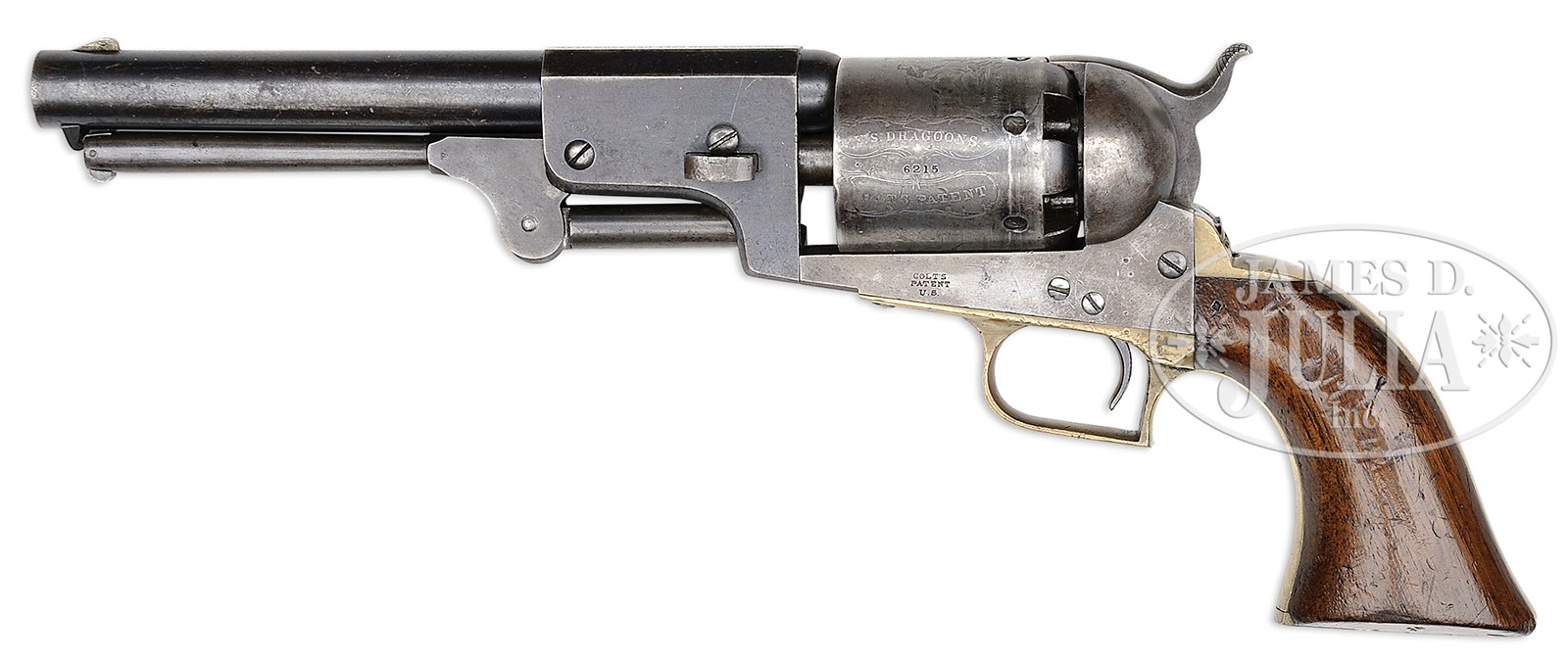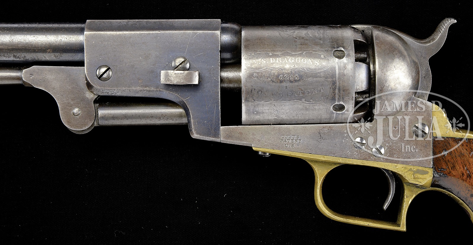 EXTREMELY FINE OUTSTANDING CASED 1ST MODEL COLT DRAGOON PERCUSSION REVOLVER.SN 6215. Cal. 44. Blue & color case hardened with 7-1/2″ oct to rnd bbl, German silver front sight and 1-line left hand New York City address with brackets. Frame is marked with a small “COLT’S PATENT” over a tiny “U.S.” Cyl is usual 6-chambers with oval stop notches and the Dragoon/Indian fight scene roll marking and a crisp, clear “U.S. DRAGOONS. / COLT’S PATENT” cartouches surrounding the SN. The sgl safety pin is crisp. The silver plated square back brass trigger guard & backstrap contain a varnished 1-pc walnut grip with last three digits of matching SN in buttstrap channel. Accompanied by an extremely rare, orig, blue velvet lined Colt casing. Compartmented in the bottom for the revolver, an orig brass 2-cavity, early Dragoon “COLT’S PATENT” 2-cavity bullet & ball mold with sprue cutter and a lacquered Eley’s cap tin. Also accompanied by an extremely fine “COLTS PATENT” powder flask with plunger spout & low mounted triangle hangers. According to Flayderman’s Guide to Antique American Firearms only about 7,000 of these revolvers were manufactured in the period 1848-1850 and this particular example was made in 1849. They are rarely found with any orig finish and a cased revolver is extremely rare with only a few known especially in such high condition. PROVENANCE: The William Gerber Family Collection. CONDITION: Extremely fine, all matching except wedge which is numbered “456”. Bbl retains over 90% orig blue with light scratching and small areas of pitting especially at muzzle on left side, balance is mostly plum/blue; rammer pivot retains muted case colors with balance of rammer silver/gray; frame and hammer are mostly a silver/gray with strong traces of muted case color especially in protected areas; there is a small muted area on the lower right recoil shield and tiny areas of scattered staining and pinprick pitting; cyl is crisp and well defined with strong traces of blue finish and an overall silver/gray patina, the cyl scene is virtually all intact with several small dents and scattered scratches; The “U.S. DRAGOONS.” and “COLT’S PATENT” cartouches are crisp with surrounding foliate patterns completely visible as is the Ormsby signature; trigger guard and backstrap retain tiny traces of very thin silver wash as was originally applied that is now only visible as ghosts in protected areas around trigger guard; the trigger guard and backstrap have tiny sub-inspector marks being overrun military parts which the frugal Colt used in his civilian arms; grip is sound and solid and well fit with numerous small dings, dents & scratches and overall retains 95%+ of a bright varnish finish. Mechanics are crisp, crisp shiny bore. Case is sound and solid with a long glued repaired crack in lid with usual light handling & storage nicks & scratches and retains about all of a fine but thin varnished finish; there is a separation at the bottom right section of lid from warpage; interior of case is a royal blue with moderate fading, staining and damage where muzzle and cyl rested; partitions are sound and solid; mold is very fine with bright fire blue on about 30% of sprue cutter, there are numerous small dings and dents on the external brass portions of mold where it was used apparently as a hammer; flask is in very fine condition with no dents, slightly soiled with light handling scratches and retains 90%+ of its orig varnish with wear mostly at the highest points of relief, plunger and top retain 80%+ of their orig silver plate; cap tin is fine; there are two like new mainsprings also found in one compartment. (WG-015) 4-51086 JS228 (75,000-125,000) – Lot 2002
