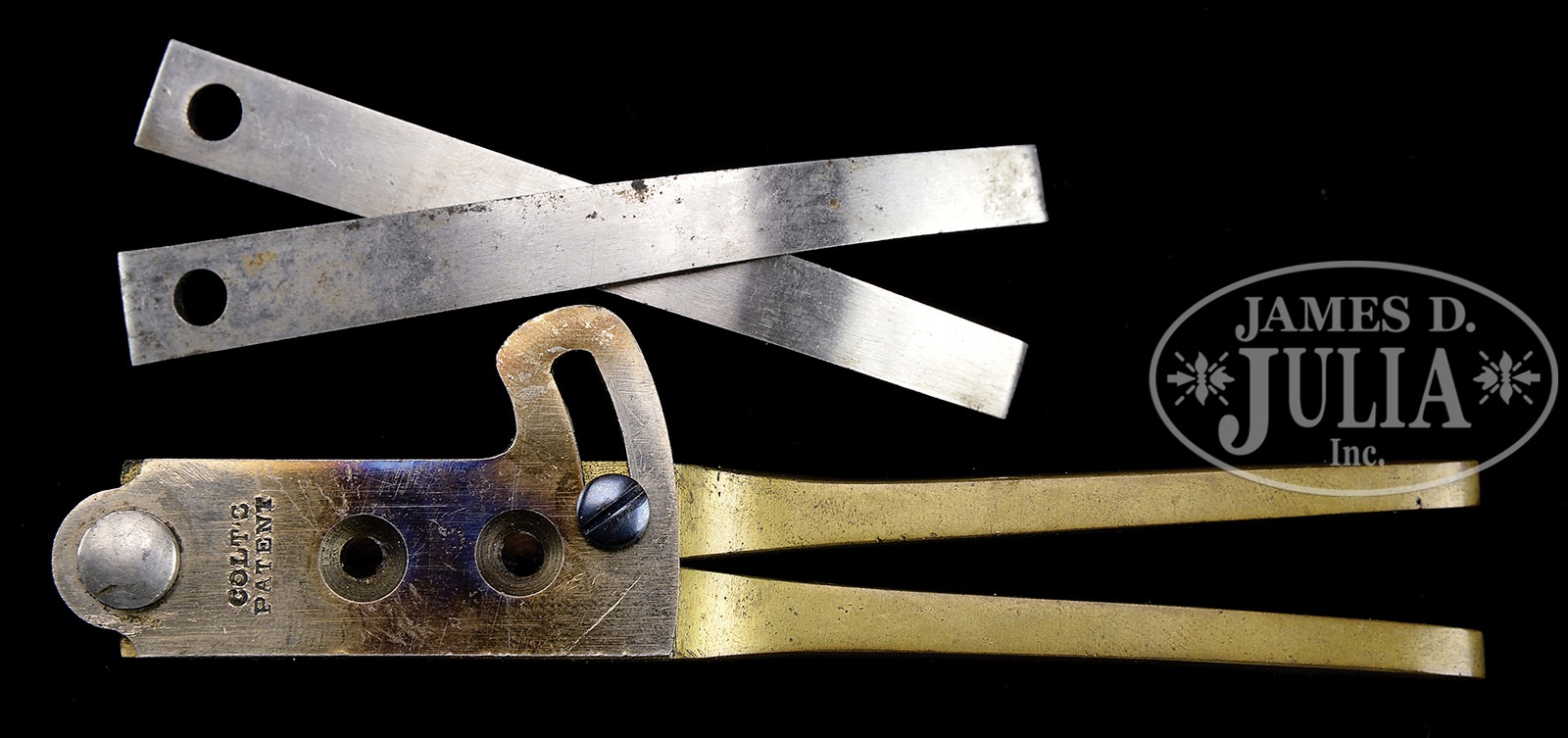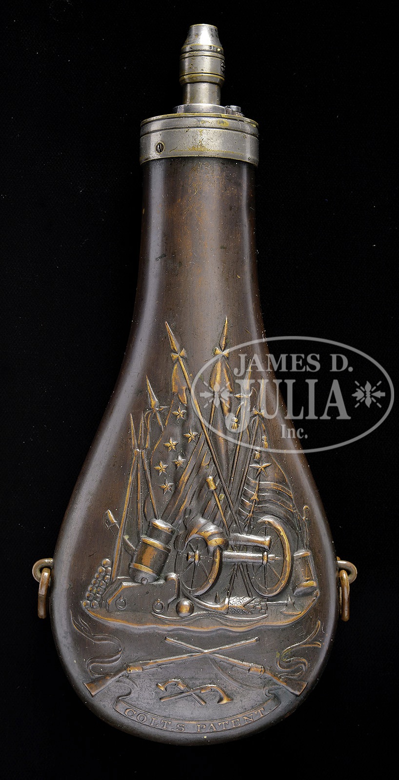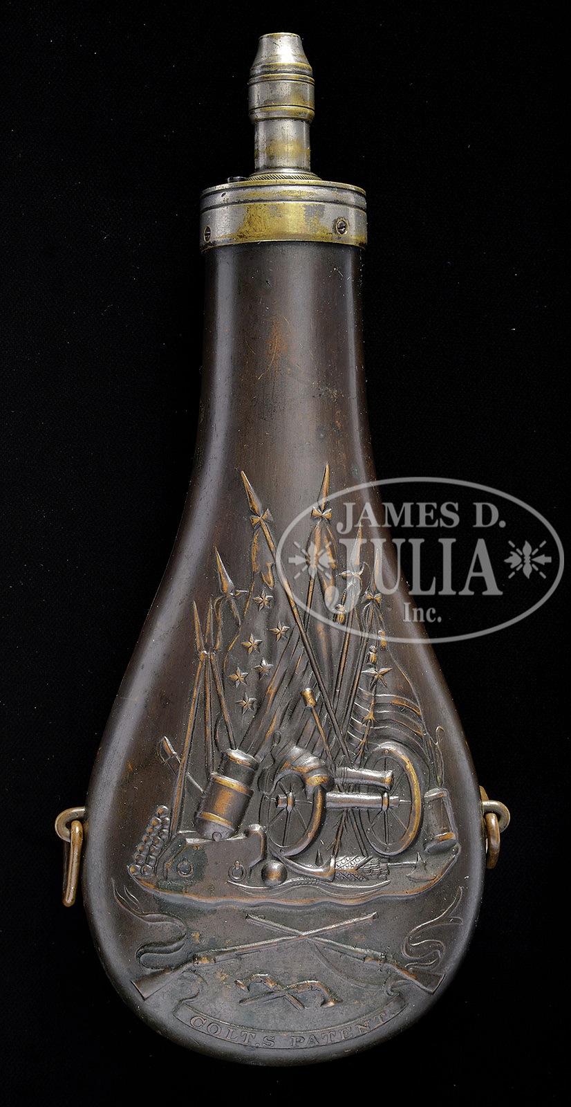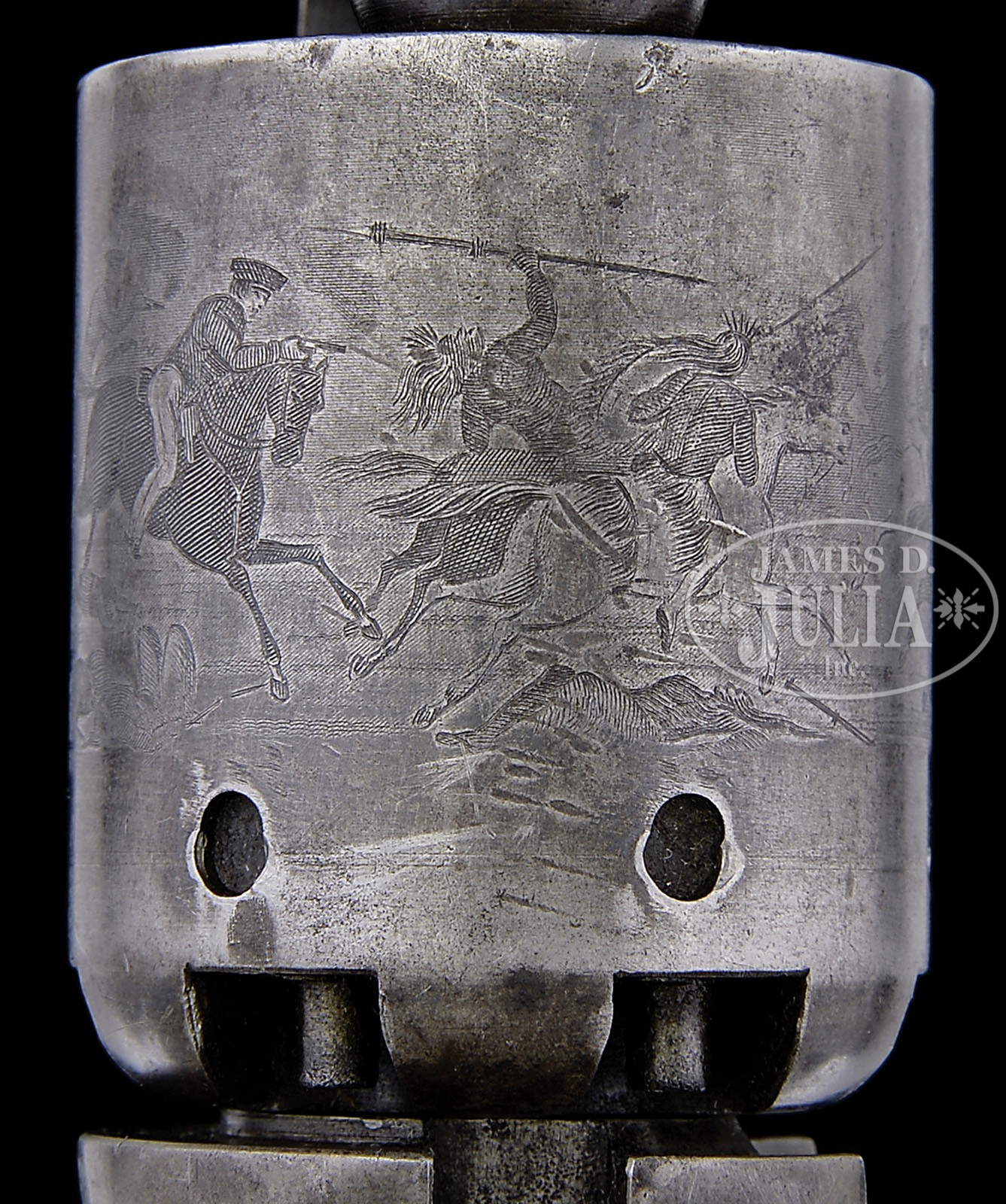 EXTREMELY FINE OUTSTANDING CASED 1ST MODEL COLT DRAGOON PERCUSSION REVOLVER.SN 6215. Cal. 44. Blue & color case hardened with 7-1/2″ oct to rnd bbl, German silver front sight and 1-line left hand New York City address with brackets. Frame is marked with a small “COLT’S PATENT” over a tiny “U.S.” Cyl is usual 6-chambers with oval stop notches and the Dragoon/Indian fight scene roll marking and a crisp, clear “U.S. DRAGOONS. / COLT’S PATENT” cartouches surrounding the SN. The sgl safety pin is crisp. The silver plated square back brass trigger guard & backstrap contain a varnished 1-pc walnut grip with last three digits of matching SN in buttstrap channel. Accompanied by an extremely rare, orig, blue velvet lined Colt casing. Compartmented in the bottom for the revolver, an orig brass 2-cavity, early Dragoon “COLT’S PATENT” 2-cavity bullet & ball mold with sprue cutter and a lacquered Eley’s cap tin. Also accompanied by an extremely fine “COLTS PATENT” powder flask with plunger spout & low mounted triangle hangers. According to Flayderman’s Guide to Antique American Firearms only about 7,000 of these revolvers were manufactured in the period 1848-1850 and this particular example was made in 1849. They are rarely found with any orig finish and a cased revolver is extremely rare with only a few known especially in such high condition. PROVENANCE: The William Gerber Family Collection. CONDITION: Extremely fine, all matching except wedge which is numbered “456”. Bbl retains over 90% orig blue with light scratching and small areas of pitting especially at muzzle on left side, balance is mostly plum/blue; rammer pivot retains muted case colors with balance of rammer silver/gray; frame and hammer are mostly a silver/gray with strong traces of muted case color especially in protected areas; there is a small muted area on the lower right recoil shield and tiny areas of scattered staining and pinprick pitting; cyl is crisp and well defined with strong traces of blue finish and an overall silver/gray patina, the cyl scene is virtually all intact with several small dents and scattered scratches; The “U.S. DRAGOONS.” and “COLT’S PATENT” cartouches are crisp with surrounding foliate patterns completely visible as is the Ormsby signature; trigger guard and backstrap retain tiny traces of very thin silver wash as was originally applied that is now only visible as ghosts in protected areas around trigger guard; the trigger guard and backstrap have tiny sub-inspector marks being overrun military parts which the frugal Colt used in his civilian arms; grip is sound and solid and well fit with numerous small dings, dents & scratches and overall retains 95%+ of a bright varnish finish. Mechanics are crisp, crisp shiny bore. Case is sound and solid with a long glued repaired crack in lid with usual light handling & storage nicks & scratches and retains about all of a fine but thin varnished finish; there is a separation at the bottom right section of lid from warpage; interior of case is a royal blue with moderate fading, staining and damage where muzzle and cyl rested; partitions are sound and solid; mold is very fine with bright fire blue on about 30% of sprue cutter, there are numerous small dings and dents on the external brass portions of mold where it was used apparently as a hammer; flask is in very fine condition with no dents, slightly soiled with light handling scratches and retains 90%+ of its orig varnish with wear mostly at the highest points of relief, plunger and top retain 80%+ of their orig silver plate; cap tin is fine; there are two like new mainsprings also found in one compartment. (WG-015) 4-51086 JS228 (75,000-125,000) – Lot 2002