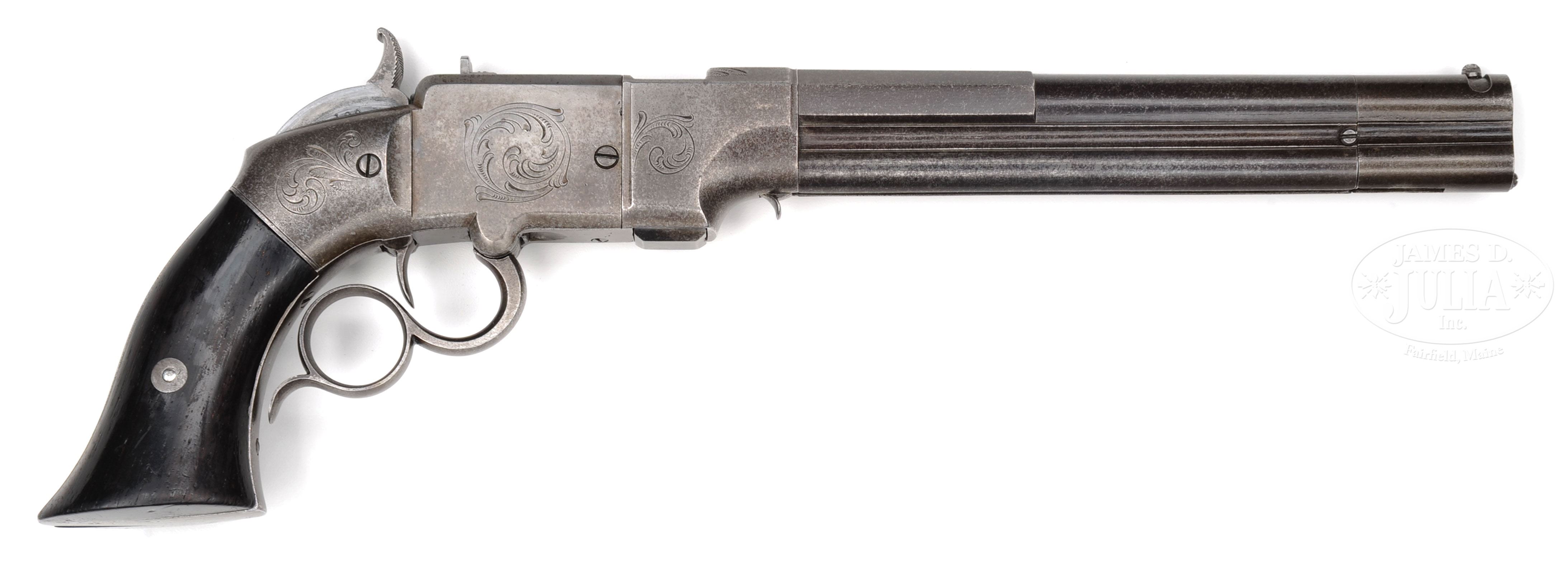 RARE SMITH & WESSON #2 LEVER ACTION REPEATING PISTOL.SN 129. Cal. 41. Cast steel Navy sized pistol with 8″ oct to rnd bbl, pinched post front sight and fixed rear sight attached to top flat of receiver. Top flat of bbl is marked with the 3-line Smith & Wesson address and “PATENT”. Mounted with 2-pc smooth ebony grips matching numbered to this pistol. Frame & side plates are lightly engraved in foliate arabesque scrolls. Top of the frame on each end of the ejection port, rear edge of hammer and heel of the backstrap are matching engraved. Serial number was observed on the left side of the buttstrap under the grip, side of hammer and in pencil inside the left grip. No further disassembly was effected to check for additional matching numbers throughout. Accompanied by a Smith & Wesson factory letter which identifies this pistol as having been produced in 1854 and sold through the J. Dixon Co., the sole agent for Smith & Wesson at that time. Also accompanied by copies of eight pages of research accomplished by consignor which includes photographs of internal parts showing matching serial numbers. According to various publications there were fewer than 500 of these rare pistols produced during the period 1854-1855 in two different bbl lengths. In 1855 the design was purchased from Smith & Wesson and the name changed to The Volcanic Repeating Arms Co., which subsequently evolved into the New Haven Arms Co., then became the Henry Arms Company and from that became the Winchester Repeating Arms Company. CONDITION: Fine, all matching including grips. Bbl & magazine tube retain a medium blue/brown patina with stronger appearing blue just forward of the octagon section; frame, lever & hammer are grey metal patina; grips show moderate to heavy wear but are completely sound. Mechanics are fine; strong bright bore, frosted in the grooves. 4-51327 JR12 (25,000-35,000) – Lot 2002 Click here to view provenance