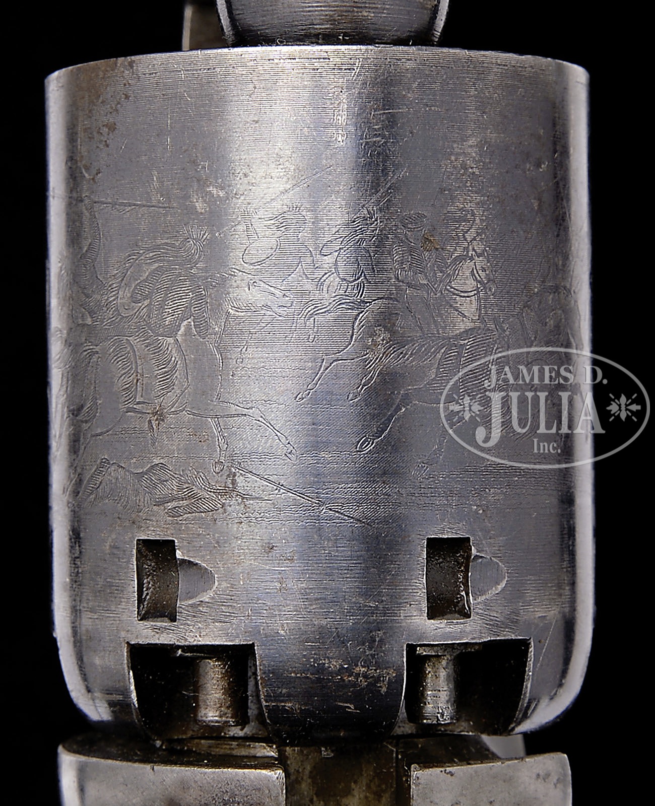 EXTREMELY FINE & RARE COLT NEW HAMPSHIRE MARKED 2ND MODEL DRAGOON PERCUSSION REVOLVER.SN 10716. Cal. 44. Scarce martially marked dragoon with 7-1/2″ oct to rnd bbl, German silver front sight with usual 1-line address on top flat and “NEW HAMPSHIRE” on left side of round section. Rammer has vertical latch and left side of frame has “COLT’S PATENT” over a tiny “U.S.”. It has square back brass trigger guard and back strap with 1-pc grip having a legible “JCB” (Joseph C. Bragg) cartouche on left side and “WAT” (William A. Thornton) cartouche on right side. Various parts have small inspector initials including grips, backstrap, trigger guard, frame, hammer, loading arm & cyl. Cyl has usual markings with the Dragoon/Indian fight scene. This revolver appears as the center image on pg. 52 of the book The Wm M. Locke Collection, Sellers. According to Flayderman’s Guide to Antique American Firearms only a few hundred of these rare revolvers were contracted by the state of New Hampshire and few are known today. The 2nd Model Dragoon is the most rare of all the dragoons with a total production of only about 2,700 revolvers in the period 1850-51. They were just about all issued and used, even through the Civil War, leaving few with much orig finish. This is among the finest examples known of a New Hampshire 2nd Model Dragoon. PROVENANCE: Wm M. Lock Collection; The William Gerber Family Collection. CONDITION: Extremely fine overall, appears all matching though gun was not disassembled. Bbl retains over 90% of its orig bright blue finish though thinning on bbl and balance plum with some light scratching and small areas of oxidation; cyl retains about 70% blue finish though only about 10% is truly bright remaining blue is very thin turning to a silver/blue with areas of plum/silver retaining virtually all of its rolled Ormsby Dragoon/Indian fight scene with tiny areas of pinprick oxidation; four safety pins are intact and functional; the frame is smooth and mostly a silver/gray with strong ghosts of muted case color over 50% of its surface; hammer has a similar color to frame with same muted case colors; backstrap and trigger guard have a light mustard patina with light scratching on trigger bow; grips are sound, solid and very well fit with light storage marks and edge wear, left inside toe is chipped, cartouches are both crisp and discernible and grips retain a hand worn patina retaining most of their orig oiled finish. Mechanics are crisp, bore is crisp and shiny. (WG-017) 4-51087 JS227 (50,000-80,000) – Lot 2003