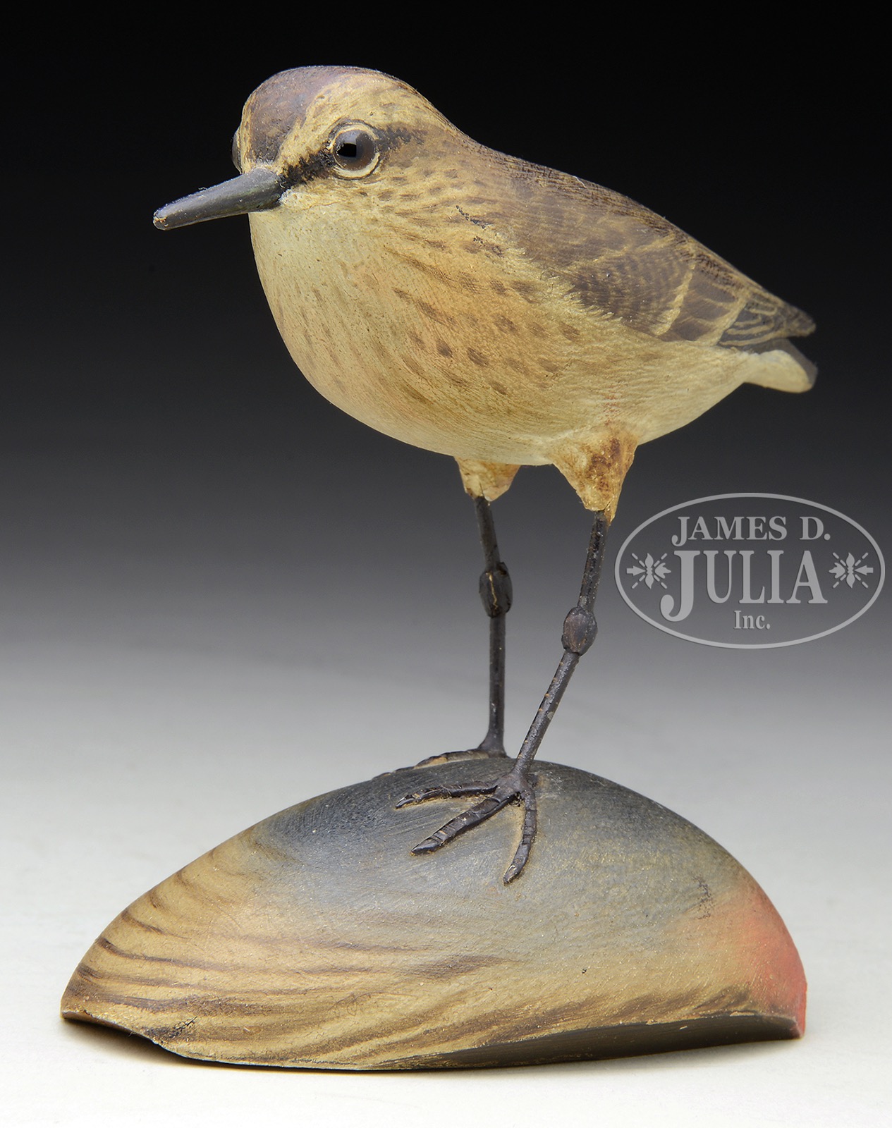 LIFE-SIZED DECORATIVE SANDERLING BY A.E. CROWELL, EAST HARWICH, MA.Mounted on a carved and painted clam shell base which is stamped with Crowell’s rectangular stamp, and exhibiting Crowell’s hand-written signature “A.E. Crowell Cape Cod”. SIZE: 4-3/4″ h x 5″ l. PROVENANCE: From a Maine/Texas estate being sold unreserved. CONDITION: Very good, legs with minor restoration by Steve Weaver. 51398-5 (6,000-9,000) – Lot 2003