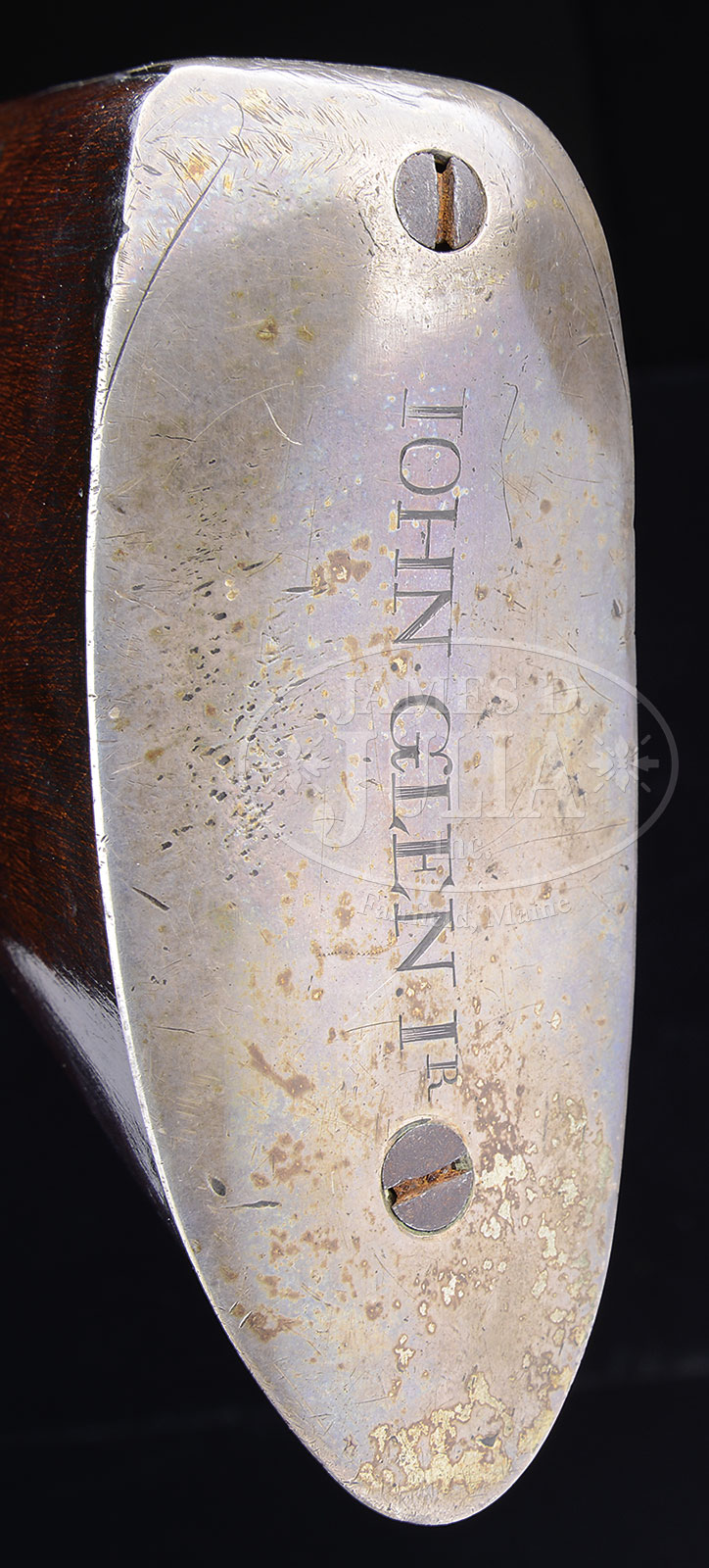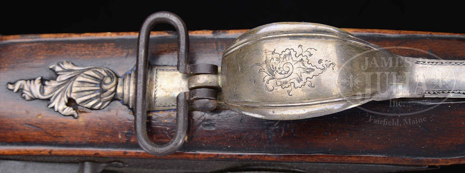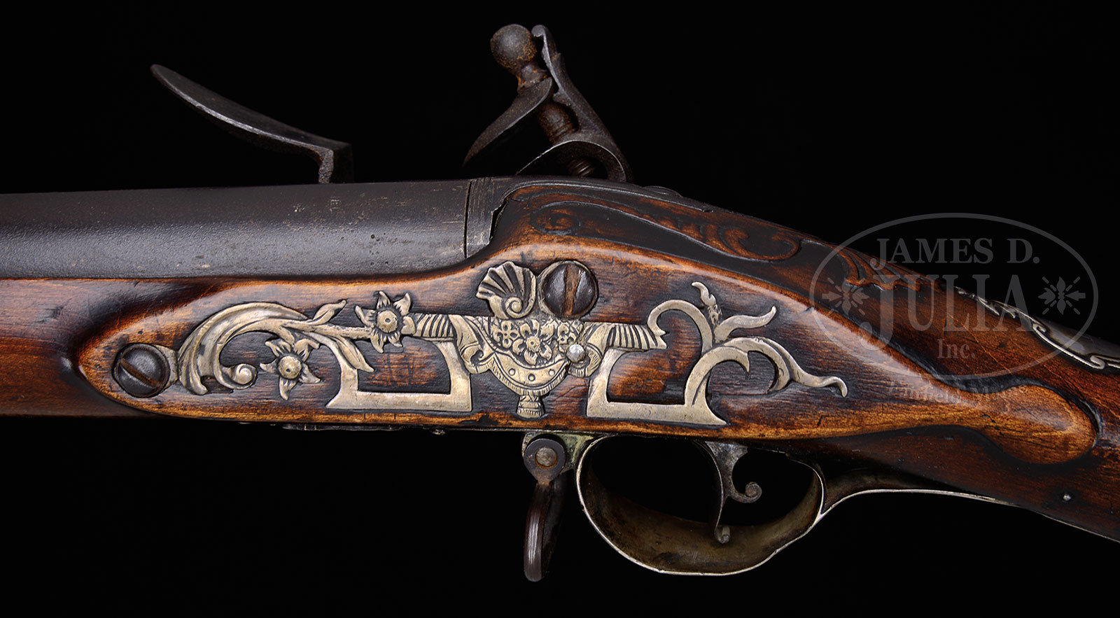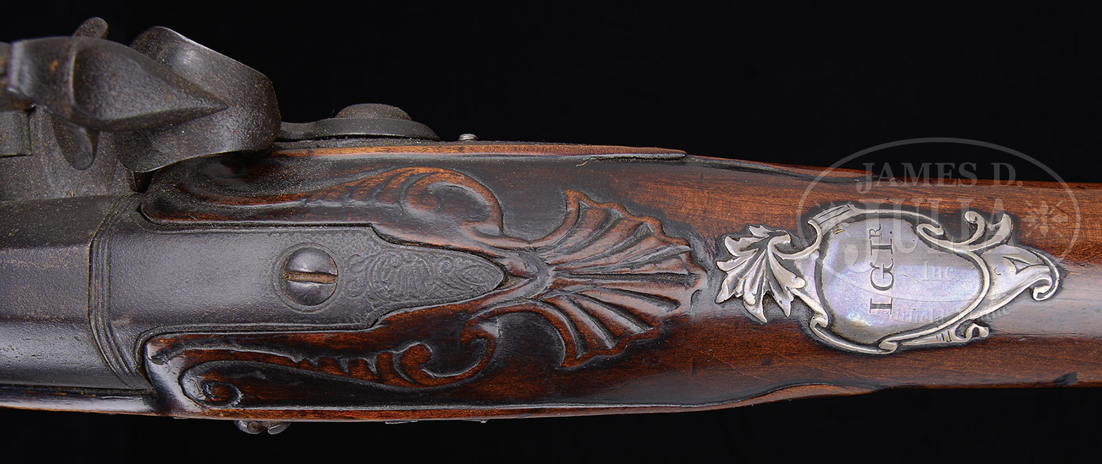 EXTREMELY RARE AND FINE ARCHIVE OF AMERICAN PATRIOT JOHN GLEN, Jr. WHICH INCLUDES HIS INSCRIBED REVOLUTIONARY WAR AMERICAN SILVER MOUNTED, FLINTLOCK OFFICER’S FUSIL.The treasure in this archive is, perhaps, the finest known example of an American made fusil of the American Revolutionary War period. The maple stocked fusil has its original commercial flintlock marked “JOVER” and the 38 ½” 65 caliber smooth bore barrel has Birmingham proofs. All of the mountings are non-hallmarked silver with relief Rococo design and fine chiseled martial engraving. The ornate thumbplate has Glen’s initials in the 18th century style where “I’s” and “J’s” are interchangeable, “JGJr”. The sole of the buttplate is engraved in large block letters “JOHN GLEN Jr”. There is fine relief carving at the barrel tang. The overall architecture of the gun is superb. This fusil presents beautifully and was made for a man of means. It represents the finest achievement in mid 18th century American gun making. Col. John Glen Jr (1735-1828) was Quarter Master of the Continental Army of the Northern Department and was a close associate of George Washington, who on occasion stayed at the Glen Plantation in New York. Glen had prior service in the French and Indian Wars in various New York units from 1755. Archive also includes two documents: one bureaucratic signed by John Glen Sr October 21, 1745 and the second is a fine archivally framed document dated 1758, appointing John Glen Jnr as 2nd Lieutenant of the 3rd Company of Militia of Schenectady, signed by James Delancy, the British Lieutenant-Governor and Commander-in-Chief of the Province of New York. The chair, which is a typical New England mid-18th century splat back chair, was in the Glen home when Commander-in-Chief George Washington visited and stayed there in 1775 during the Revolutionary War and at other times according to provided research. General Washington could very well have sat in this chair and could have handled this wonderful fusil that no doubt was a prized possession. After the Revolutionary War, the area around the Glen home was renamed “Glen’s Falls, NY’ a name by which it is known today. The area was originally named Wing’s Falls, but Abraham Wing was not the ardent patriot as John Glen and John Glen was a patriot! There is a large file of research concerning the naming of “Glen’s Falls” and also information concerning George Washington’s visits to Col. Glen’s house and provenance on this archive. PROVENANCE: Montreal auction (1970s) of Glen Family items, descended in John Glen’s Jr’s oldest son’s family who were Torries and relocated to Canada prior to the War of 1812. Ex-collection Mark Berube, 2000; Alan Para collection, 2009. CONDITION: Fusil is very good to fine overall. Metal surfaces are dark grey/brown with light pitting. The wood has a rich, mellow, hand-worn patina. The silver mounts have a soft grey patina with minor losses from over 250 years. In the accompanying 2013 appraisal document by well known American Revolutionary War, Kentucky rifle expert and collector Stephen Hench of Lancaster, PA he states: “To the best of my knowledge, there is no finer, documented silver mounted American officer’s fusil from the Revolutionary war than this surviving example of John Glen Jr’s”. Framed commission is very good, complete with seal and stamp. Contemporary 2009 carved powder horn made for display purposes is in fine condition made in the style of 1759 when Glen was in the militia during the French and Indian Wars. Chair- old multiple coats of paint removed. Proper left side of splat absent. Seat remains mostly intact with normal and expected wear. 51936-1 (30,000-50,000) – Lot 2003 Click here to view provenance