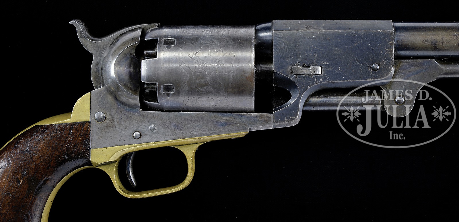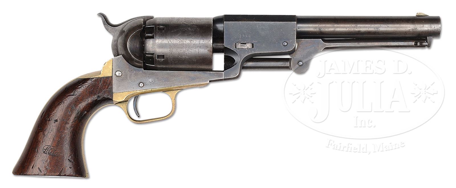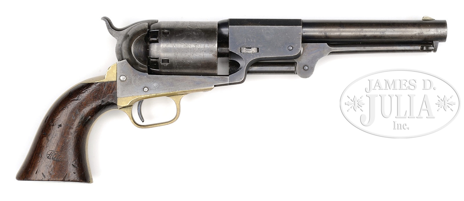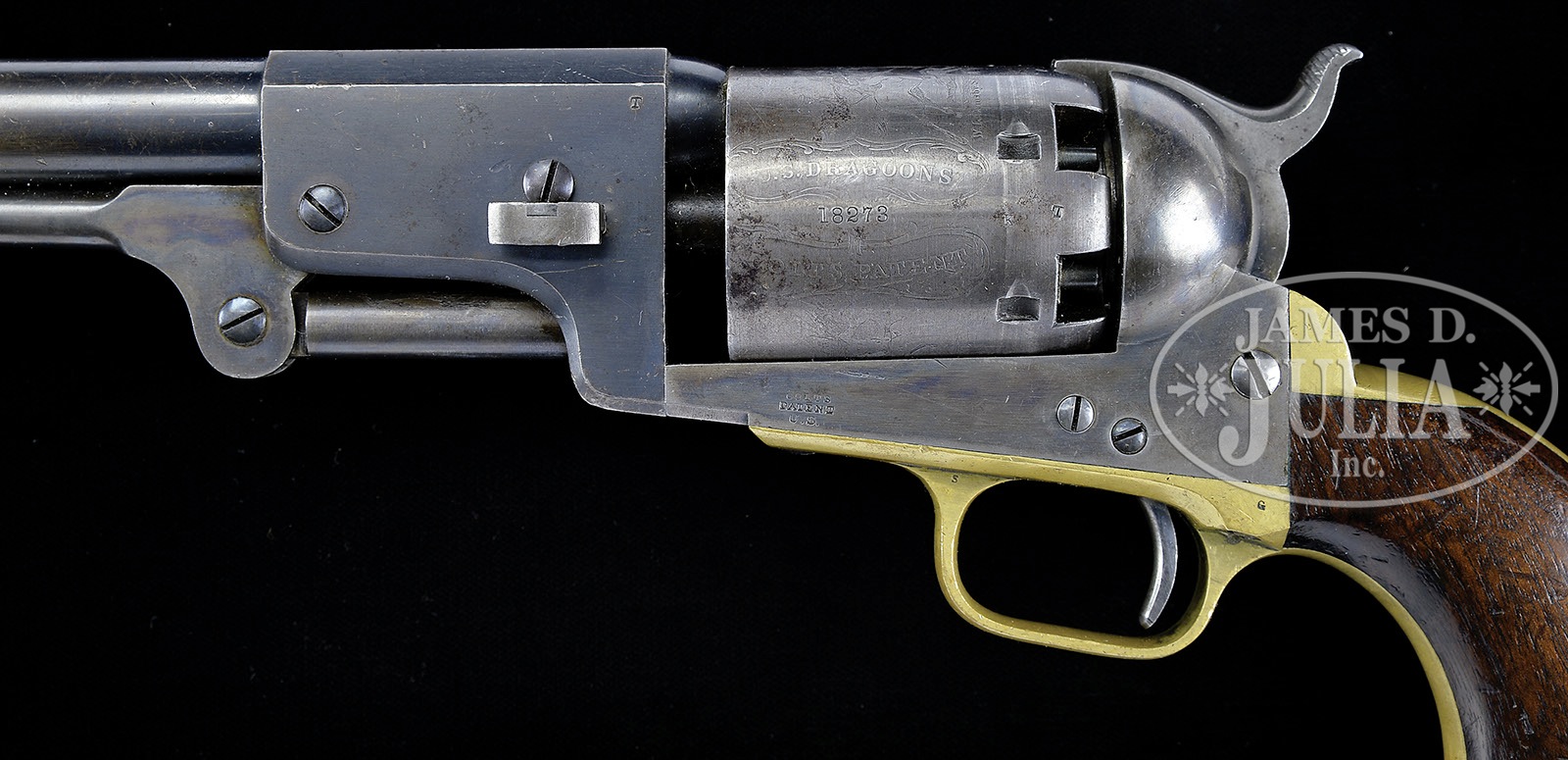 EXTREMELY FINE MARTIALLY MARKED COLT 3RD MODEL DRAGOON PERCUSSION REVOLVER.SN 18273. Cal. 44. Blue & color case hardened with 7-1/2″ oct to rnd bbl, brass front sight and 1-line right hand New-York City address with brackets. Left side of frame is marked with a small “COLTS PATENT” over a tiny “U.S.” Cyl is usual 6-chambers with Dragoon/Indian fight scene roll marking and “MODEL U.S.M.R. / COLTS PATENT” cartouches surrounding the SN. Brass trigger guard & backstrap contain a 1-pc walnut grip with well defined cartouches on each. There are small inspector initials on various parts including grips, cyl, backstrap, front strap, trigger guard & bbl. According to Flayderman’s Guide to Antique American Firearms there were about 10,500 of these powerful revolvers produced in the period 1851-1861 and this is among the very last of these guns produced. PROVENANCE: The William Gerber Family Collection. CONDITION: Extremely fine, all matching though stocks were not removed to check for SN. Bbl retains about 95% of its thinning bright blue on bbl housing, remainder of bbl has about 20% bright blue especially in protected areas with balance smooth silver/gray; frame and hammer retain about 80% muted case colors; trigger guard & backstrap have a light colored mustard patina with scattered small scratches on trigger guard and buttstrap; cyl is extremely crisp but only ghosts of a very thin blue finish with an overall blue/gray patina with virtually all the Dragoon/Indian fight scene legible with small areas of staining and pinprick pitting; three of six safety pins are still crisp and serviceable; grip is sound and solid with fine cartouches, showing light wear, numerous small storage dents & dings and retains a hand worn patina. Mechanics are crisp, bright crisp bore. (WG-018) 4-51088 JS226 (25,000-40,000) – Lot 2004