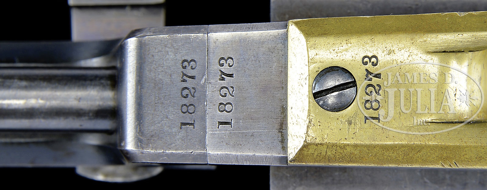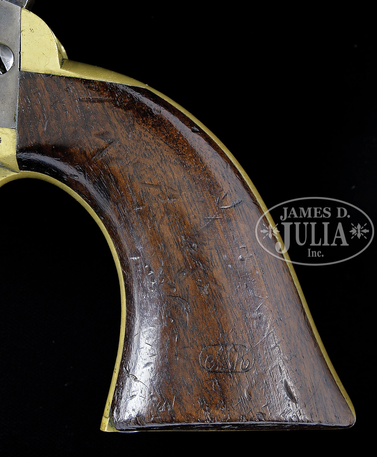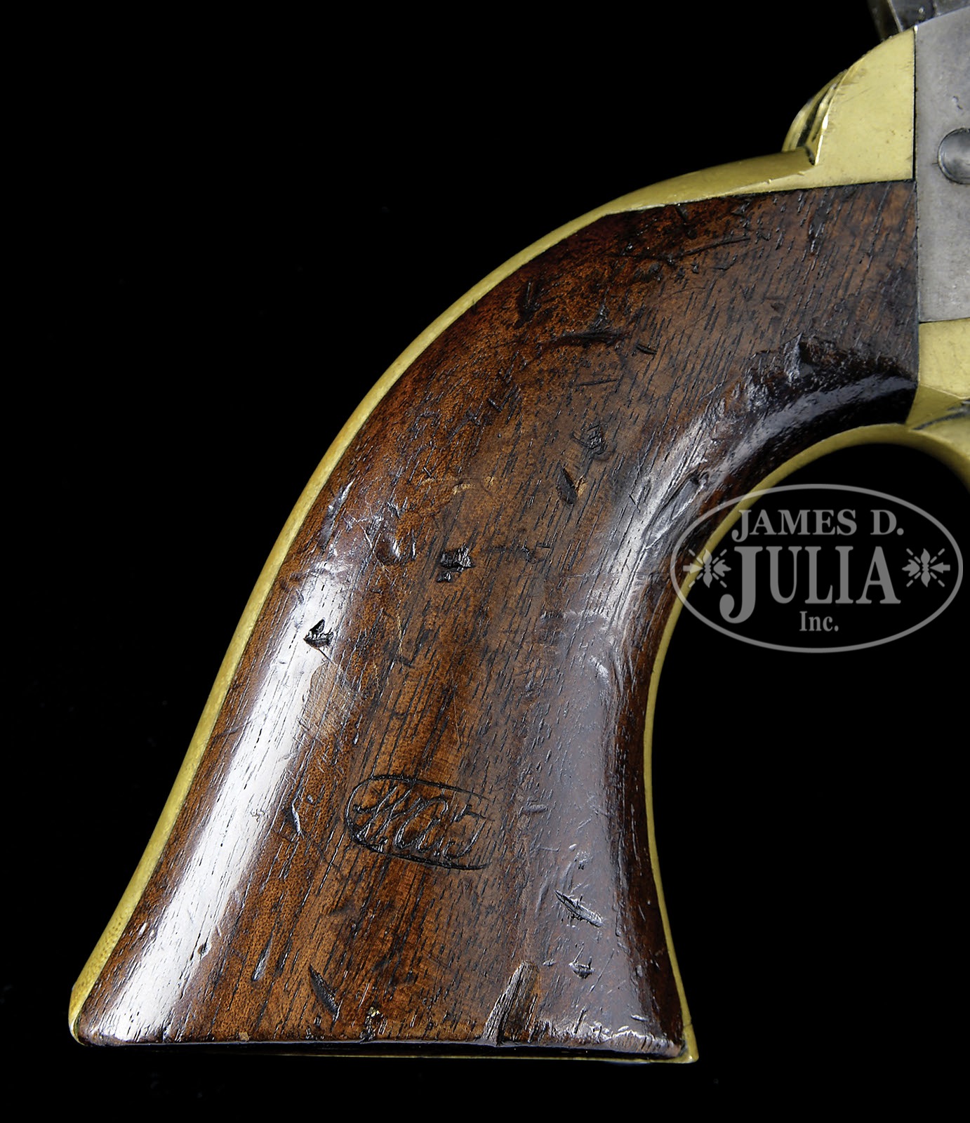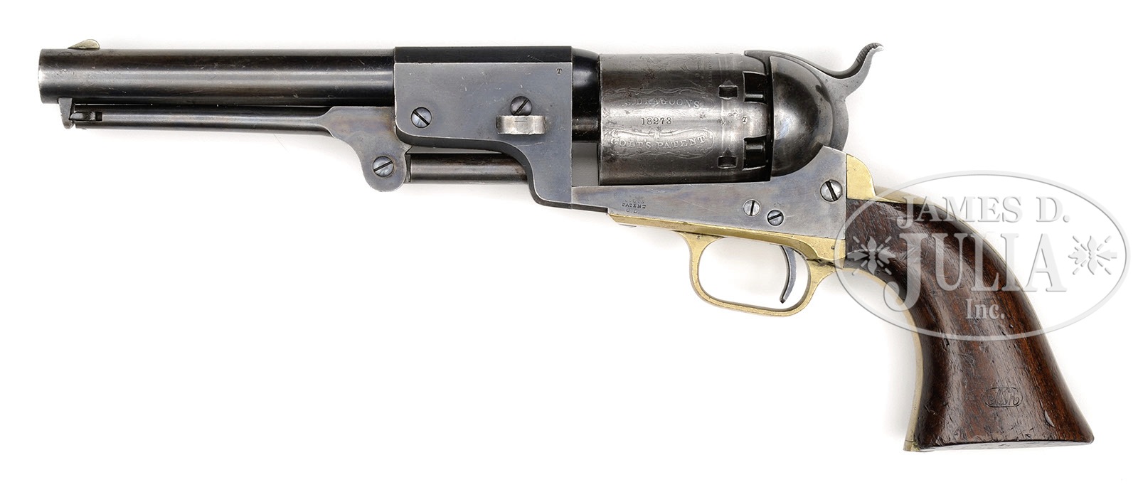 EXTREMELY FINE MARTIALLY MARKED COLT 3RD MODEL DRAGOON PERCUSSION REVOLVER.SN 18273. Cal. 44. Blue & color case hardened with 7-1/2″ oct to rnd bbl, brass front sight and 1-line right hand New-York City address with brackets. Left side of frame is marked with a small “COLTS PATENT” over a tiny “U.S.” Cyl is usual 6-chambers with Dragoon/Indian fight scene roll marking and “MODEL U.S.M.R. / COLTS PATENT” cartouches surrounding the SN. Brass trigger guard & backstrap contain a 1-pc walnut grip with well defined cartouches on each. There are small inspector initials on various parts including grips, cyl, backstrap, front strap, trigger guard & bbl. According to Flayderman’s Guide to Antique American Firearms there were about 10,500 of these powerful revolvers produced in the period 1851-1861 and this is among the very last of these guns produced. PROVENANCE: The William Gerber Family Collection. CONDITION: Extremely fine, all matching though stocks were not removed to check for SN. Bbl retains about 95% of its thinning bright blue on bbl housing, remainder of bbl has about 20% bright blue especially in protected areas with balance smooth silver/gray; frame and hammer retain about 80% muted case colors; trigger guard & backstrap have a light colored mustard patina with scattered small scratches on trigger guard and buttstrap; cyl is extremely crisp but only ghosts of a very thin blue finish with an overall blue/gray patina with virtually all the Dragoon/Indian fight scene legible with small areas of staining and pinprick pitting; three of six safety pins are still crisp and serviceable; grip is sound and solid with fine cartouches, showing light wear, numerous small storage dents & dings and retains a hand worn patina. Mechanics are crisp, bright crisp bore. (WG-018) 4-51088 JS226 (25,000-40,000) – Lot 2004