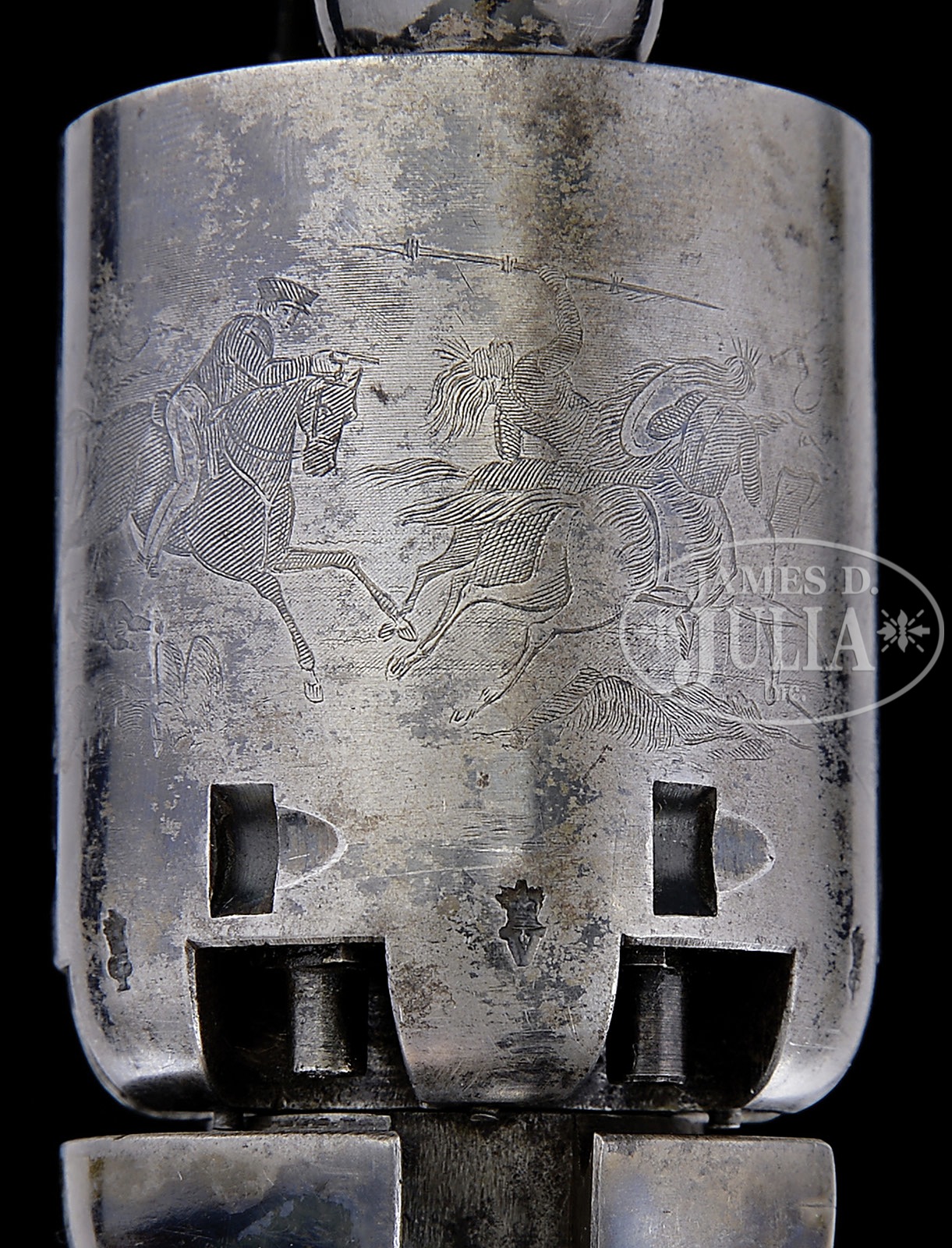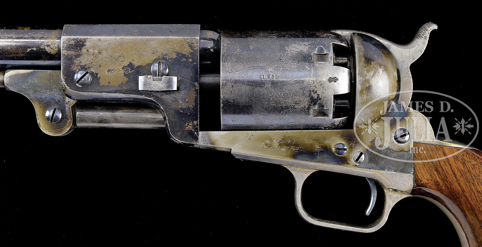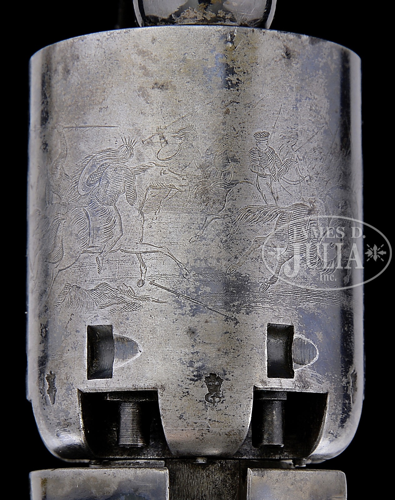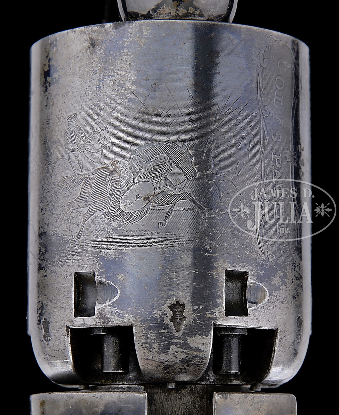 Please Note: The correct Serial Number is 123, not 125 as noted in the catalog. VERY RARE CASED COLT 3RD MODEL LONDON DRAGOON PERCUSSION REVOLVER.SN 125. Cal. 44. Blue and color case hardened with 7-1/2″ oct to rnd bbl, German silver front sight and 1-line New York City address with dashes. Frame has engraved “COLT’S PATENT” about centered on the left side. Cyl has usual 6-chambers with Dragoon/Indian fight scene roll marking and “MODEL U.S.M.R.” and “COLT’S PATENT” cartouches surrounding the SN. All 6 safety pins are crisp and prominent. The silver plated brass trigger guard and backstrap contain a varnished 1-pc walnut grip with SN “124” in the backstrap channel. Buttstrap is also numbered “124”. While all other serial numbered parts on the revolver are numbered “125”. It has been reliably reported that a major Colt collector in the U.S. England has an engraved 3rd Model Dragoon with backstrap numbered “125” which lends credibility to the hypothesis that this was simply an assembler mistake in switching the grips & backstrap before “124” was engraved. Attempts to contact this individual have thus far been unsuccessful. Accompanied by a rare, orig, blue velvet lined, English oak casing with empty brass plaque in the lid, swinging latches on the front and a mortised lock. Interior is compartmented for the revolver, a Dickson bag shaped flask with adjustable spout, a brass “COLTS PATENT” 2-cavity mold with sprue cutter, an “L” shaped nipple wrench and an early tin of Eley’s caps with black & white label. Right rear covered compartment contains a new spare hammer spring, 3 spare nipples and a functioning key. Also included is a pewter Dickson oil bottle and a crisp sealed packet of “COLT’S CARTRIDGE WORKS” combustible cartridges. There were only about 700 of these rare revolvers produced 1853-1857, primarily from Hartford made parts assembled & finished in England. These revolvers are rarely encountered today especially with high orig finish and cased examples are extremely rare. PROVENANCE: Pete Holder; Ron Romanella; The William Gerber Family Collection. CONDITION: Extremely fine, all matching except grip and backstrap as noted. Bbl retains about 70% glossy orig blue with the loss areas flaked, not worn, to a light patina; rammer and handle retain virtually all of their orig case colors, brilliant on the pivot; frame retains virtually all of its brilliant orig case colors, somewhat muted on the left side; hammer retains about 50% faded case colors; cyl retains 30-40% thinning orig blue with the loss areas flaked, not worn, to a light patina and shows about 95% Dragoon/Indian fight scene roll markings with both cartouches crisp and legible; trigger guard and backstrap retain virtually all of their orig silver finish with only slight sharp edge wear; grip is sound with crisp edges, a couple small nicks & bruises and retains virtually all of its brilliant orig varnish. Mechanics are crisp, brilliant shiny bore, may have been fired, but if so, very little. Case is sound with a few light nicks & scratches and retains virtually all of its bright orig varnish; interior shows little fading with only light soil in the bottom from contact with the bbl, cyl & edge of grip; accessories are crisp and new. Cartridge packet is also crisp. (WG-016) 4-51089 JR509 (60,000-100,000) – Lot 2005