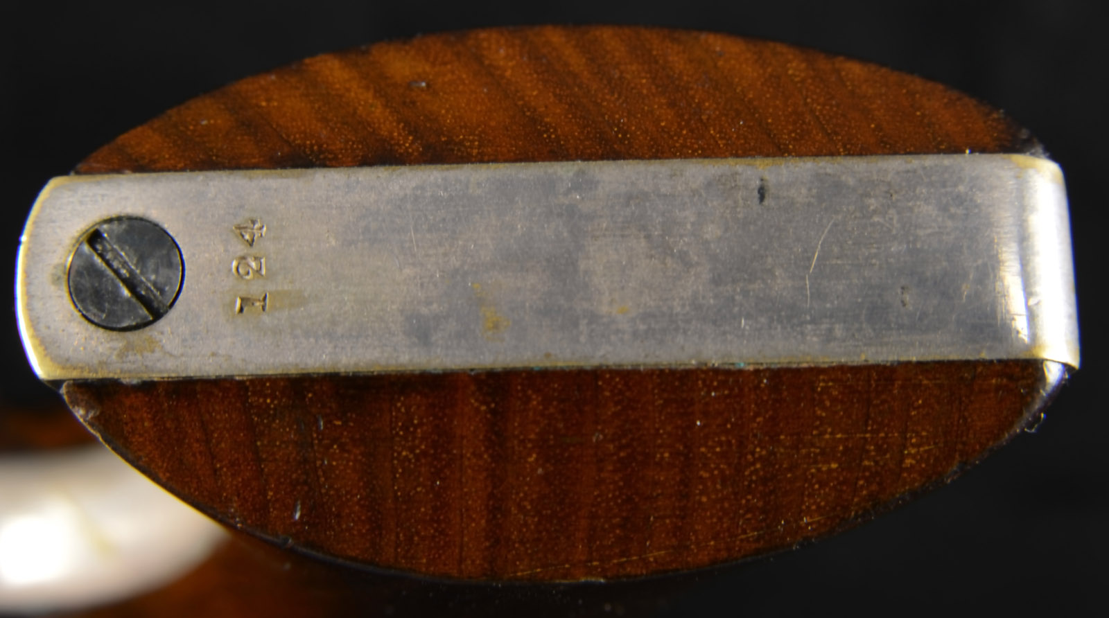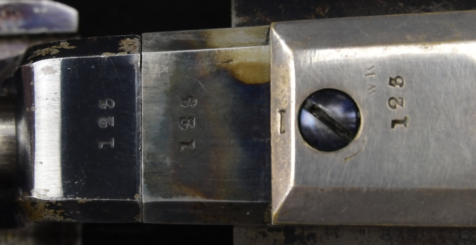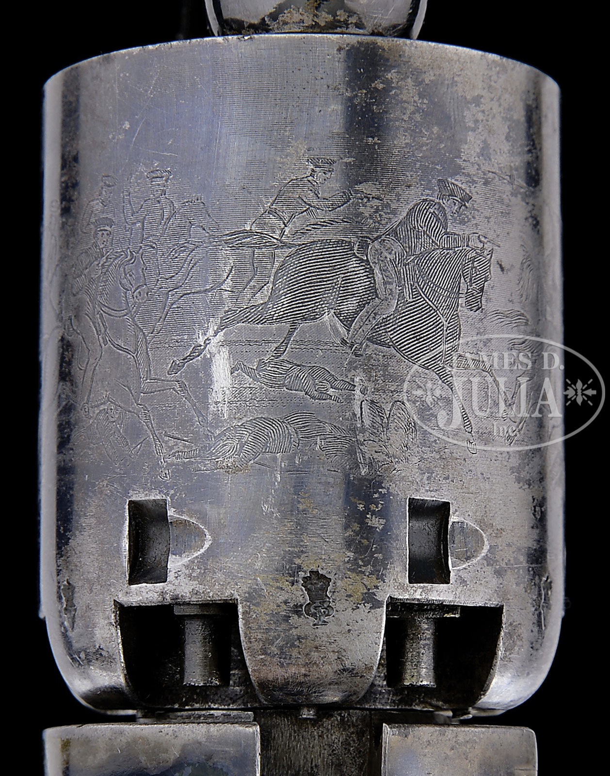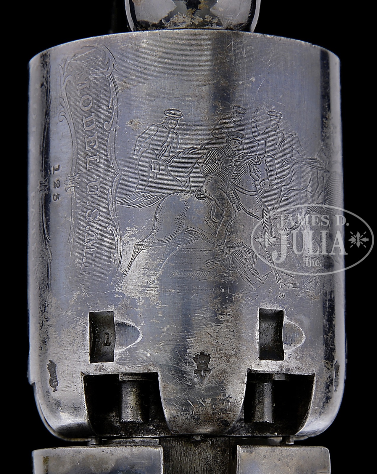 Please Note: The correct Serial Number is 123, not 125 as noted in the catalog. VERY RARE CASED COLT 3RD MODEL LONDON DRAGOON PERCUSSION REVOLVER.SN 125. Cal. 44. Blue and color case hardened with 7-1/2″ oct to rnd bbl, German silver front sight and 1-line New York City address with dashes. Frame has engraved “COLT’S PATENT” about centered on the left side. Cyl has usual 6-chambers with Dragoon/Indian fight scene roll marking and “MODEL U.S.M.R.” and “COLT’S PATENT” cartouches surrounding the SN. All 6 safety pins are crisp and prominent. The silver plated brass trigger guard and backstrap contain a varnished 1-pc walnut grip with SN “124” in the backstrap channel. Buttstrap is also numbered “124”. While all other serial numbered parts on the revolver are numbered “125”. It has been reliably reported that a major Colt collector in the U.S. England has an engraved 3rd Model Dragoon with backstrap numbered “125” which lends credibility to the hypothesis that this was simply an assembler mistake in switching the grips & backstrap before “124” was engraved. Attempts to contact this individual have thus far been unsuccessful. Accompanied by a rare, orig, blue velvet lined, English oak casing with empty brass plaque in the lid, swinging latches on the front and a mortised lock. Interior is compartmented for the revolver, a Dickson bag shaped flask with adjustable spout, a brass “COLTS PATENT” 2-cavity mold with sprue cutter, an “L” shaped nipple wrench and an early tin of Eley’s caps with black & white label. Right rear covered compartment contains a new spare hammer spring, 3 spare nipples and a functioning key. Also included is a pewter Dickson oil bottle and a crisp sealed packet of “COLT’S CARTRIDGE WORKS” combustible cartridges. There were only about 700 of these rare revolvers produced 1853-1857, primarily from Hartford made parts assembled & finished in England. These revolvers are rarely encountered today especially with high orig finish and cased examples are extremely rare. PROVENANCE: Pete Holder; Ron Romanella; The William Gerber Family Collection. CONDITION: Extremely fine, all matching except grip and backstrap as noted. Bbl retains about 70% glossy orig blue with the loss areas flaked, not worn, to a light patina; rammer and handle retain virtually all of their orig case colors, brilliant on the pivot; frame retains virtually all of its brilliant orig case colors, somewhat muted on the left side; hammer retains about 50% faded case colors; cyl retains 30-40% thinning orig blue with the loss areas flaked, not worn, to a light patina and shows about 95% Dragoon/Indian fight scene roll markings with both cartouches crisp and legible; trigger guard and backstrap retain virtually all of their orig silver finish with only slight sharp edge wear; grip is sound with crisp edges, a couple small nicks & bruises and retains virtually all of its brilliant orig varnish. Mechanics are crisp, brilliant shiny bore, may have been fired, but if so, very little. Case is sound with a few light nicks & scratches and retains virtually all of its bright orig varnish; interior shows little fading with only light soil in the bottom from contact with the bbl, cyl & edge of grip; accessories are crisp and new. Cartridge packet is also crisp. (WG-016) 4-51089 JR509 (60,000-100,000) – Lot 2005
