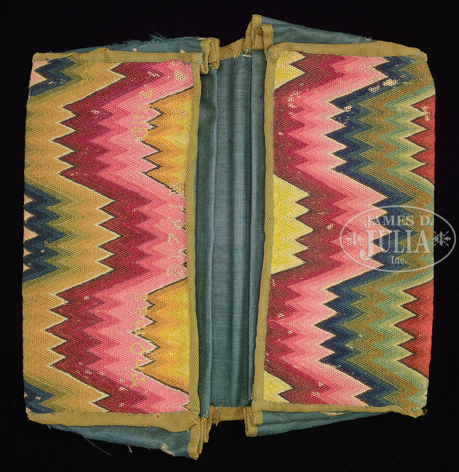 18TH CENTURY FLAME STITCHED BARGELLO MANS WALLET.New England, 18th century. Very finely woven large flame stitched wallet in greens, yellows, reds, pinks and blues. Embroidered, signed “Thomas Giles 1763”. Unusual large double pocket size. Polished linen interior in green. SIZE: 10″ l x 5″ w. CONDITION: Some moth grazing, stitch loss, colors are still very vibrant and bright. 49355-17 (1,500-2,000) – Lot 2006