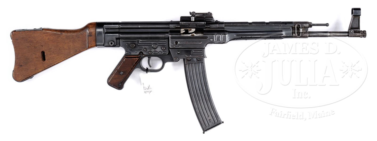 **GERMAN WWII MP 43/1 ASSAULT RIFLE (C&R).SN 1353b. Cal. 8mm Kurz (7.92 x 33mm), bbl 16-1/2″. SN is actually 1353 b, but this weapon is registered simply as 1353. This can be requested to be corrected upon transfer. Gun is clearly stamped on the left side of receiver MP 43/1, and this assault rifle appears to be all matching and was made using subcontracted parts from Mertz-Werke (cos), Erma (WaA 280) and J.P. Sauer with C.G. Haenel final proof (Eagle/37). Hand grip was made by Württembergische Metallwarenfabrik AG (awt). Bolt is early type without cutout and was made by Mauser (ar) as was operating rod. Bbl was made Erma (WaA 280). This lot includes one original German 30-round magazine. Firing mechanism functions smoothly when operated by hand. This weapon appears fully functional. PROVENANCE: The class III weapons formerly on loan to Evergreen Aviation & Space Museum. CONDITION: Overall finish and appearance is very good with about 80% original finish remaining with significant loss to the bbl and gas lock which have thinned to a gray patina. There is considerably more finish on the rest of this arm with scattered spots of bare metal and abrasion. Wooden buttstock and handgrip also show some handling marks, bruises and chips but are still serviceable. Bore has shiny rifling with some pitting near the muzzle and scattered in the grooves. This is a really well made example and a fairly early production gun of the iconic original assault rifle. 4-51780 (15,000-20,000) – Lot 2007