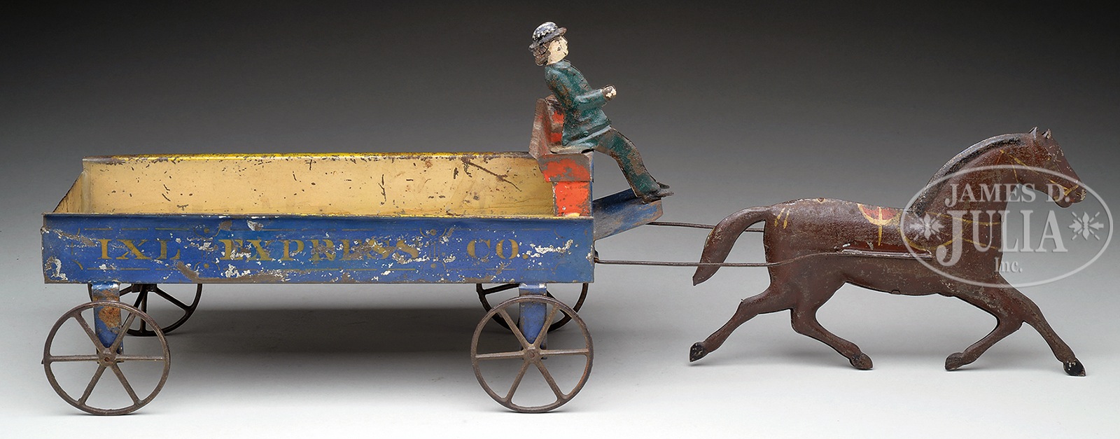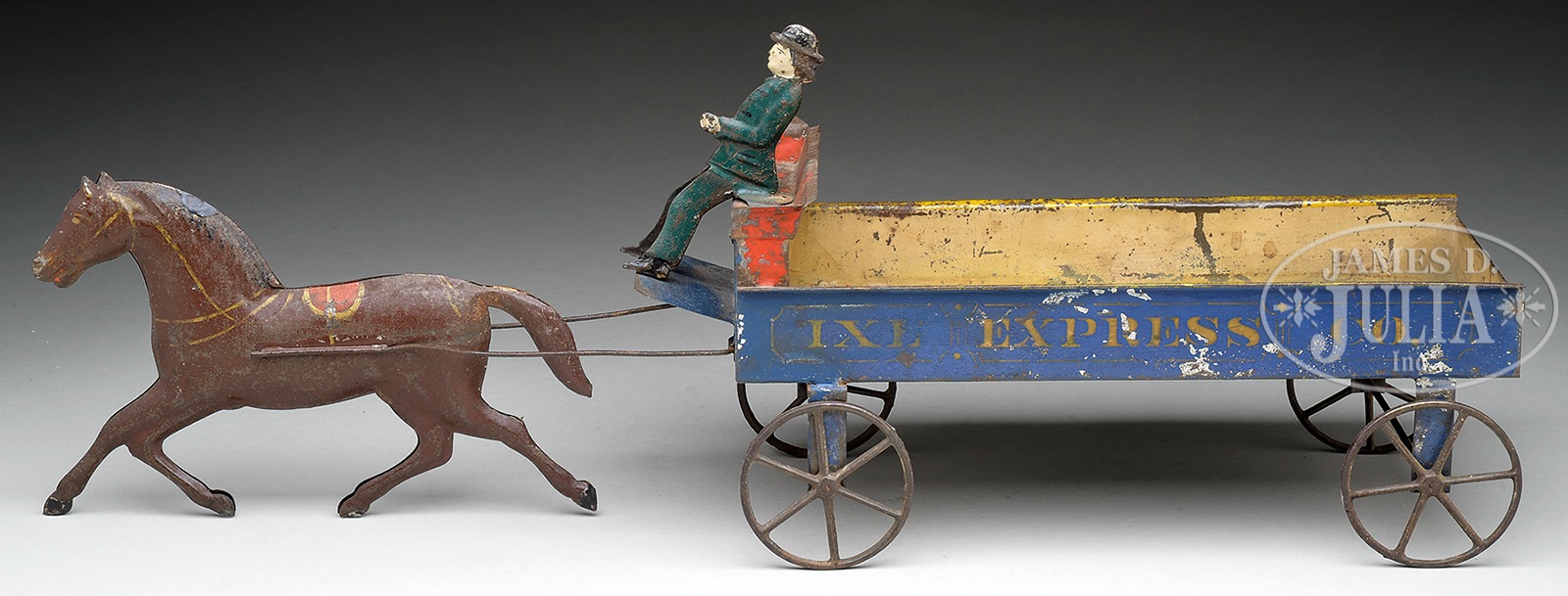 21-1/2″ IXL EXPRESS WAGON.A nice all original example of an early Ives American tin toy from the latter part of the 19th century. The bed of the wagon is a dark blue with gold stenciling, and a brown stud with gold & red highlighting. The driver of the vehicle is not fastened to the seat in the normal manner, but rather by a button type affair with protruding prongs that are bent over on the underside of the tin bench seat. Overall the toy is in good to very good condition with typical/normal paint wear. SIZE: 21-1/2″ l. PROVENANCE: From the Laurence Hapgood Estate. CONDITION: As stated above, perhaps the only fault one could find with this toy is a thin wire between the two inner legs (acting as a wheel/riser) is missing. An easy and no big deal fix! 49003-18 (3,000-5,000) – Lot 2007 Auction: Advertising, Toy & Doll - Spring 2015 Please Note: All prices include the hammer price plus the buyer’s premium, which is paid by the buyer as part of the purchase price. The prices noted here after the auction are considered unofficial and do not become official until after the 46th day. |