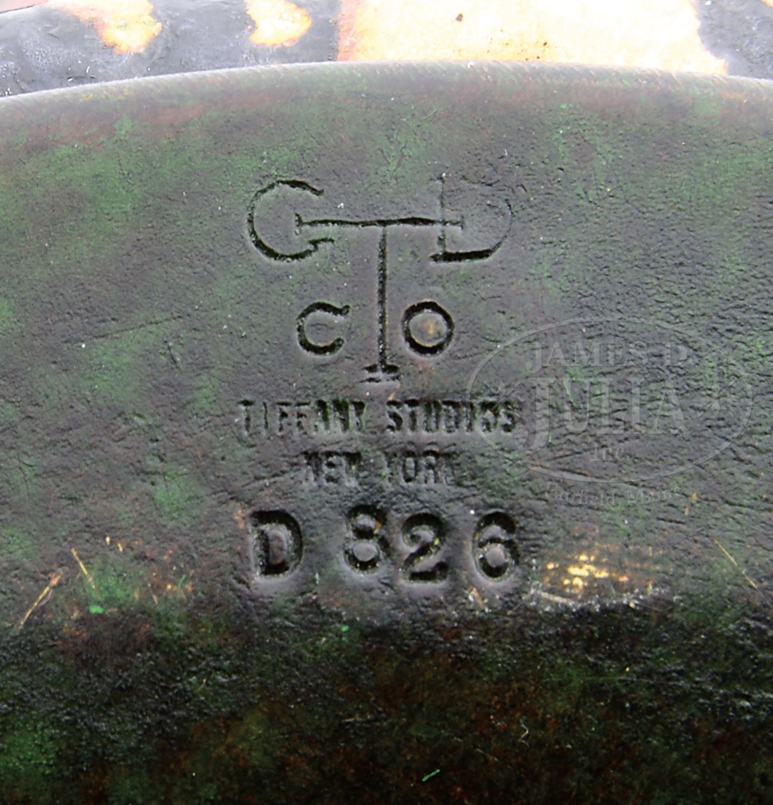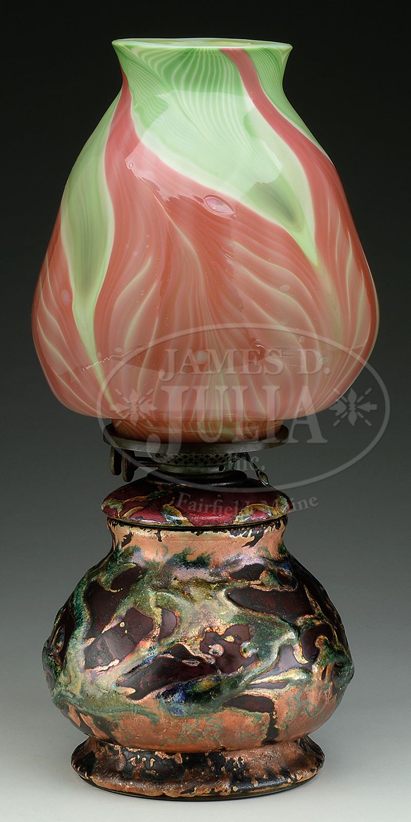 TIFFANY STUDIOS ENAMELED KEROSENE LAMP.Heavily enameled bronze base with stylized free form enamel against bronze background with dark brown patina. Base is complete with electrified duplex burner (base and font not drilled), knobs on wick risers are marked “Tiffany Studios”, base and font are marked on underside “Tiffany Studios New York D826” along with Tiffany Glass & Decorating Co. logo. Base supports large Tiffany shade with pink and green pulled feather design on creamy white background. Shade is unsigned, numbered “o2815”. SIZE: 19-1/4″ t. CONDITION: Lamp is very good to excellent with a small bruise to enameling. 50429-8 (35,000-45,000) – Lot 2007