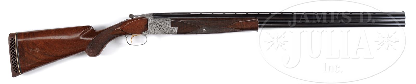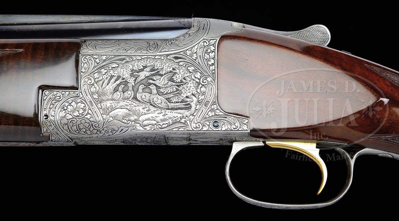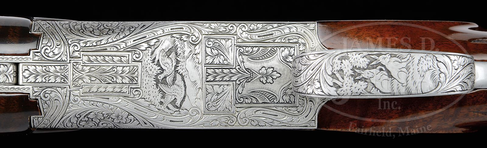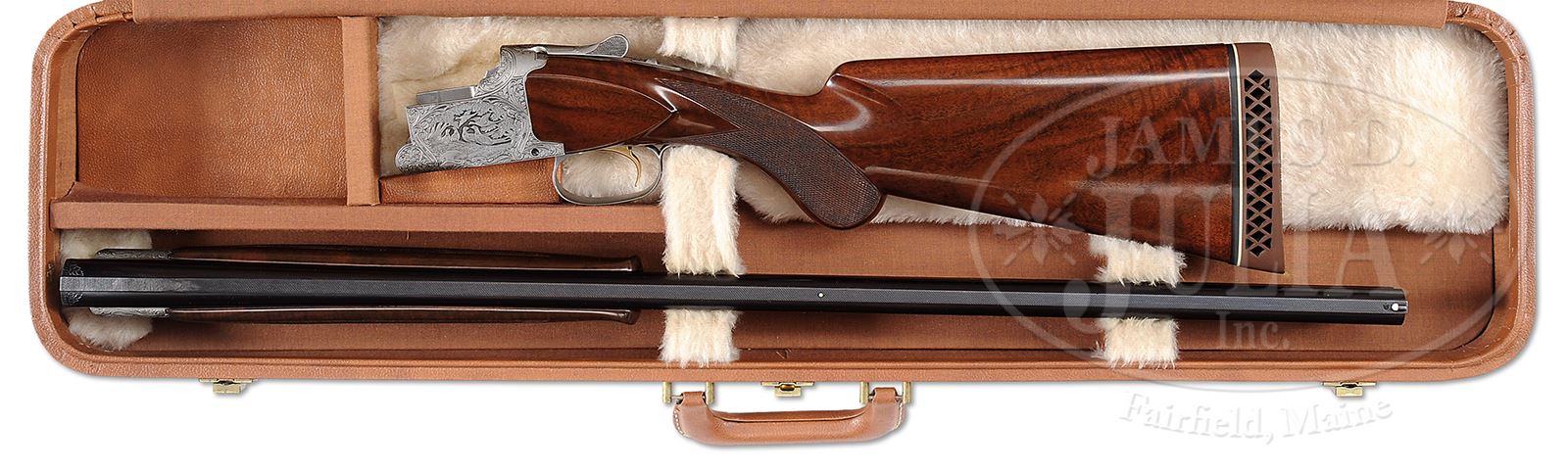 *BROWNING GRADE IV SUPERPOSED ENGRAVED BY V. DOYEN WITH CASE.SN 41048. Cal. 12 ga. 2-3/4″ Chambers. 30″ Bbls marked for full and modified, are fitted with narrow, ventilated rib, marked with Browning St. Louis address with steel and chamber information on left, with Browning patent information and “MADE IN BELGIUM” on right. Coin finished action with non-automatic safety and gold plated single selective trigger, is engraved in what was to become “Diana” style with semi-relief scrolled strapwork with acanthus highlights surrounding game scenes; five pheasant on left side, four mallards on right. A pair of quail fly across bottom of action and two rabbits are on trigger guard bow. Left side scene is signed “V. Doyen”. Interesting fiddle figured American (?) walnut round knob long tang buttstock measures 14-1/2″ over open sided Browning white line pad. Point pattern checkering with line borders is at grip. One piece field forend with schnabeled tip, matches well. Bore diameter: top -.727, bottom -.725. Bore restrictions: top -.020 (mod), bottom -.014 (lt mod). Drop at heel: 2-1/2″, drop at comb: 1-1/2″. Weight: 8 lbs 4 oz. LOP: 14-1/2″. Tan vinyl Browning case is lined in fuzzy faux fur, and has instruction booklet inside. PROVENANCE: Rod Fuller Estate Collection. Special Note: This item contains or is made of ivory. Do not bid on this lot unless you have read and agreed to our "Ivory Position Statement" and the "Waiver of Legal and Financial Risk to James D. Julia in regards to your Purchase of an Ivory Object." This information is located in the front section of our catalog. CONDITION: Excellent, as most likely factory refinished, retaining nearly all of high quality finishes on wood and metal. Markings on bbl are a bit thin. There is some chipping of finish on left side of forend. There are some rubs on gold-plating of trigger. Bores are excellent with some light frosting. Action is tight. Ejectors are strong and in time. Trigger works. Exterior of case is excellent with some light scuffs. Interior cloth shows slight soiling and compressions. Mid bead is “certifiable pre-ban ivory”. 49114-7 MGM159 IVORY (4,000-7,000) – Lot 2008