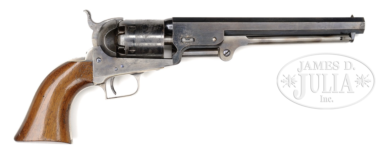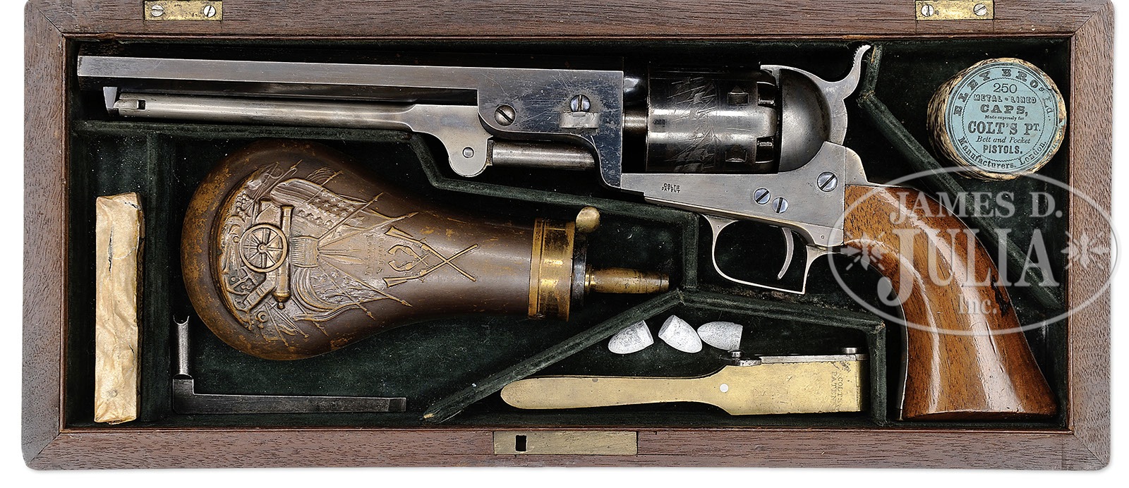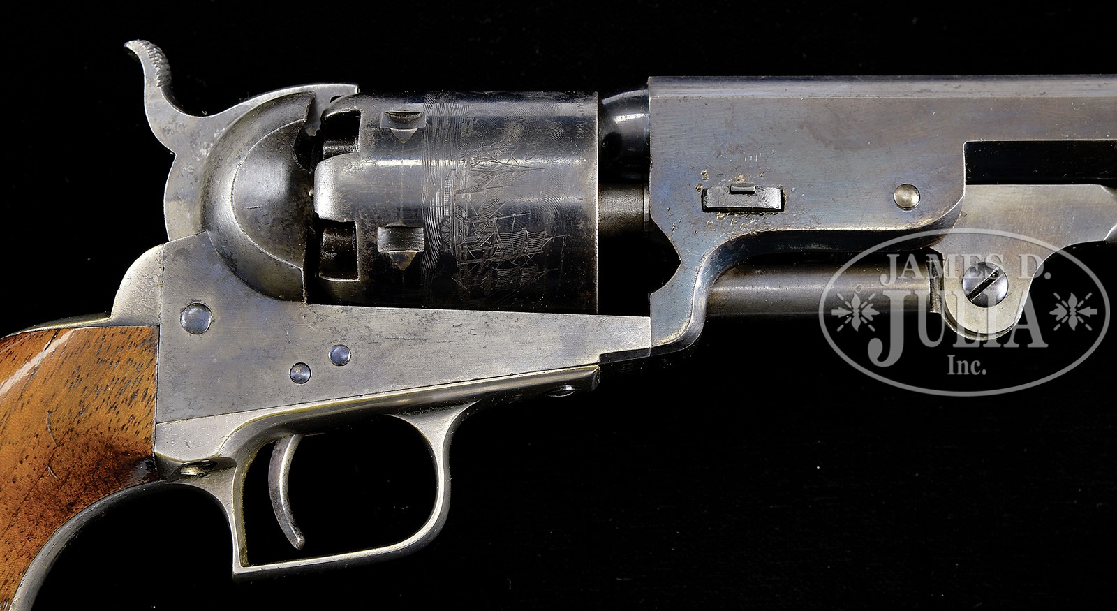 EXTREMELY RARE CASED COLT 2ND MODEL 1851 NAVY PERCUSSION REVOLVER.SN 2211. Cal. 36. Blue and color case hardened with 7-1/2″ oct bbl and 1-line New York City address with dashes. Left side of frame has tiny “COLTS PATENT”. Cyl is usual 6-chambers with Ormsby Naval battle scene roll marking, and 3 serviceable safety pins. The silver plated, square back, small brass trigger guard and backstrap contain a varnished 1-pc walnut grip with last 3-digits of matching SN in backstrap channel. Accompanied by an orig green velvet lined, Colt mahogany casing, compartmented in the bottom for the revolver, a dbl sided “COLTS PATENT” trophy of flags & arms, angled spout flask, and an early brass 2-cavity bullet mold with straight legs, a bright metal sprue cutter, marked on the right side “COLTS PATENT”, an “L” shaped nipple wrench, a blue paper wrapped tin of Eley’s caps and a packet of combustible cartridges. According to various publications there were about 3,000 2nd Model 51 Navy revolver produced. The primary differentiation between 1st & 2nd models is the wedge screw being over the top of the slot and the cyl spindle slotted through the center. Other than that they are otherwise indistinguishable. The early 51’s were all rapidly purchased by pioneers moving west or by those already on the western frontier where they usually saw hard and continuous service. They served throughout the Civil war and later back on the frontier well into the 1870’s and 1880’s until supplanted by cartridge revolvers. They were used by law men, outlaws and common citizens to great affect with such luminaries as Buffalo Bill Cody and Wild Bill Hickock, who was recorded as having carried a pair of Navies. Cased examples are extraordinarily rare. This revolver is pictured on pg. 88 as the bottom photograph in the book The Wm. M. Lock Collection, Sellers. PROVENANCE: Wm. M. Locke Collection; George Lewis Collection; The William Gerber Family Collection. CONDITION: Extremely fine, all matching including rammer, wedge, cyl and grip. Bbl retains 92-93% glossy orig blue with only sharp edge wear and some light flaking with a spot of rust on the right side of the muzzle. Frame retains about all of its traditionally muted orig case colors. Hammer retains strong case colors, partially faded on top edge. Cyl retains about 80% orig blue, showing wear around the front edge and dulling and wear around the rear shoulder and shows about 96-97% Ormsby Naval battle scene roll marking. Trigger guard and backstrap retain about all of their strong orig silver, showing wear at the heel. Grip is sound with one small gouge and retains most of its orig varnish. Mechanics are crisp, bright shiny bore with scattered light pitting. Case has a compression fracture in the lid and a grain check in the bottom, otherwise is completely sound with storage handling nicks & scratches and retains most of its orig varnish. Lining in the lid is strong and bright with one spot of stain, with contact with the cyl, bottom is lightly to moderately faded with moderate soil and wear from contact with the bbl, cyl and edge of grip. Flask is fine with no dents and retains about 60% orig finish. Mold is very fine with bright metal sprue cutter and some light hammer marks on the right side. Other accessories are fine. Cap tin has slight loses from the paper wrap but it is still sealed. (WG-024) 4-51048 JR507 (60,000-100,000) – Lot 2010