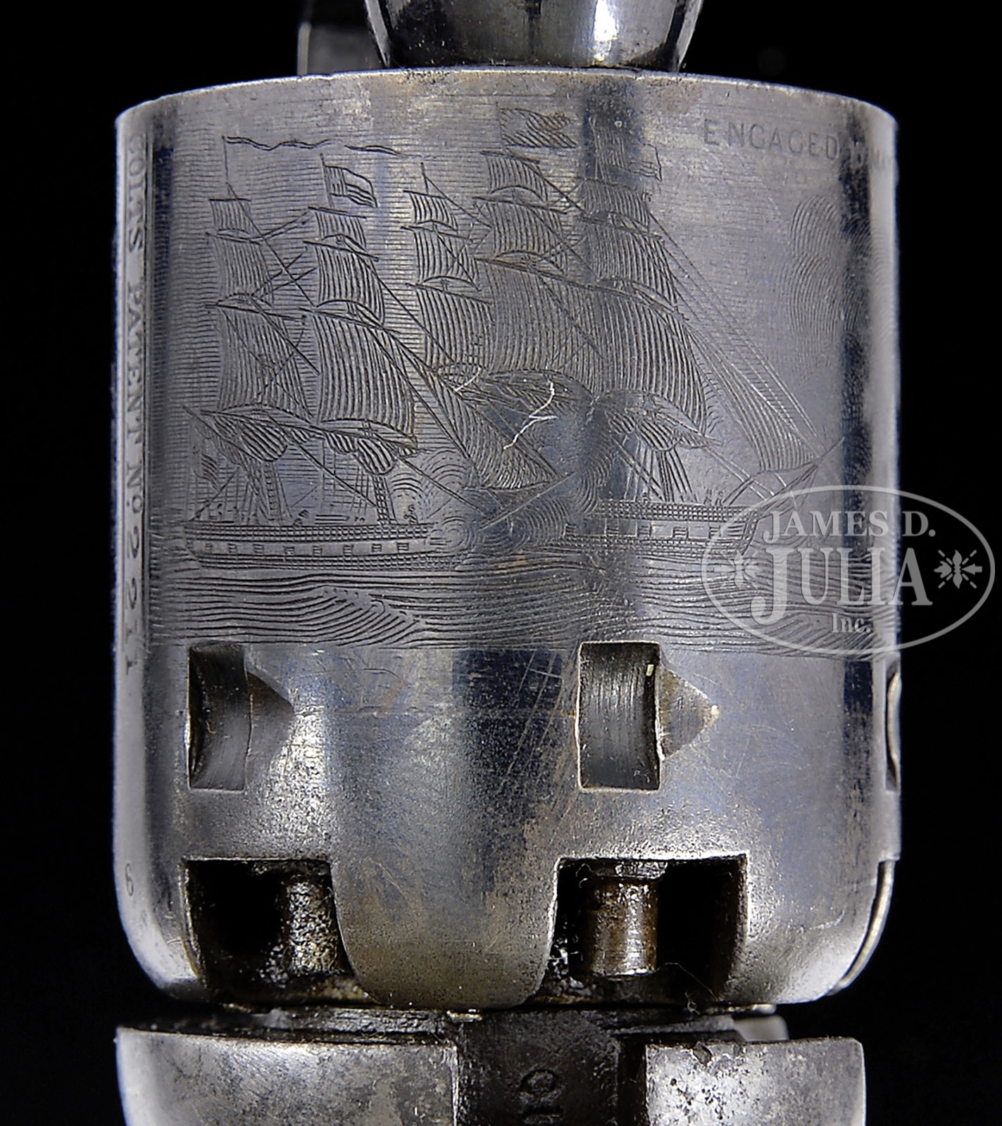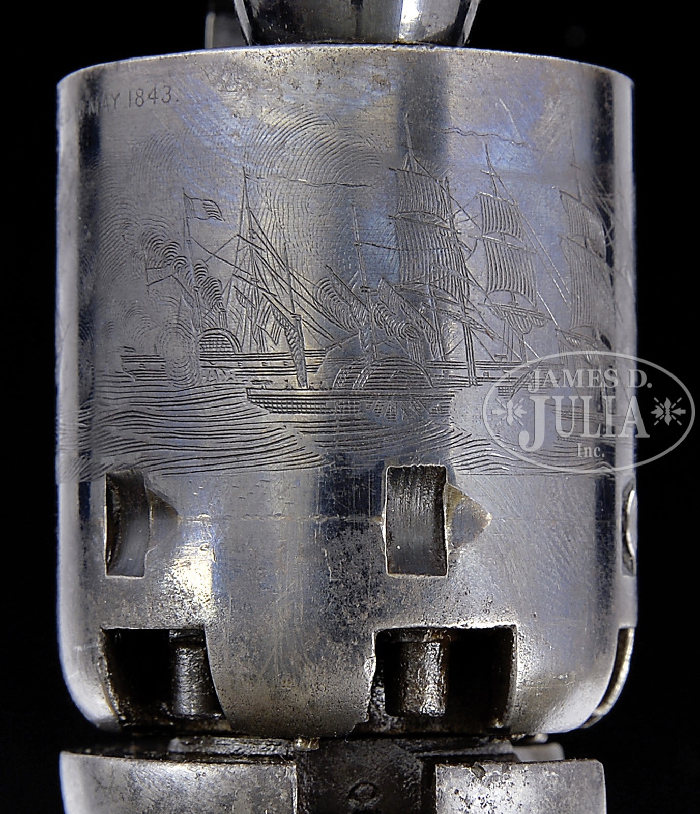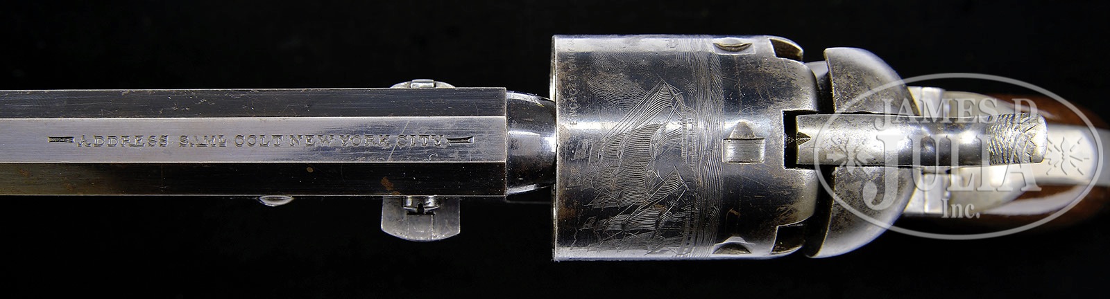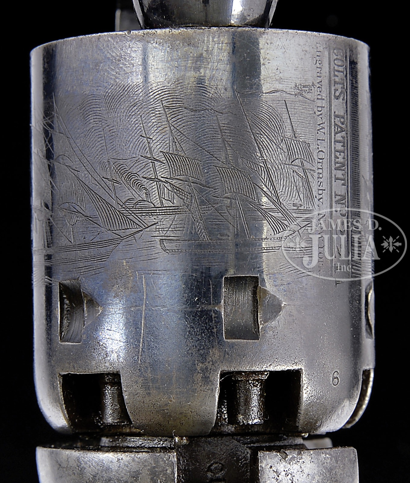 EXTREMELY RARE CASED COLT 2ND MODEL 1851 NAVY PERCUSSION REVOLVER.SN 2211. Cal. 36. Blue and color case hardened with 7-1/2″ oct bbl and 1-line New York City address with dashes. Left side of frame has tiny “COLTS PATENT”. Cyl is usual 6-chambers with Ormsby Naval battle scene roll marking, and 3 serviceable safety pins. The silver plated, square back, small brass trigger guard and backstrap contain a varnished 1-pc walnut grip with last 3-digits of matching SN in backstrap channel. Accompanied by an orig green velvet lined, Colt mahogany casing, compartmented in the bottom for the revolver, a dbl sided “COLTS PATENT” trophy of flags & arms, angled spout flask, and an early brass 2-cavity bullet mold with straight legs, a bright metal sprue cutter, marked on the right side “COLTS PATENT”, an “L” shaped nipple wrench, a blue paper wrapped tin of Eley’s caps and a packet of combustible cartridges. According to various publications there were about 3,000 2nd Model 51 Navy revolver produced. The primary differentiation between 1st & 2nd models is the wedge screw being over the top of the slot and the cyl spindle slotted through the center. Other than that they are otherwise indistinguishable. The early 51’s were all rapidly purchased by pioneers moving west or by those already on the western frontier where they usually saw hard and continuous service. They served throughout the Civil war and later back on the frontier well into the 1870’s and 1880’s until supplanted by cartridge revolvers. They were used by law men, outlaws and common citizens to great affect with such luminaries as Buffalo Bill Cody and Wild Bill Hickock, who was recorded as having carried a pair of Navies. Cased examples are extraordinarily rare. This revolver is pictured on pg. 88 as the bottom photograph in the book The Wm. M. Lock Collection, Sellers. PROVENANCE: Wm. M. Locke Collection; George Lewis Collection; The William Gerber Family Collection. CONDITION: Extremely fine, all matching including rammer, wedge, cyl and grip. Bbl retains 92-93% glossy orig blue with only sharp edge wear and some light flaking with a spot of rust on the right side of the muzzle. Frame retains about all of its traditionally muted orig case colors. Hammer retains strong case colors, partially faded on top edge. Cyl retains about 80% orig blue, showing wear around the front edge and dulling and wear around the rear shoulder and shows about 96-97% Ormsby Naval battle scene roll marking. Trigger guard and backstrap retain about all of their strong orig silver, showing wear at the heel. Grip is sound with one small gouge and retains most of its orig varnish. Mechanics are crisp, bright shiny bore with scattered light pitting. Case has a compression fracture in the lid and a grain check in the bottom, otherwise is completely sound with storage handling nicks & scratches and retains most of its orig varnish. Lining in the lid is strong and bright with one spot of stain, with contact with the cyl, bottom is lightly to moderately faded with moderate soil and wear from contact with the bbl, cyl and edge of grip. Flask is fine with no dents and retains about 60% orig finish. Mold is very fine with bright metal sprue cutter and some light hammer marks on the right side. Other accessories are fine. Cap tin has slight loses from the paper wrap but it is still sealed. (WG-024) 4-51048 JR507 (60,000-100,000) – Lot 2010