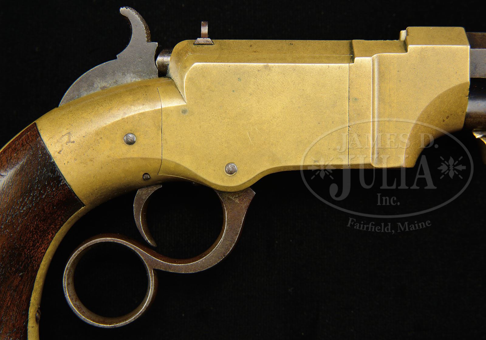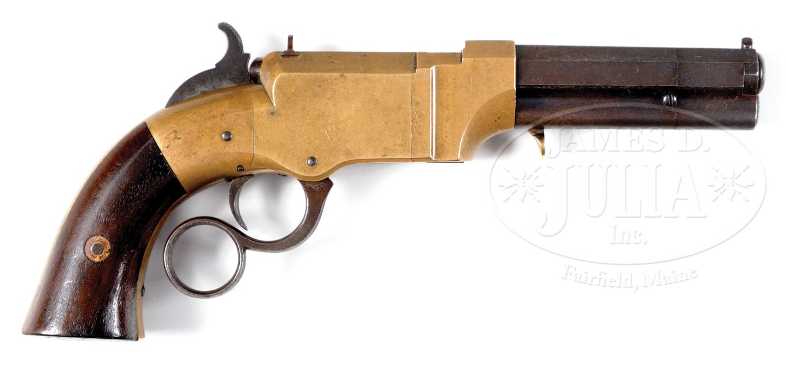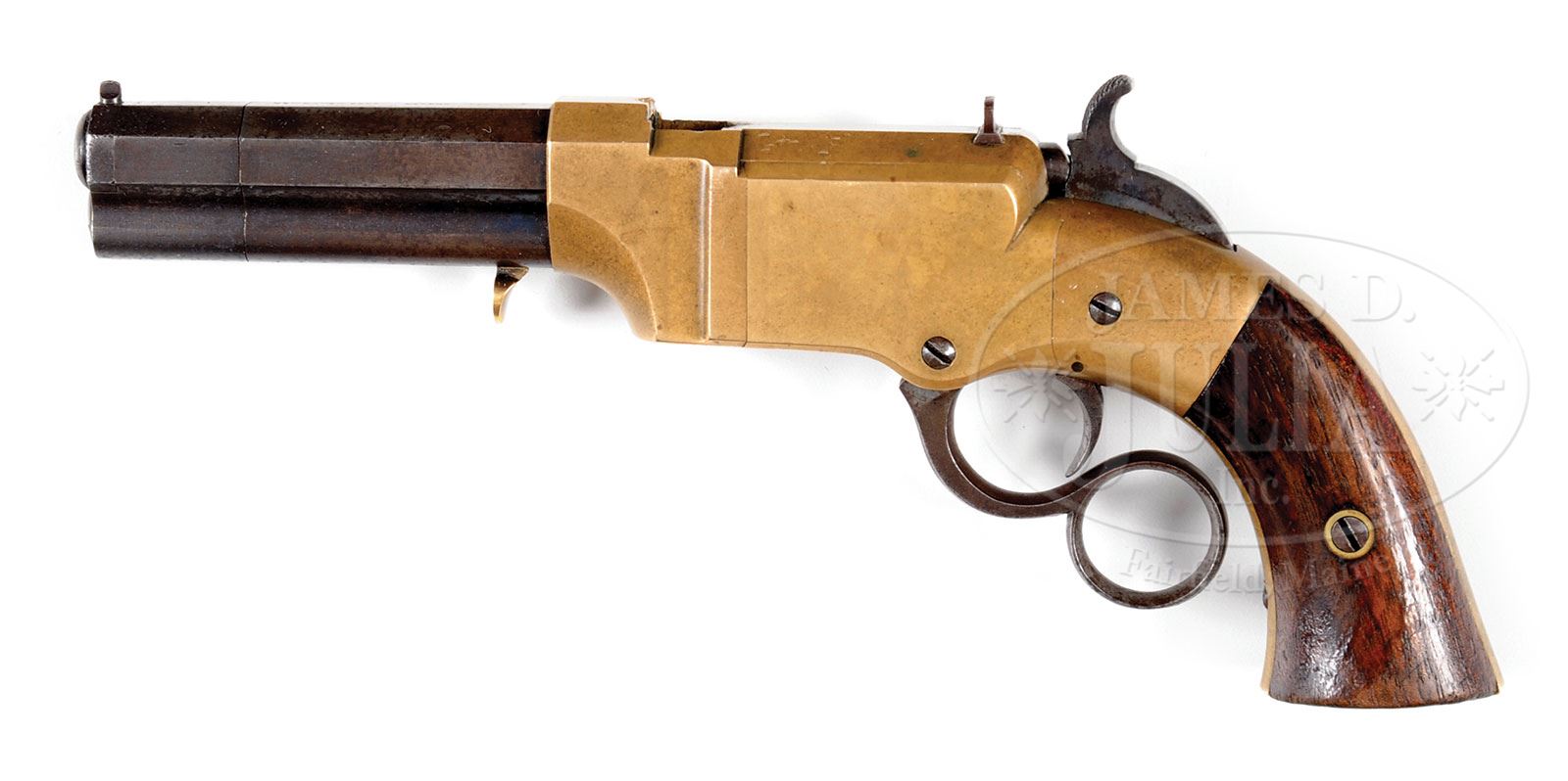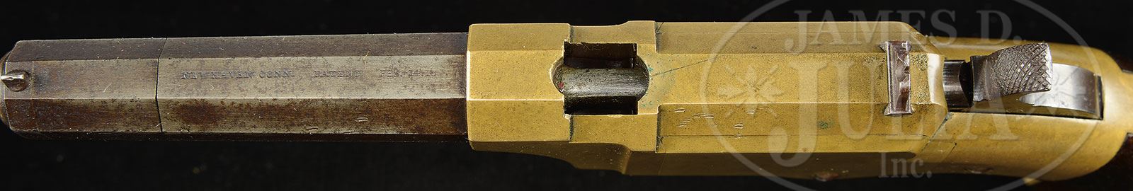 SCARCE NEW HAVEN ARMS NUMBER 1 POCKET VOLCANIC LEVER ACTION PISTOL.SN 172. Cal 31. Usual configuration with 3-3/4″ oct bbl that has integral magazine and pinched post front sight. Fixed rear sight is in a dovetail in top flat of frame. Top flat of bbl has a 1-line New Haven address. Mounted with 2-pc smooth walnut grips matching numbered to this pistol. According to Flayderman’s Guide to Antique American Firearm there were only about 850 of these little pistols produced in the period 1857-1860. This design was descended from the earlier Smith & Wesson lever action pistols and the cartridge from the still earlier Hunt Rocket Ball Cartridge. Oliver Winchester had purchased the Volcanic Arms Co. and continued production until 1860. The design then evolved into the Model 1860 Henry rifle, the first truly successful lever action repeating cartridge rifle, and from there, in 1866 became the Winchester Repeating Arms Co. And as the saying goes, the rest is history. CONDITION: Very good. SN was observed on the frame and grips, no additional disassembly was effected to check for other matching numbers. Bbl retains blue in the gullets with faint blue mixed with plummy patina over the remainder of the bbl and magazine, all with light surface pitting. Frame and side plates retain sharp edges with a few small nicks on the top left side flat and shows a medium to dark mustard patina. Magazine spring is a replacement. Mechanics are fine. Bright shiny bore with two or three small spots of pitting. Grips are sound with some scattered hammer marks on bottom edges showing moderate wear and retain most of an old finish. 4-54293 (9,500-14,500) – Lot 2010