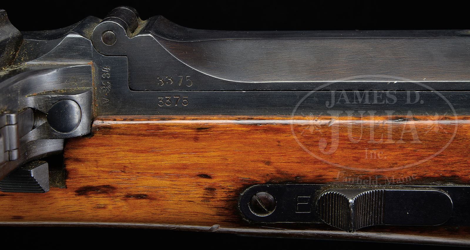 **STEYR MP 34ö SUBMACHINE GUN IN 9MM MAUSER (C&R).SN 3375. Cal. 9mm Mauser, bbl 8-1/4″. Currently showing registered as M-37. This can be requested to be corrected upon transfer. This early production model of the milled steel Steyr submachine gun and has the safety just forward of the trigger guard with German semi and full markings on selector switch of stock assembly. Year of manufacture is visible on left side of receiver next to Austrian Eagle proofmark. Cal marking underneath rear sight. Bolt does not match receiver number (3044). This lot includes two 9mm Mauser 32 round magazines. Bbl does not match receiver. Wooden stock of the swept-back type and stock SN does not match receiver. Firing mechanism functions smoothly when operated by hand. This weapon appears fully functional. PROVENANCE: The class III weapons formerly on loan to Evergreen Aviation & Space Museum. CONDITION: Overall finish and appearance near excellent as refinished, over 95% dark blue finish with some washing of the markings due to buffing and some pitting in evidence underneath the refinish. Wood stock also has been sanded but SN is still barely legible on left side. There has also been some wood filler applied just above the trigger assembly. Bore has worn lands with some pitting in the grooves. Bolt face has some corrosion around the edges. These Steyr submachine guns are of a high quality manufacture and were among the last of the milled steel submachine guns. 4-51775 (8,000-12,000) – Lot 2011
