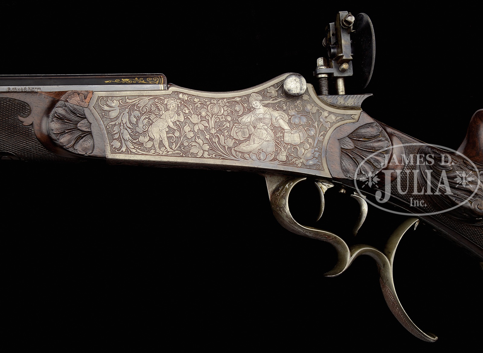 *FINE OLD STAHL MARTINI.SN 930. Cal. 8.15x46R. The Stahl Martinis were quite popular but just a few were made in this quality. The action is a take down and is engraved on one side with the Schuetzen Liesl and a cherub; the other with an old-time target shooter holding an ancient rifle and another cherub holding a bow. The bottom of the action is engraved with the owner’s family coat-of-arms. The bottom of the trigger guard has an indecipherable monogram of the owners initials. Correct front and rear sights are present but the bbl sight is missing. The bbl is 29-1/4″ long and gold inlays and a cherub inlaid in platinum are just in front of the action on the top of the fluted bbl. The buttstock is of unusually fine wood and beautifully carved. The left side is carved in deep relief with flowers, vines and leaves. Also on top of the bbl is the retailer’s name “D.A. Nohascheck Mainz”. The right side shows a lady in clothing from the middle ages holding a goblet. The buttstock was made for a left handed shooter. The forearm end is horn polished bone. PROVENANCE: Classic German Target Arms pages 38-41. The Allen Hallock Collection. CONDITION: Overall in fine condition. The buttplate shows most of its orig bright case color, the colors on the action have faded. The bore is to be excellent. Close inspection shows both sides of the forearm have had replacement wood inserted where the orig wood was split away. 50900-11 TWR (2,000-5,000) C&R – Lot 2011