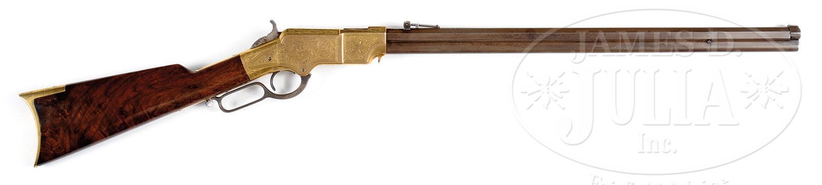 SCARCE HOGGSON ENGRAVED HENRY MODEL 1860 LEVER ACTION RIFLE.SN 6464. Cal. 44 RF Henry. Beautiful Henry rifle with 24-1/4″ oct bbl that has integral magazine with late style, square back, nickel silver front sight and 900 yd Henry ladder rear sight with no rear dovetail in top of receiver. Mounted with unusual highly figured, uncheckered burl American walnut with straight stock and late style crescent buttplate with pointed heel. Serial number was observed in the usual places on the top bbl flat between the rear sight & receiver, left side of lower tang under the wood, top tang channel of buttstock and inside toe of buttplate. Left side of upper tang, under the wood is stamped “FG”. Round portion of the bbl, under loading sleeve is marked with assembly number “180” which number is also found on rear face of loading sleeve. Left side of buttstock and bbl have factory sling swivels. Receiver, sideplates and buttplate tang are engraved in typical Hoggson patterns of a bird dog on point on the left side surrounded by foliate arabesque patterns. Right side has matching foliate arabesque patterns with his trademark large flower blossoms on front side flats. Engraving extends over the top three flats of the receiver ring and top of receiver, along with the top tang and buttplate tang. Receiver and buttplate are gold plated. The Henry rifle was introduced just at the beginning of the Civil War. The government purchased about 1,700 of these rifles in two different series and several state units were armed with them. Numerous other individuals made private purchases and the government supplied the ammunition. Most of these rifles saw extensive hard service throughout the Civil War and later on the American Frontier and were used well into the 1870’s and 1880’s before being replace by center fire rifles. A large proportion of these rifles found their way into Mexico, South and Central America where they remained in service even longer. Rarely are they found with high orig finish or an orig configuration. CONDITION: Fine to very fine, all matching, as noted above. Bbl and mag tube retain faint traces of finish in the most sheltered areas, being an overall cleaned light brown patina with very sharp edges. Receiver and sideplates retain about 75% gold finish that may be an old period of use restoration. The exposed areas are a medium mustard patina. Buttplate retains most of its gold finish and may be an old restoration. Stock has chipped toe, otherwise wood is sound with a couple of small dings and retains most of a fine restored finish. Mechanics are fine. Strong bore with heavy pitting. 4-47901 JR249 (20,000-35,000) – Lot 2013