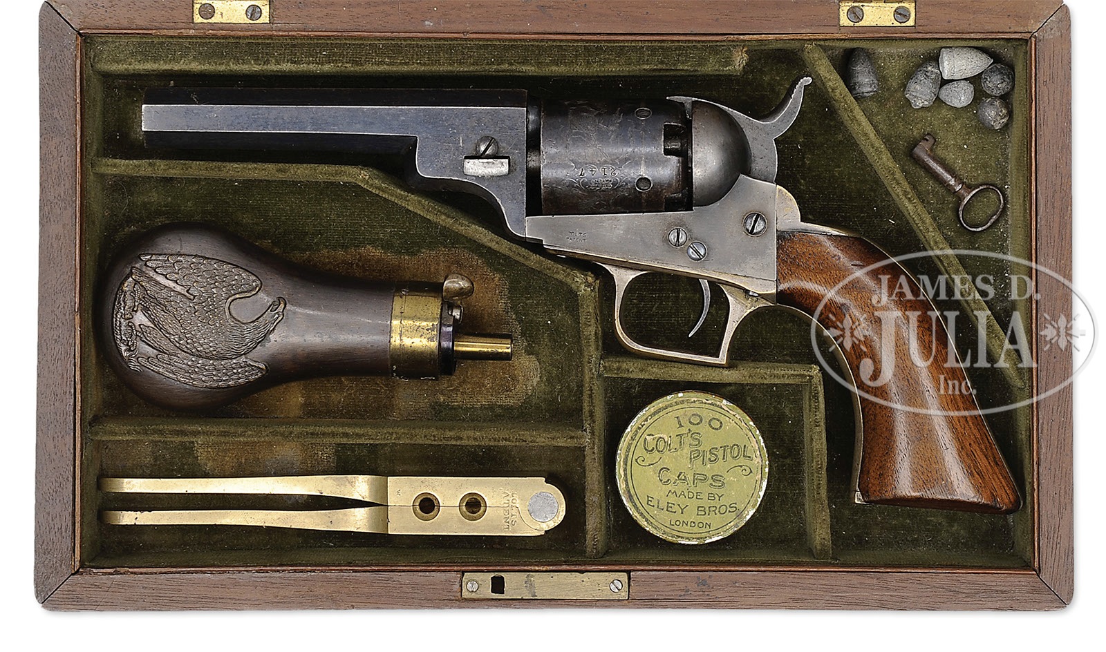 RARE CASED BABY DRAGOON PERCUSSION REVOLVER.SN 2147. Cal. 31. Blue & color case hardened with 4″ oct bbl, brass pin front sight and 2-line New York City address with brackets. Left side of frame has a tiny “COLTS PATENT”. Cyl has 5 chambers with its orig, crisp safety pin and Dragoon/Indian fight scene roll marking. Cyl has rnd stop notches and left hand panel marked in tiny letters “COLTS PATENT” the same size as is on the frame, over the matching SN. The silver plated, square back, brass trigger guard & backstrap contain a varnished 1-pc walnut grip with obscured number in the backstrap or buttstrap channels. Although the grip has no visible number, there is little doubt that it is orig to this revolver. Accompanied by a green velvet lined, mahogany casing, compartmented in the bottom for the revolver, an early dbl sided eagle flask, a brass 2-cavity “COLTS PATENT” mold without sprue cutter, a small tin of Eley’s caps and a functioning key. The Baby Dragoon was Colt’s first attempt at a pocket sized revolver after the cessation of production of the Paterson line. It was introduced near the beginning of the great Westward expansion and the 49er miners where it became extremely popular. These little revolvers, in a variety of bbl lengths, saw hard & continuous service from introduction right through the Civil War, well into the 1870s. They are rarely found today with any orig finish and cased examples are extremely rare. There were fewer than 15,000 of these little revolvers produced 1847-1850. PROVENANCE: The William Gerber Family Collection. CONDITION: Very fine, all matching including wedge & cyl, except grip as noted. Bbl retains about 95% strong orig blue with light sharp edge wear and a couple of scratches with some minor flaking and some light nicks around the wedge slot; frame retains 80-85% orig case colors which are traditionally muted; hammer retains mottled, dark case colors; cyl retains 65-70% orig blue and shows about 95% Dragoon/Indian fight scene roll marking; trigger guard retains strong silver on the trigger plate and front & rear ends of the trigger bow with the front strap a light brass patina; backstrap retains silver in sheltered areas and on the buttstrap. Grip has chipped toes with light wear on the edges and retains most of its orig varnish. Mechanics are crisp, bright shiny bore with scattered pitting. Case has three fine cracks across the lid, otherwise is sound with light handling & storage nicks & scratches and retains virtually all of its orig varnish; lining in the lid is lightly faded & soiled; bottom is moderately faded with heavy soil under the revolver and a large stain under the flask area; flask retains about 95% strong orig finish; mold is equally new with a few light nicks & dings; cap tin is fine. (WG-019) 4-51052 JR499 (20,000-40,000) – Lot 2014