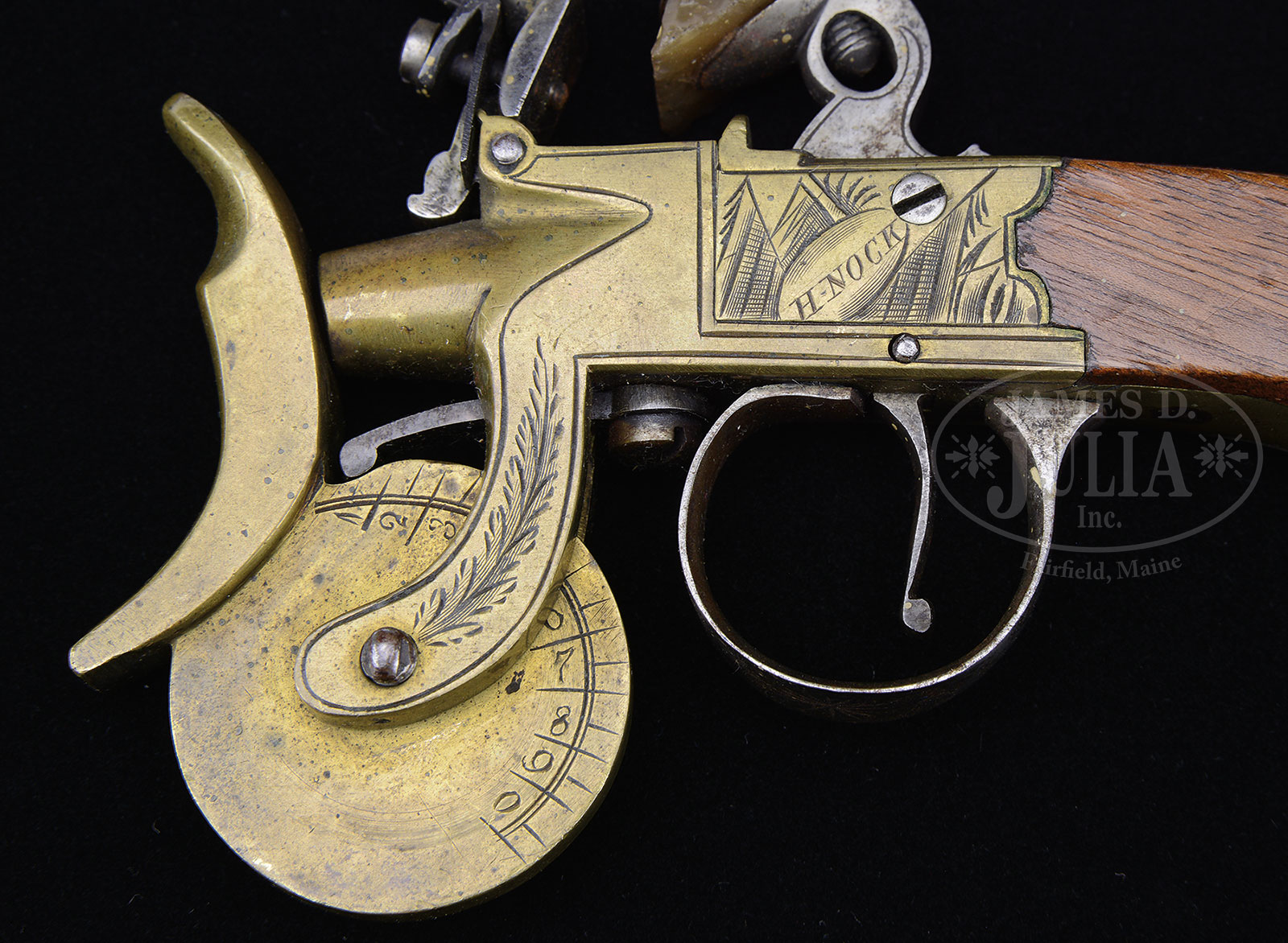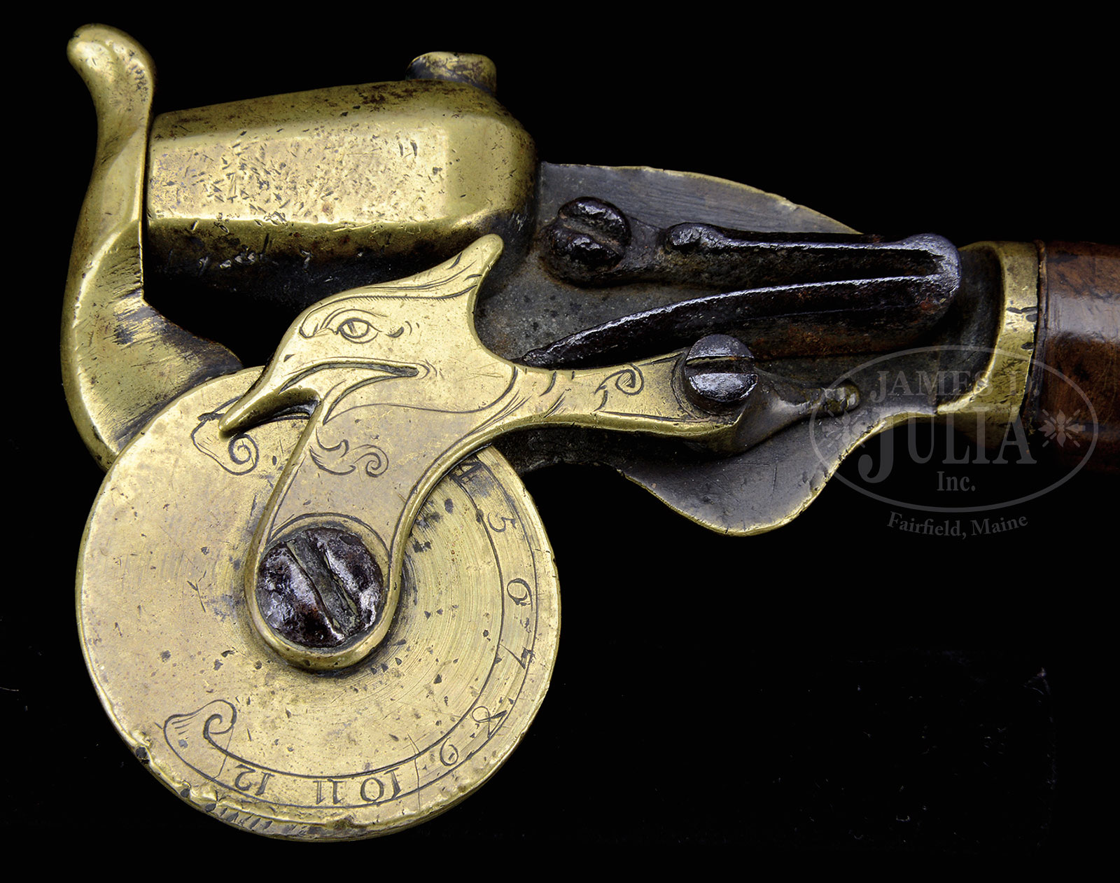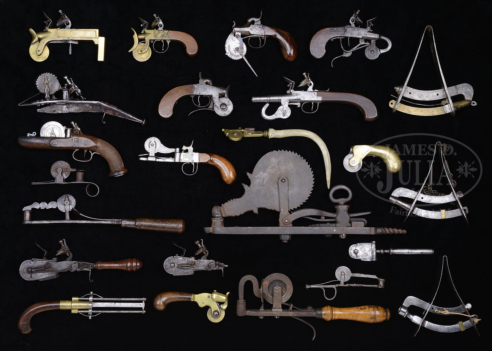 LIFE LONG COLLECTION AND PROBABLY LARGEST GROUP KNOWN OF 18TH & 19TH CENTURY FLINTLOCK GUN POWDER TESTERS WITH PROVENANCE.Most every type of powder tester seen is represented here. Many are actual examples pictured in the definitive text: Eprouettes, a Comprehensive Study of Early Devices for the Testing of Gunpowder, RTW Kempers, published by Royal Armouries, 1998. Kempers notes several examples in collection are unique or no other examples outside certain museum collections. Testers are also shown in the article “Powder Testers The Combinations” By Paul J. Wolf. Copies of the book and article accompanies the lot. Many were used by armories and are very well made. Very few are marked other than having numeric ranges for the gun powder testing. There are all-iron examples, some with touch-holes for fire and others with complete flintlock mechanisms, three large spring loaded types have French makers or inspector marks. Some are crafted by gunsmiths or blacksmiths. Several are made in the style of single shot pistols which are the most often seen. There are also five made totally of brass of which one is dated 1852 and very heavily cast. Another of the all brass ones has a short cannon barrel with touch-hole and the pointer that reads the gauge is in the shape of a birds beak. There is a solid brass example which is maker marked by Henry Nock, London. Detailed pictures of every example will be on-line. This is a once in a lifetime opportunity to buy the best collection of handheld powder testers that we know of ever assembled. PROVENANCE: The Estate of Morris Racker. CONDITION: Overall very good. No restoration noted, though a few examples may be old facsimiles as these were very popular as novelties and curiosa collected in the early-20th century. All in all, this is a fine representative grouping that most appear original. 51956-57 (8,000-10,000) – Lot 2014