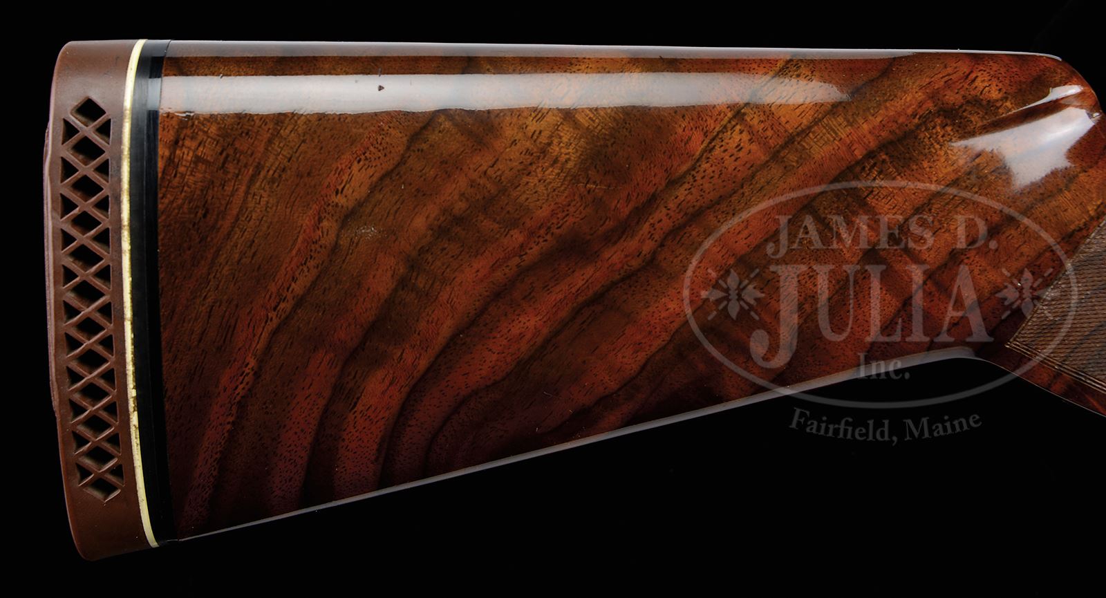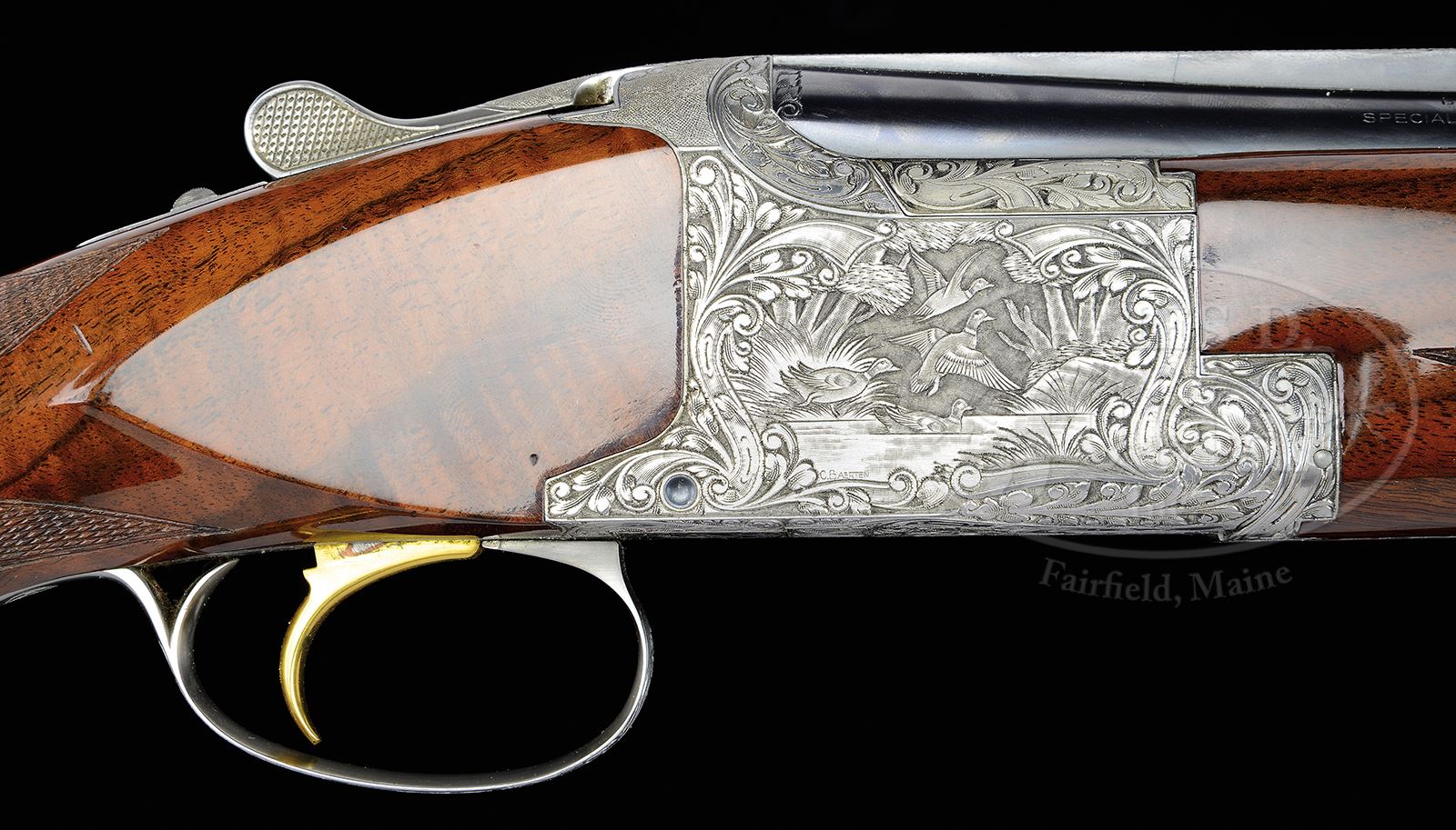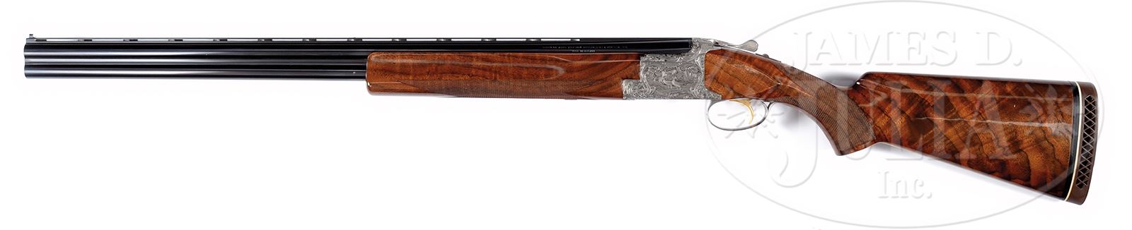 *BROWNING DIANA GRADE SUPERPOSED TWO BARREL SKEET SET ENGRAVED BY BAERTEN WITH CASE.SN 14976S73. Cal. 12 ga. 2-3/4″ and 20 ga. 3″ Chambers. 28″ Bbls marked for skeet and skeet, with matted, ventilated ribs have Browning Morgan Utah and Montreal addresses. Coin finished action is engraved in usual “Diana” fashion, with five pheasants in woodland background on left; quattro of ducks at pond on right; indeterminate gallinaceous fowl flying across bottom; and a pair of rabbits on trigger guard. Engravers signature, C. Baerten, is on both side scenes. Fine stump figured claro walnut long tang, square knob buttstock measures 14-1/2″ over Browning open sided white line pad, and features standard Diana pattern checkering with curved line borders. Flared beavertail forends match well. 12 ga.: Drop at heel: 2-7/8″, drop at comb: 1-7/16″. Weight: 7 lbs. 5 oz. LOP 14-1/2″. 20 ga.: Drop at heel: 1-15/16″, drop at comb: 1-1/2″. Weight: 7 lbs. 7 oz. LOP 14-1/2″. Tan vinyl Browning case lined in faux fur with space for action and both bbl sets, contains instruction booklet. PROVENANCE: Rod Fuller Estate Collection. Special Note: This item contains or is made of ivory. Do not bid on this lot unless you have read and agreed to our "Ivory Position Statement" and the "Waiver of Legal and Financial Risk to James D. Julia in regards to your Purchase of an Ivory Object." This information is located in the front section of our catalog. CONDITION: Excellent, near new, showing slight evidence of use, with only a few handling and assembly marks on wood and metal. Gold of trigger is excellent, rubbed on right side. Mechanically crisp. Case is excellent with a few light scuffs. Interior is lightly soiled. Mid bead is “certifiable pre-ban ivory”. 49114-31 MGM168 IVORY (6,500-9,500) – Lot 2015