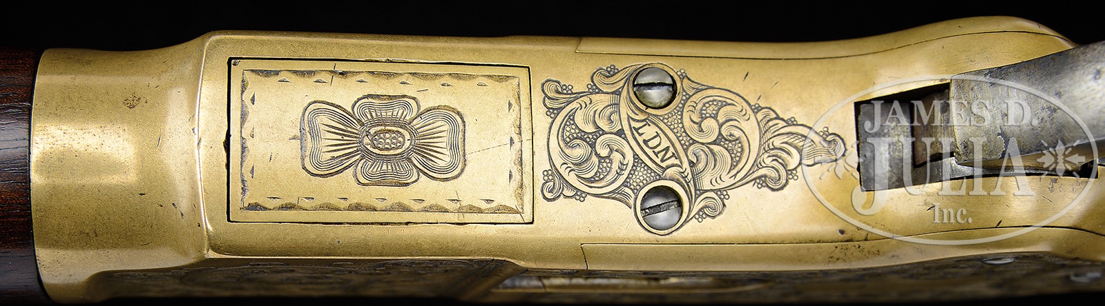 RARE NIMSCHKE-STYLE ENGRAVED WINCHESTER MODEL 1866 LEVER ACTION RIFLE.SN 20927. Cal. 44 CF. Early standard grade ’66 rifle that has been after market engraved. It has 24-1/4″ oct bbl, full magazine, slightly altered front sight and 900 yard Henry ladder rear sight with slide-stop screw. Top flat of bbl is marked with the Henry’s & King’s patent 2-line address. Mounted with uncheckered, nicely figured American walnut with straight stock and brass crescent buttplate with trap. Bottom of stock & forend cap have factory sling swivels. Receiver, forend cap & buttplate tang are modern engraved in the style of L. D. Nimschke with about full coverage, foliate arabesque patterns with pearled background on the sides. Left side plate is engraved with a Mexican eagle. Engraving extends over top of receiver, top and bottom tangs & bottom of receiver with the spurious initials “LDN” engraved on a ribbon between timing screws. Sides of the forend cap & buttplate tang are engraved to match. SN is found on the bottom tang with matching number in top tang channel of buttstock & inside toe of buttplate. PROVENANCE: Paul Tudor Jones II Collection. CONDITION: Very good, all matching as noted. Bbl & magazine tube retain a thin, artificially aged brown patina with light nicks & dings. Front sight is altered and has been staked in place. Rear sight is a modern reproduction. Receiver, forend cap & buttplate show light to moderate edge wear and overall retain a medium mustard patina. Wood is sound with a few light bruises and overall retains a professionally restored finish. Bottom tang screw is a replacement. Mechanics are a little loose. Worn bore with moderate to heavy pitting. 49941-21 JR66 (4,000-7,000) – Lot 2015