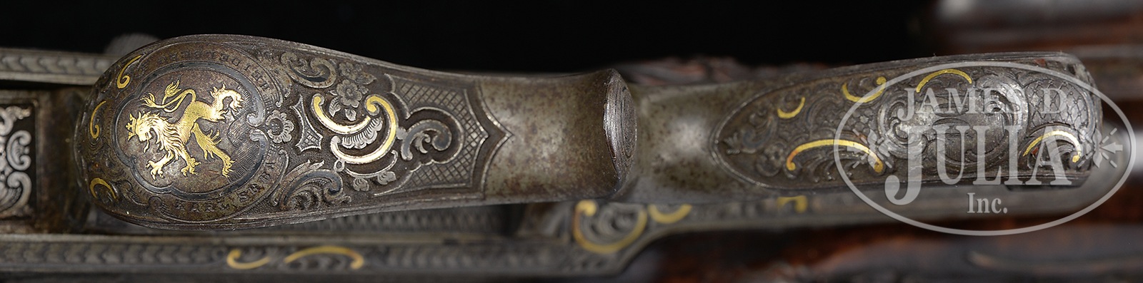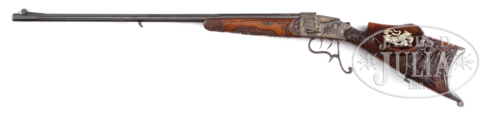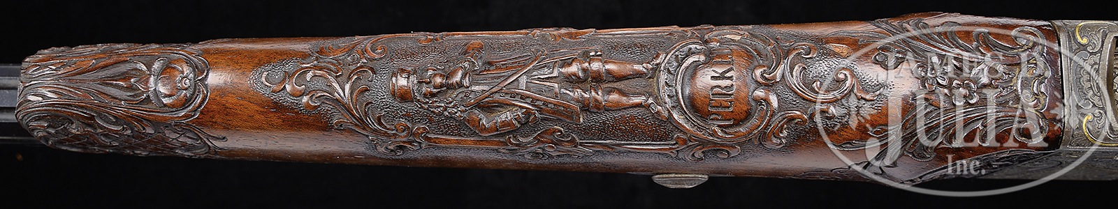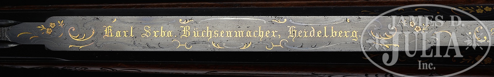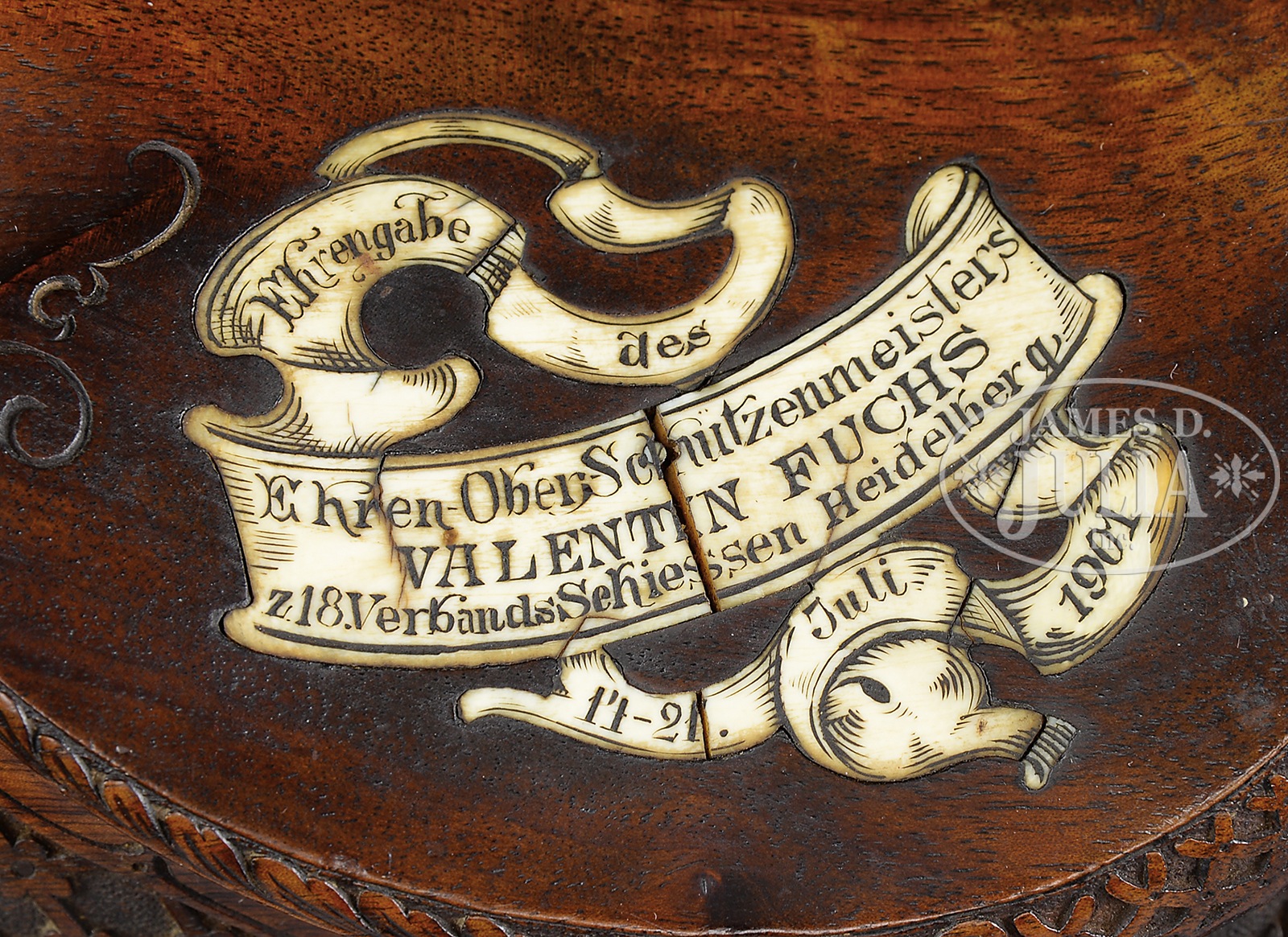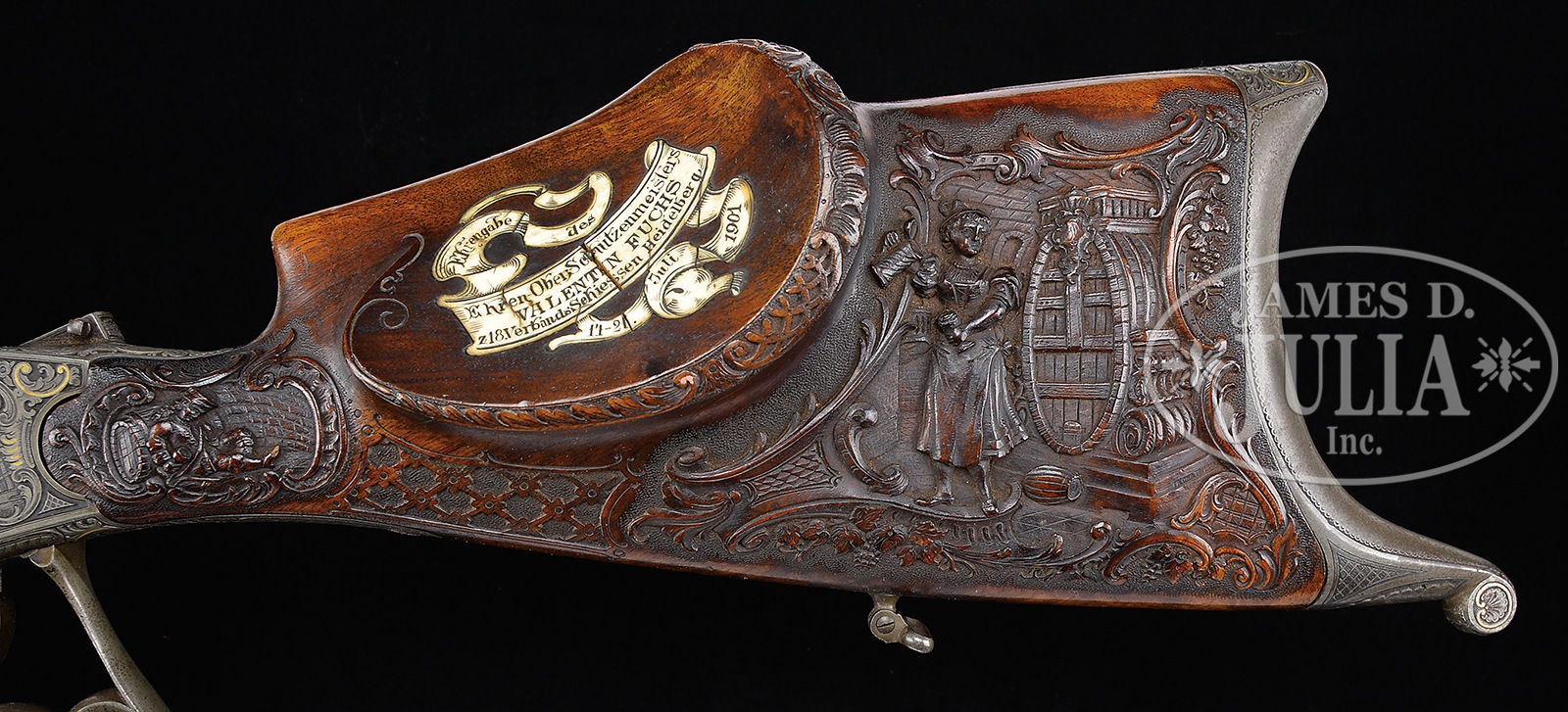 SN 908. Cal. 8.15x46R. An absolutely top-of-the-line rifle that just came out of the woodwork. Masterfully engraved and gold inlaid action showing details of what is probably the city of Heidelberg. The top of the breech block, exquisitely engraved, shows Diana the Huntress holding a bow with gold & silver inlays. The trigger guard has a fantastic Griffin inlaid in gold. The bbl is 31-1/2″ long and is fluted with a gold band at the muzzle. In ornate script on the bbl is marked “Karl Srba Buchsenmacher Heidelberg” bordered with flowers & scrolls in gold & platinum. The top flat of the bbl is fully matted. In front of the action is “2 Zuge DRGM”, on top of the action inlaid in gold is “D.R.G.M. Syst. Buchel D.R.G.M.”. The buttstock is spectacular with the left side a carving of someone passed out, leaning against a beer barrel with a cup in his hand. Behind the cheek piece is a fabulous carving of a barmaid in front of a huge cask pouring wine from a stein into a goblet. On the cheek piece, inlaid in ivory is a banner with “Ehrengabe Des Ehren-oben Schutzenmeister’s / Valentin Fuchs / Z18 Verbandz Schiessen Heidelberg / 11-21-Juli 1901”. The right side of the stock shows total coverage of a shooter standing on a hill overlooking the town and river, holding a goblet in one hand and his rifle in another with a target to his left, saluting his victory. The forearm is carved with a man drinking from a goblet who has a large key over an oval with the name “Perkeo”, undoubtedly the key to the city. Special Note: This item(s) contains plant or animal properties that may be covered by the Endangered Species Act (ESA). We have taken care to ensure that this item(s) meets the standard for sale under the ESA. However, certain states and other countries have laws that are more restrictive than the ESA. It is the bidder’s responsibility to ensure that it is lawful to purchase or transport this item(s) into their state, and to obtain the necessary import and export approvals. Delay or failure to obtain any such permit or approval does not relieve the buyer of paying for the item(s) and consummating the purchase. CONDITION: As found and probably been sitting in somebody’s attic since their father or grandfather brought it back from WWII. The bore after pushing out several hundred generations of cobwebs, etc., is excellent. All sights are missing. The screw to attach the buttstock is missing. A small gap is found near the action at the buttplate as the wood has shrunk over the years. The wood is sound with no apparent cracks or chips, which is surprising because the carving is so deep and intricate. The ivory banner on the cheek piece has a crack in the middle and we do not know if this was actually 2 pieces of ivory that were put in the stock and shrinkage has opened the gap between them. The gun needs a good overall cleaning. This rifle with correct sights and some restoration would be just spectacular. 50597-3 TWR (3,000-6,000) C&R; IVORY – Lot 2016A