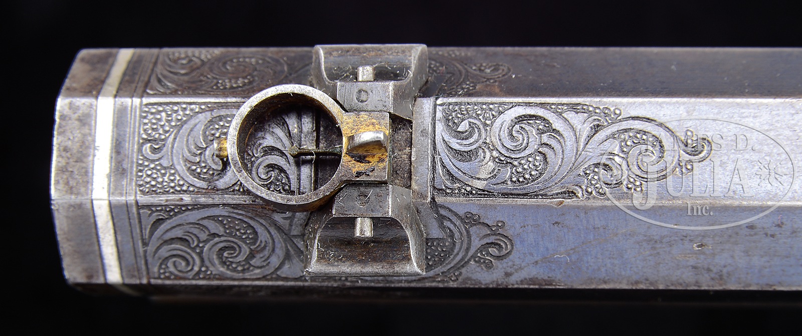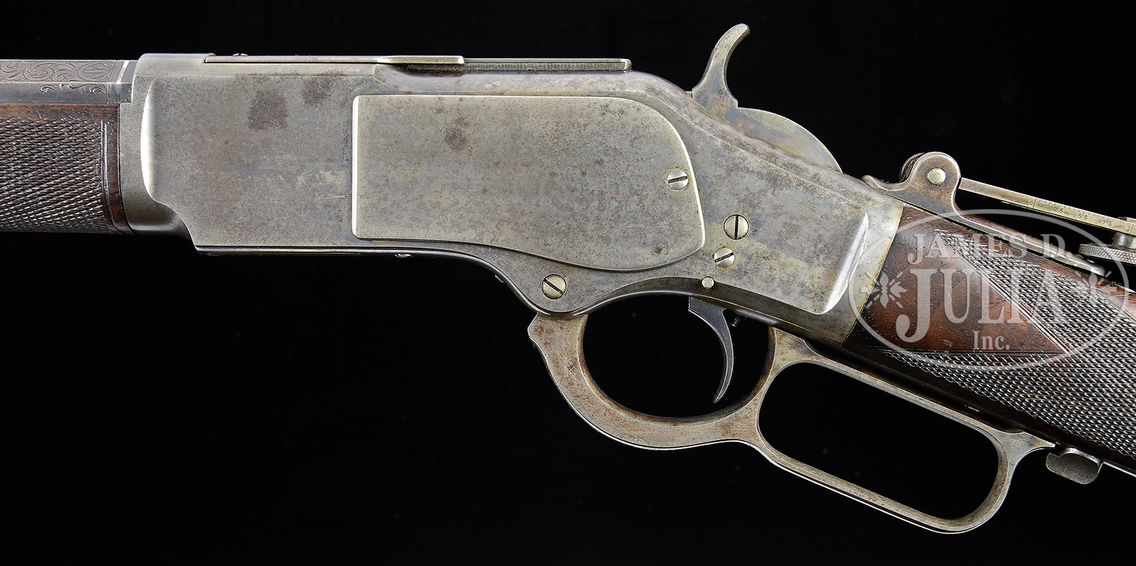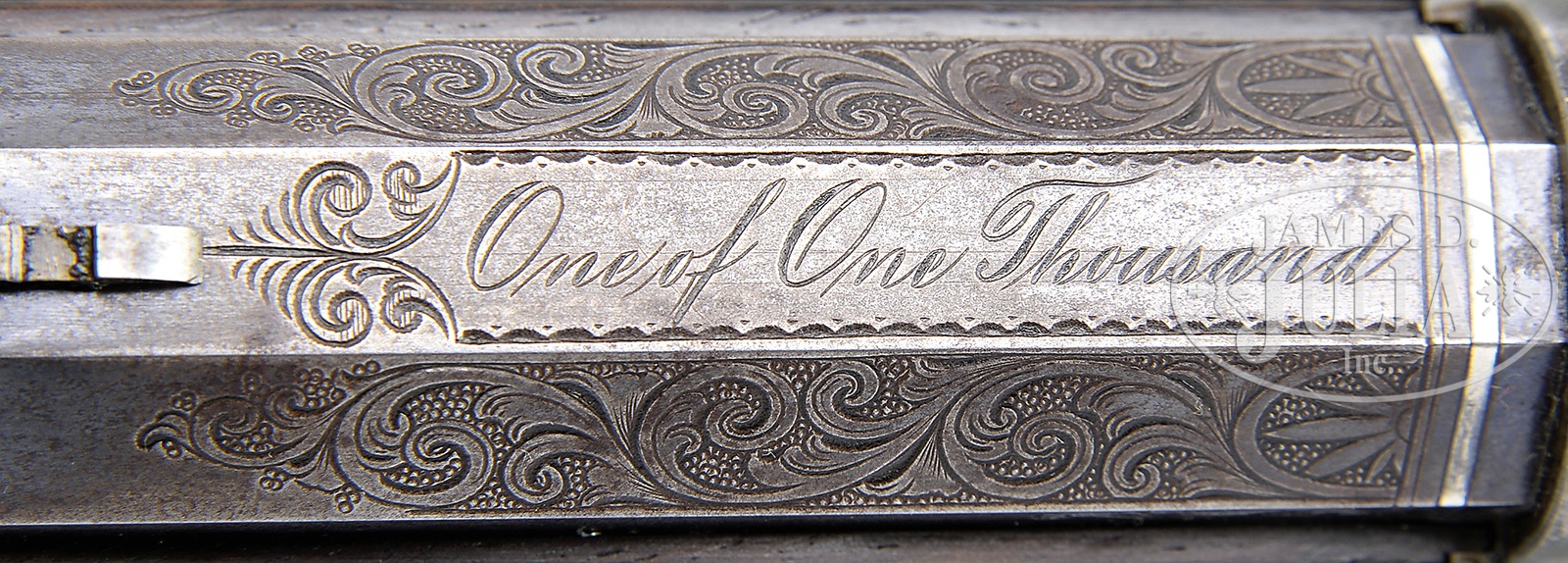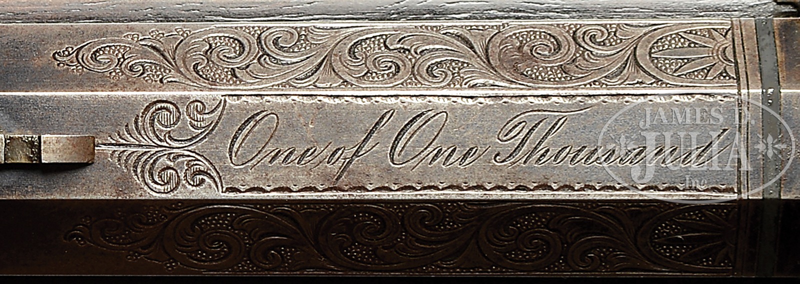 EXTREMELY RARE 1 OF 1000 WINCHESTER MODEL 1873 DELUXE LEVER ACTION RIFLE.SN 31270. Cal. 44 WCF (44-40). Rare 2nd Model rifle with 28″ oct bbl, full magazine, a gold-washed Beach’s combination front sight, early style semi-buckhorn rear sight with checkered edges & thin base sporting rear sight with 4″ staff. Mounted with 2-3 X flame grain American walnut with early style checkered forearm and straight stock with crescent buttplate that has trap containing an orig 4-pc steel & brass cleaning rod. Left side of lower tang, under the wood, is marked with the assembly number “897” and “XX”. Matching assembly number is also found in top tang channel of buttstock & inside toe of buttplate. Receiver is 2nd type with attached dust cover rail and 3rd type dust cover with impressed checkered thumbprint and has single-set trigger. Bbl is engraved over the chamber area in what is commonly accepted as 4th style with script panel “One of One Thousand”. This panel has a fine chip & dot border and an elaborate fleur-de-lis at the front end. The top side panels in the same area are very nicely engraved in foliate arabesque patterns in fine pearled background and it has a silver band at the receiver. Matching engraving patterns are found on 7 of the 8 flats around the muzzle and front sight, also with a silver band around the muzzle. Magazine tube is 1st type with screwed in plug. This rifle was the 4th Model 1873 1 of 1000 reported in 1950 during the search for such rifles by the Universal Movie Studio who produced the James Stewart film Winchester ’73. This rifle was at that time owned by Scott Merry of Tacoma, WA, who reported that he had purchased it “from an old rifleman by the name of Widum”. According to the book The Story of the Winchester 1 of 1000 and 1 of 100 Rifles, Lewis, this rifle was received in the warehouse November 14, 1878 along with 5 other consequentially number 1 of 1000 rifles and shipped November 20, 1878 to order number 13488. The same order also contained 3 Winchester Model 1876 1 of 1000 rifles. Remarks on two of the 1876 rifles states “returned by Skinker 5/1881”. John Skinker was Winchester’s West Coast agent based in San Francisco. It is well documented that he ordered a large number of the 1 of 1000 rifles, both 1873 & 1876 and later sold them at a discount when sales lagged. It can be stated with almost certainty that this rifle was one of the “Skinker” rifles which lends credibility to it having surfaced in Washington State. PROVENANCE: Scott Merry Collection; Robert Watt Collection; Paul Tudor Jones II Collection. CONDITION: Fine, all matching. Bbl retains about 88-90% strong orig blue with sharp edge wear and some minor flaking which areas show as a brown patina. Magazine tube retains blue in the sheltered areas being an overall plummy/brown patina. Receiver and sideplates retain faded case colors, stronger on right sideplate and in sheltered areas, being mostly a mottled silver/grey patina. Hammer retains strong case colors, faded on top edge. Lever retains traces of case colors being mostly a silver patina. Buttplate is a mottled silver/grey patina. Stock has a couple of tiny hairlines back of the top tang, otherwise wood is sound with normal handling and use marks with the buttstock showing light to moderate diamond point wear and retains most of its orig oil finish. Forearm is sound showing moderate to heavy wear on the checkering and is a hand worn patina. Mechanics are fine. Strong bright bore with scattered light pitting. 49941-3 JR68 (175,000-275,000) – Lot 2017 | Click here to view provenance