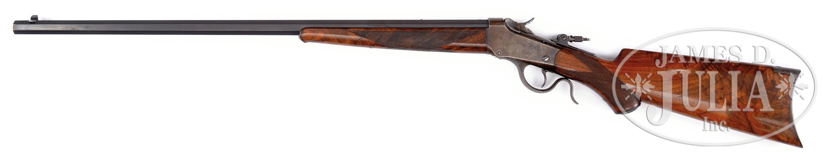 *DELUXE WINCHESTER LOW WALL.SN 95073. Cal. 22LR. Rarely found Low Wall Deluxe with a 26″ full oct bbl, No. 1 weight. The front sight is a simple blade and a Lyman tang sight is fitted on the upper tang of the action. The action was originally blued and fitted with a single trigger. The buttstock is checkered as is pistol grip and grip cap in fancy wood. A rifle buttplate is fitted. The forearm has an ebony insert, is checkered and has deluxe wood matching that of the buttstock. CONDITION: The bbl has 2 screws on the top flat, probably for an unidentified sight. The blue is thinning and the sharp edges are shiny. The bore is surprisingly good for the caliber. The action, originally blued, has just traces left. The forearm checkering is worn and shows a few small dings & dents with no obvious chips or cracks. The finish on the buttstock is excellent with numerous very small handling marks. Overall a good example of a hard to find rifle. 50993-1 (2,500-4,500) C&R – Lot 2017