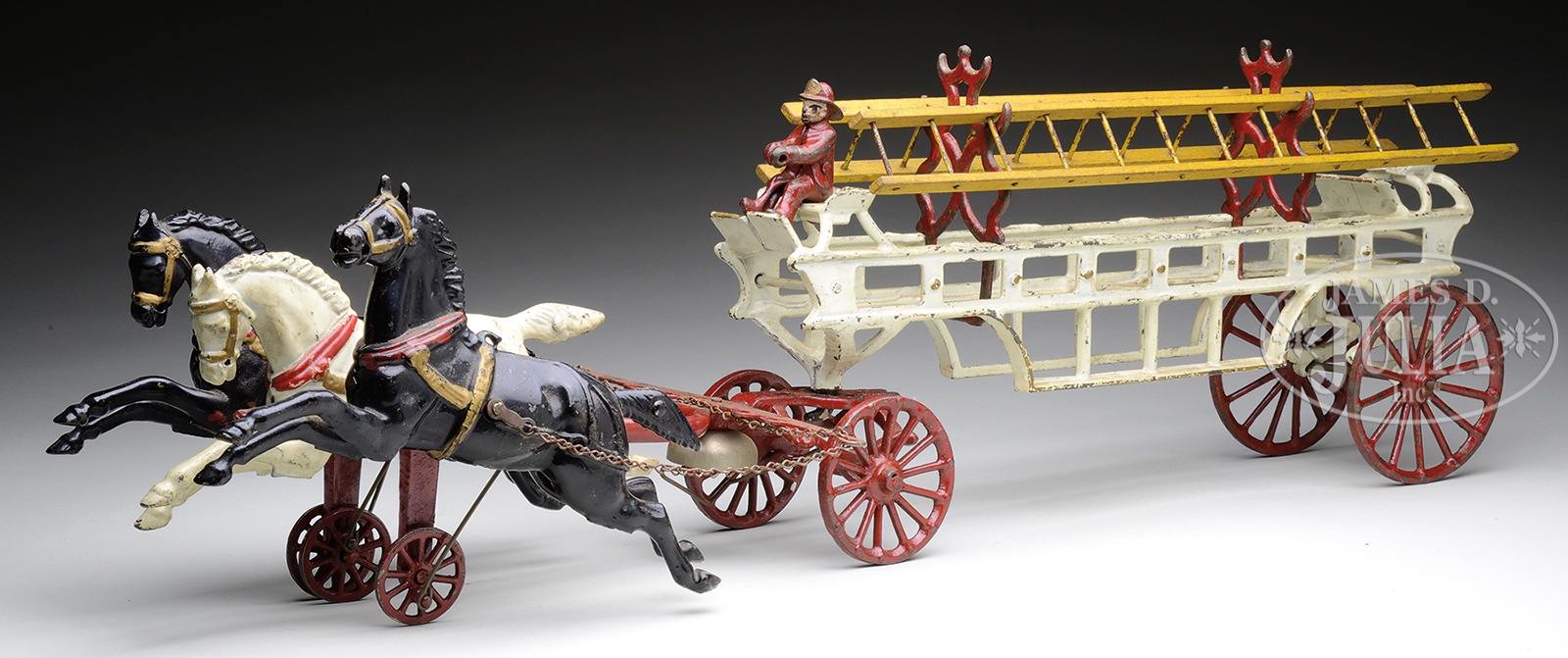 Please Note: The photo shows the wagon with only the driver. We do have the correct rear rider which will be included with this lot. 27-1/2″ CAST IRON DENT 3-HORSE LADDER TRUCK.Manufactured by Dent Hardware circa 1900/1910, this classic mainstay toy manufactured by various companies depicts three horses galloping down the street in a hurry to the house fire. Fireman seated front & rear (lacking rear fireman). Toy retains its original chains on horses, ladder hangers as well as ladders, and the paint overall is original in very good to fine condition with most noticeable paint loss to tin whiffle on horse’s yoke. SIZE: 27-1/2″ l. PROVENANCE: From the Laurence Hapgood Estate. CONDITION: No damage to iron castings. One ladder has split to wooden rail. 49003-17 (350-650) – Lot 2018 Auction: Advertising, Toy & Doll - Spring 2015 Please Note: All prices include the hammer price plus the buyer’s premium, which is paid by the buyer as part of the purchase price. The prices noted here after the auction are considered unofficial and do not become official until after the 46th day. |