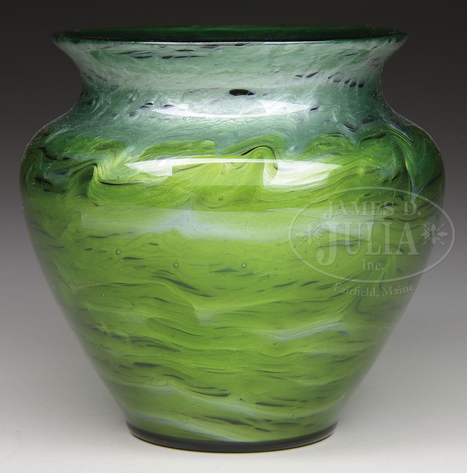 LOETZ TITANIA VASE.Loetz Titania vase has swirling green body shading to silvery blue at the neck and lip. Vase has rounded shoulders and slightly flaring neck. Unsigned. SIZE: 5-3/4″ t. CONDITION: Very good to excellent with one open bubble on inside of the neck (from the making). 5-69212 (2,000-3,000) – Lot 2019