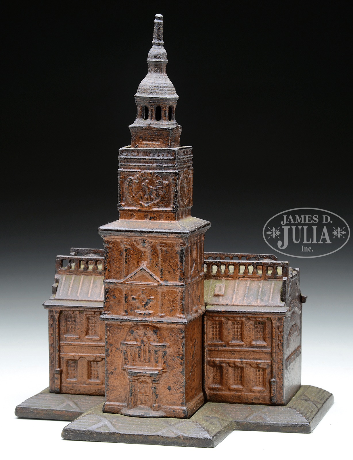 SMALL INDEPENDENCE HALL BANK.Manufactured by Enterprise Manufacturing Co. of Philadelphia, PA in 1875 this still bank depicts Independence Hall. A classic and great savings bank for the child. A copper/gold finish applied to the iron castings. SIZE: 6-1/2″ w x 6″ d. PROVENANCE: From the Laurence Hapgood Estate. CONDITION: Overall fair to good. Damage/loss to widow’s walk on roof. 49003-26 (100-200) – Lot 2019 Auction: Advertising, Toy & Doll - Spring 2015 Please Note: All prices include the hammer price plus the buyer’s premium, which is paid by the buyer as part of the purchase price. The prices noted here after the auction are considered unofficial and do not become official until after the 46th day. |